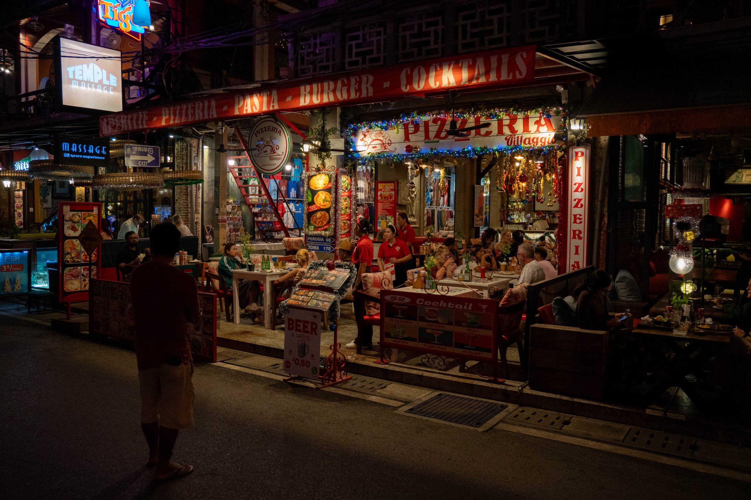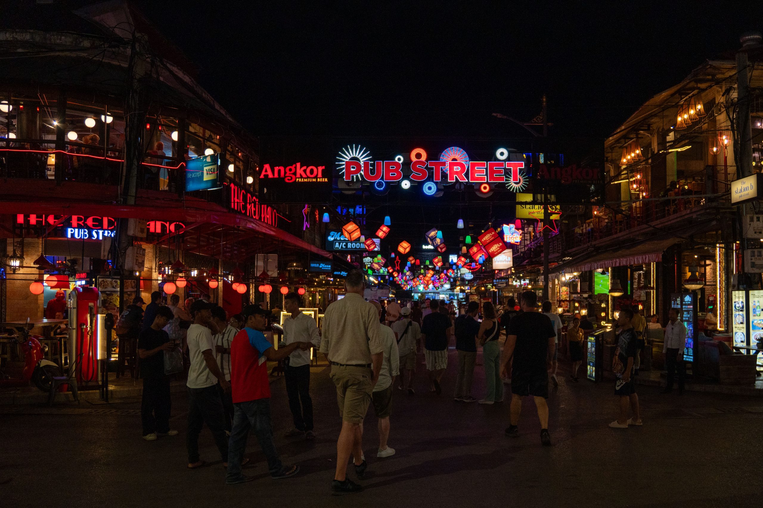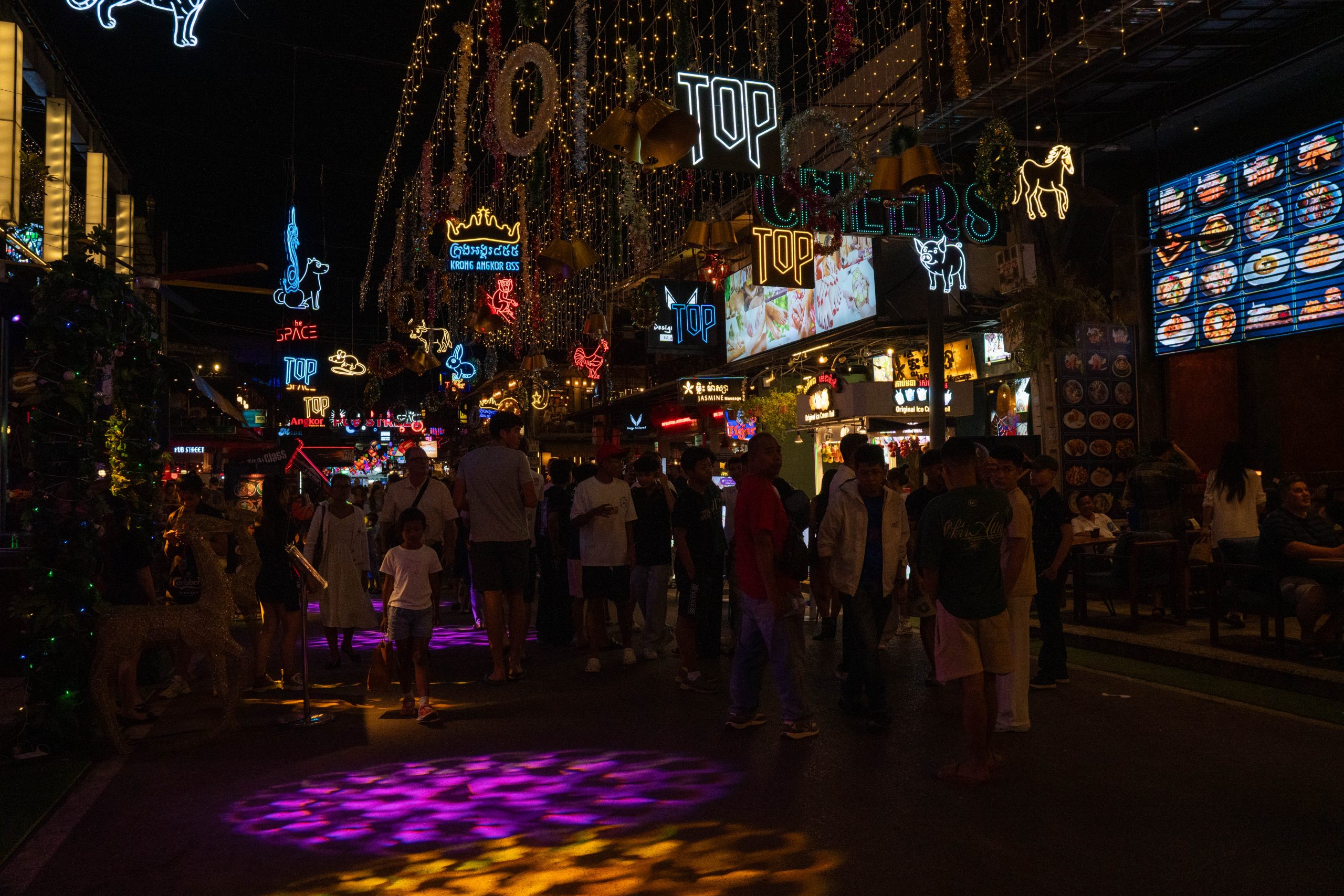 Am Abend konnte ich erste Eindrücke von Siem Reap sammeln. Dort, wo ich wohnte, gab es kaum Touristen. Ich bekam mein Abendessen in einer kleinen Cafeteria serviert, wo die Damen Rindfleisch von einem Knochen sägten. Dann fuhr ich in das Zentrum der Stadt. Dort zeichnete sich ein anderes Bild. Eine bunte, laute Flaniermeile namens Pub Street erschreckte mich schon von weitem. Die Musik war viel zu laut, um noch klare Gedanken zu fassen. Bunte Lichter, Souvenirstände und Dutzende Kellnerinnen und Kellner, die mit ihren Menüs winkten. Zwischen Fußmassage-Fischtanks und Boxautomaten saß ganz verloren eine kleine Musikergruppe. Den meisten Instrumentalisten fehlten die Beine. Sie spielten traditionelle kambodschanische Musik, die vom westlichen Clubtechno verschluckt wurde.