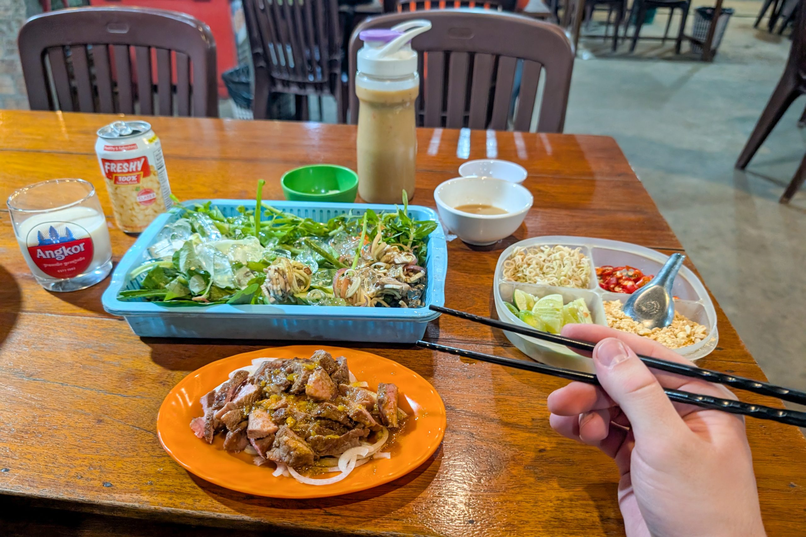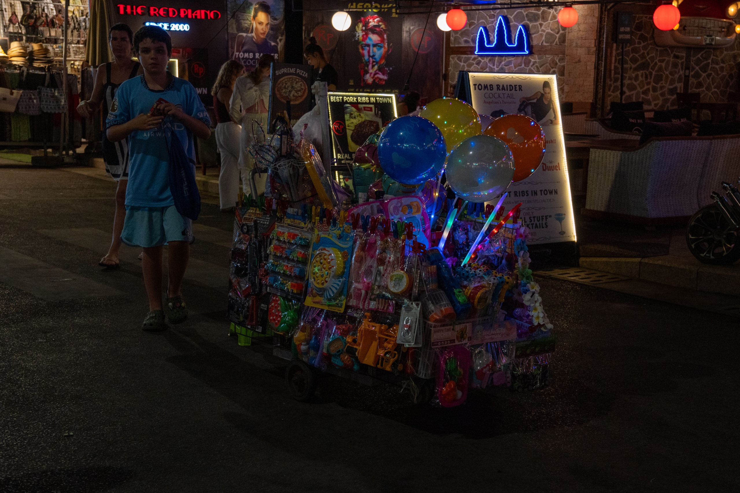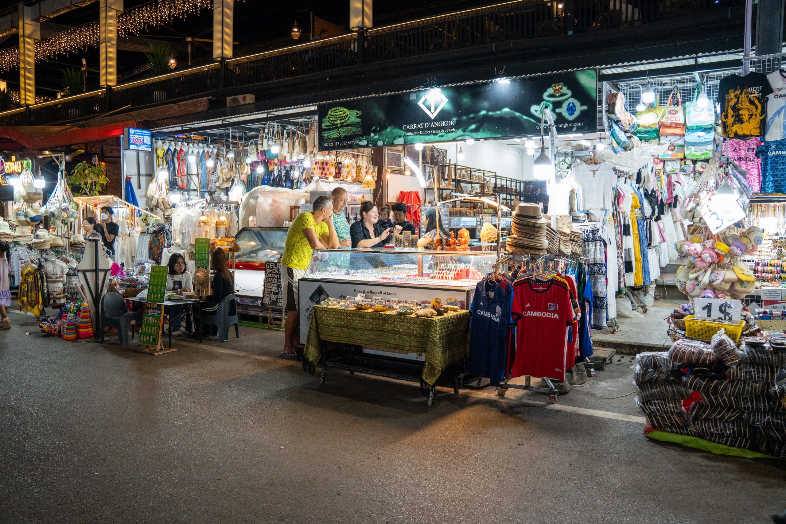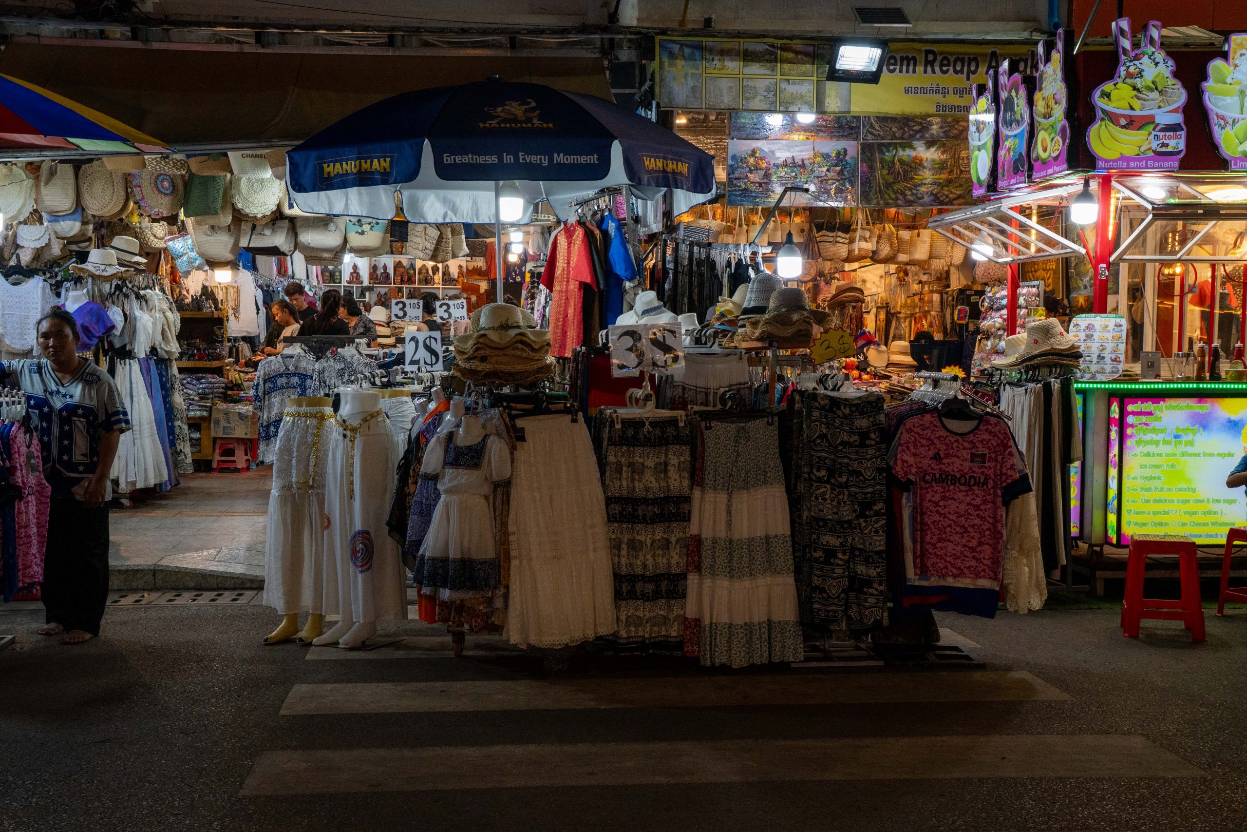 Am Abend konnte ich erste Eindrücke von Siem Reap sammeln. Dort, wo ich wohnte, gab es kaum Touristen. Ich bekam mein Abendessen in einer kleinen Cafeteria serviert, wo die Damen Rindfleisch von einem Knochen sägten. Dann fuhr ich in das Zentrum der Stadt. Dort zeichnete sich ein anderes Bild. Eine bunte, laute Flaniermeile namens Pub Street erschreckte mich schon von weitem. Die Musik war viel zu laut, um noch klare Gedanken zu fassen. Bunte Lichter, Souvenirstände und Dutzende Kellnerinnen und Kellner, die mit ihren Menüs winkten. Zwischen Fußmassage-Fischtanks und Boxautomaten saß ganz verloren eine kleine Musikergruppe. Den meisten Instrumentalisten fehlten die Beine. Sie spielten traditionelle kambodschanische Musik, die vom westlichen Clubtechno verschluckt wurde.