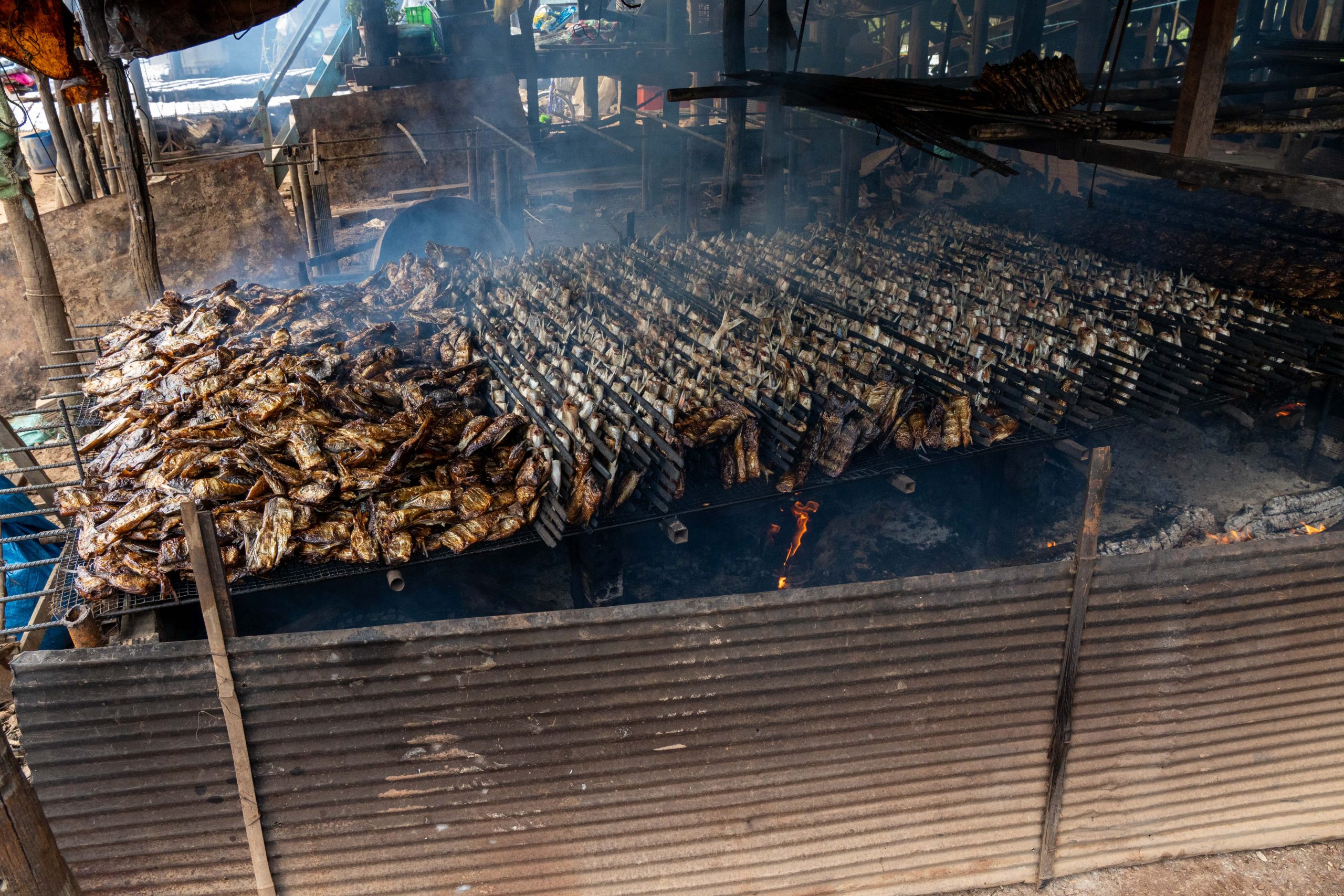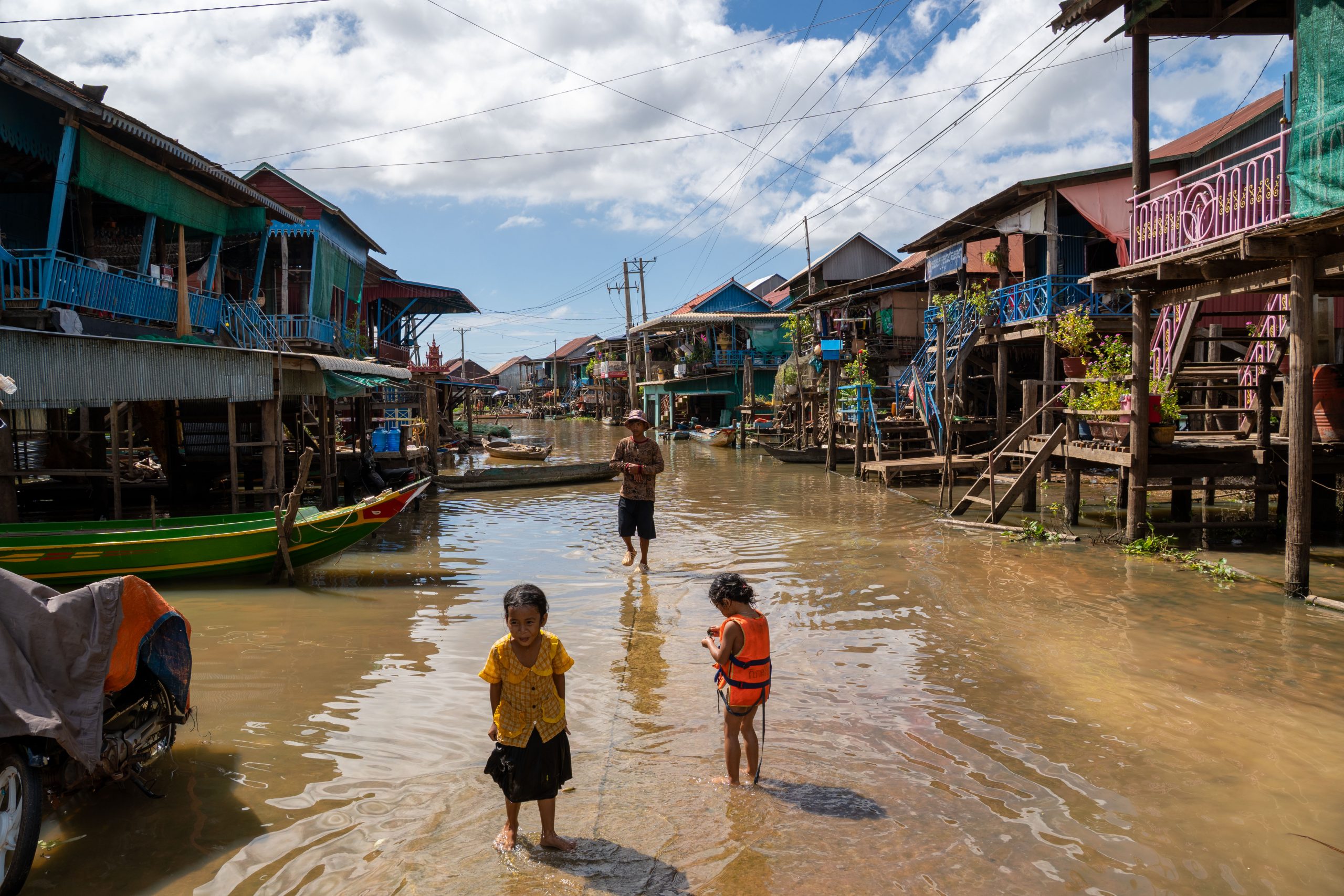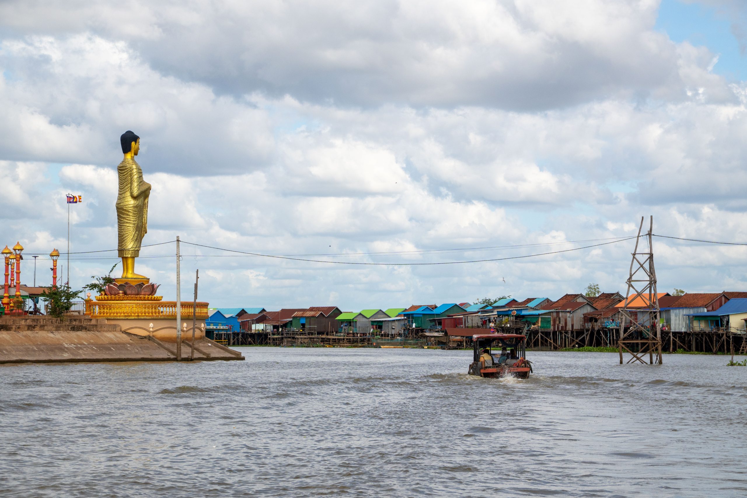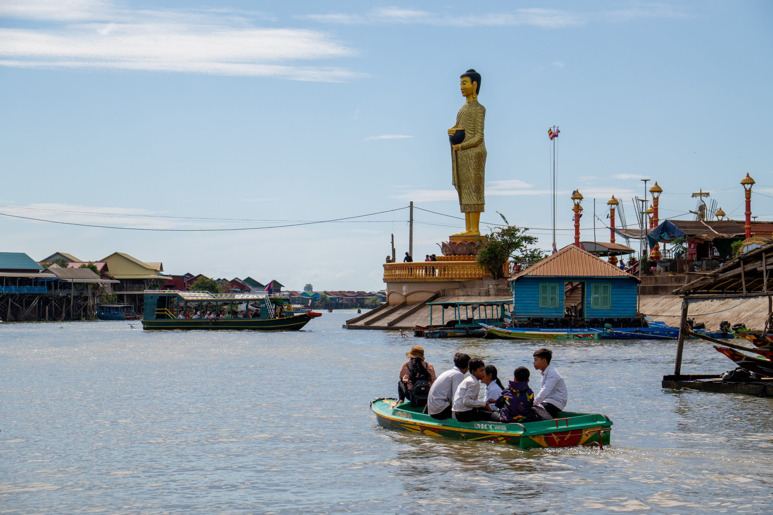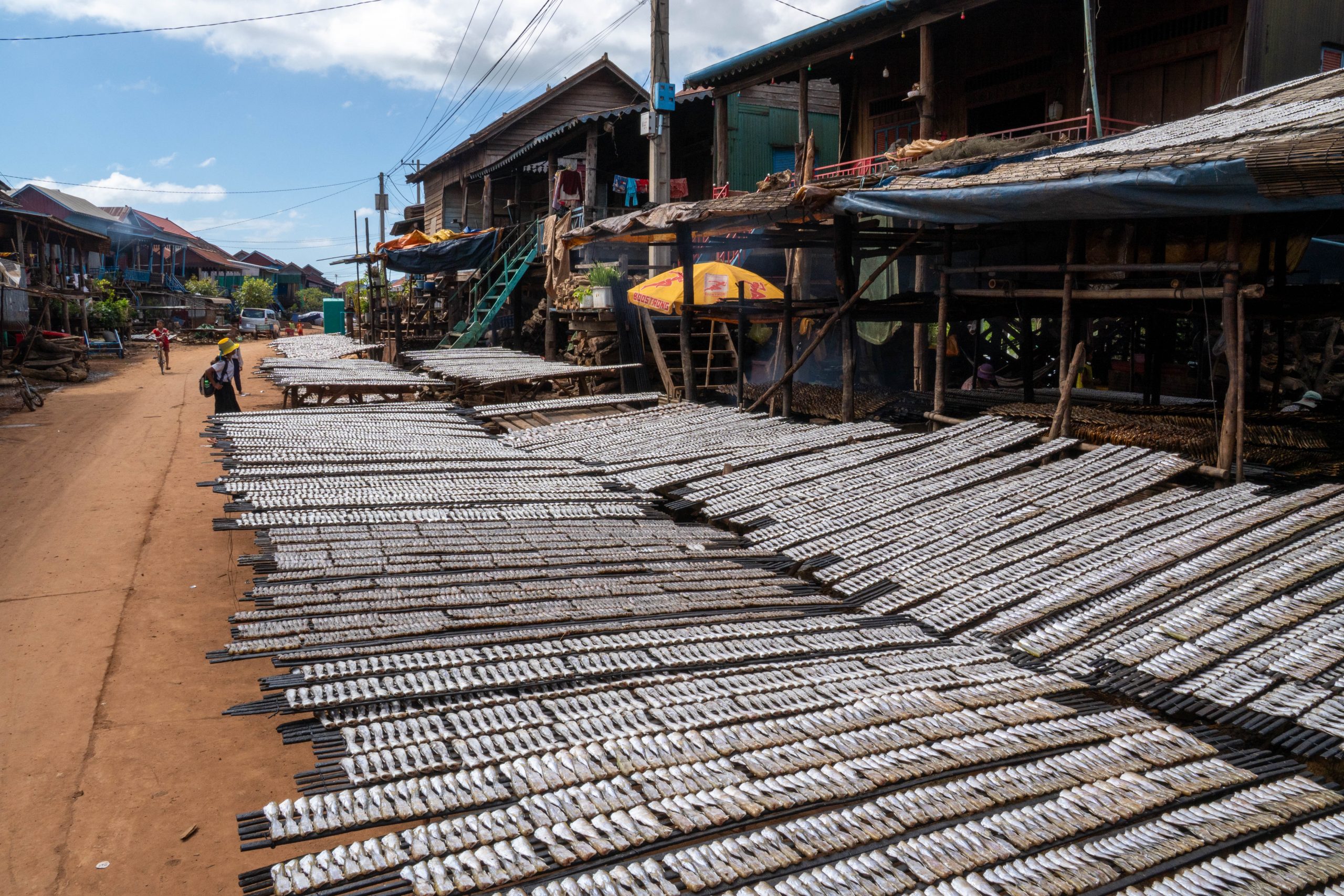 Der Tonle Sap ist der größte See Südostasiens. Zur Regenzeit ist er rund 10.400 Quadratkilometer weit. Während der nun herrschenden Trockenzeit verringert sich die Fläche auf ein Drittel der Größe. Übrigens kann man hier ein einzigartiges Naturschauspiel beobachten. Der Abfluss des Tonle Sap in den Mekong wechselt jedes Jahr im Juni für einige Wochen seine Flussrichtung – immer dann, wenn der Mekong nach Taifunregenfällen und Schmelzwasserabfluss aus dem Himalaya anschwillt. Einen solchen Richtungswechsel findet man sonst nirgendwo bei einem Fluss dieser Größe. Zu jeder Jahreszeit ist der Tonle Sap für seinen Fischreichtum bekannt. Und so fuhr ich nun mit dem Motorroller in ein Fischerdorf, weit abgelegen von den touristisch überlaufenen Dörfern nahe Siem Reap. Mein Ziel war der Ort Kompong Khleang. Nach fast zwei Stunden Fahrt erreichte ich einen Damm, der in den See führte. Links und rechts lagen Fischerhäuser auf Stelzen, die so hoch waren, dass die Häuser auch bei Flut über Wasser blieben. Vor den Häusern trockneten Fische in der Sonne oder über dem Feuer, und einige Frauen kochten Wasserschnecken. Die Straße duckte sich nach wenigen hundert Metern in die Fluten des wasserreichen Sees. Je später die Trockenzeit, desto größere Teile des Dorfes kann man erreichen. Doch noch standen bestimmt neunzig Prozent der Häuser im Wasser. Ich musste auf ein Boot umsteigen. Für 25 Dollar schipperte mich ein Kapitän durch das Dorf, auf einem Schiff, das sicher 30 Menschen fassen könnte. Ich sah Häuser und Boote an mir vorbeiziehen. Dann fuhren wir durch einen Mangrovenwald und vorbei an Fischernetzen. Nach rund einer Stunde erreichten wir den offenen See. Man kann das Ufer nicht sehen, und so fühlt es sich an, als blicke man auf einen Ozean. Auf dem Rückweg legte der Kapitän am Marktplatz an und ich konnte das Zentrum des Ortes zu Fuß erkunden. Hier, auf der augenscheinlich einzigen Insel, drängten sich einige Tempel und die lokale Schule nebeneinander. Ansonsten besteht der Ort aus hunderten Häusern, die nur mit dem Boot erreicht werden können. Besonders ortskundige Menschen fahren manchmal auch mit dem Scooter durch die überflutete Landschaft, aber da muss man sehr genau wissen, an welchen Stellen die Straße nicht zu tief unter Wasser liegt.