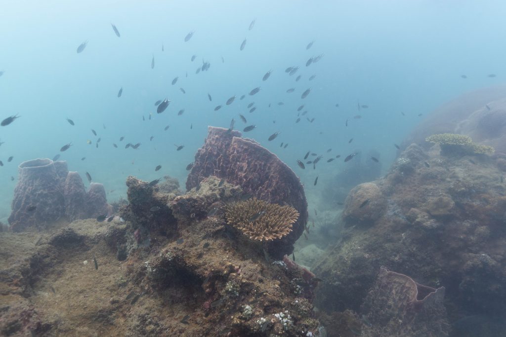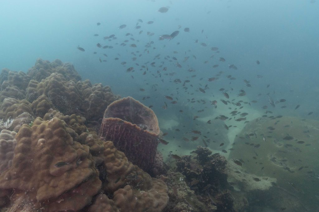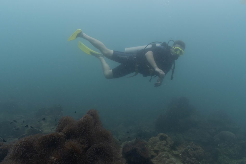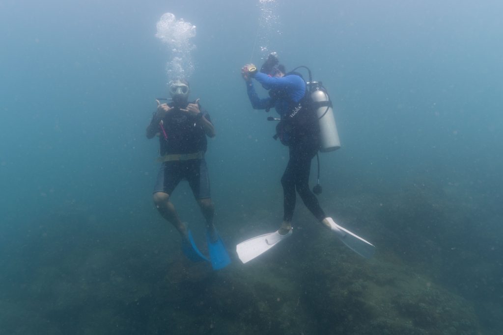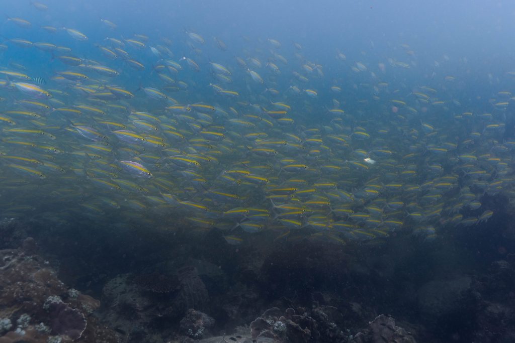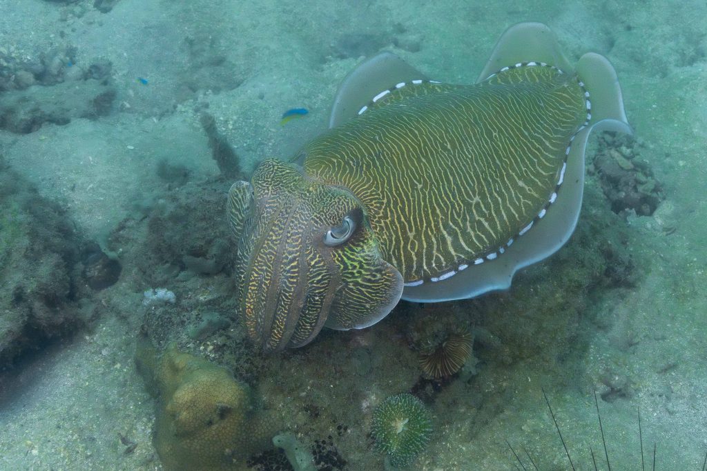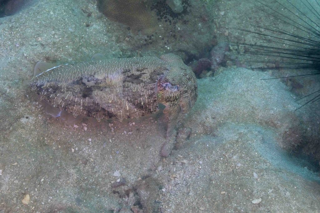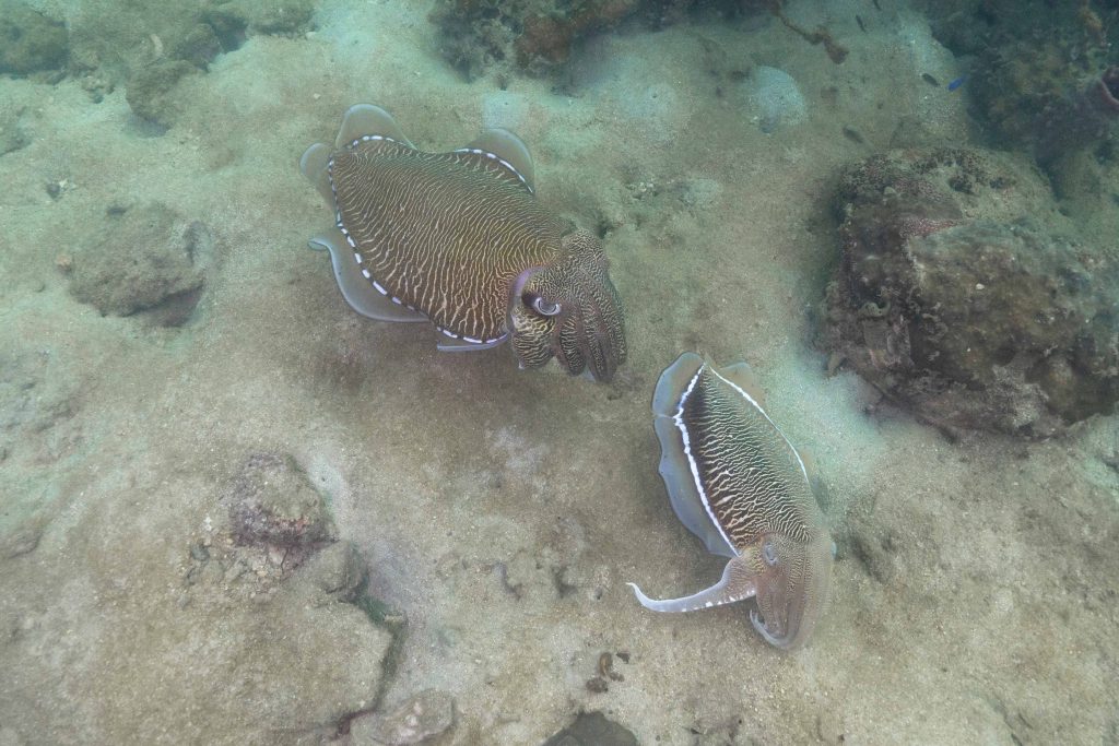 Am nächsten Morgen sah ich vertraute Gesichter. Ein Holzboot hatte angelegt. Und darauf war die altbekannte Tauchcrew versammelt. Sie hatten es mir schon mitgeteilt. Der Sturm auf der Nordseite zwang sie, heute im Süden zu tauchen, und ich wollte mich anschließen. Noch einmal ins Wasser, darauf freute ich mich. Die Sicht auf der Südseite war noch schlechter als im Norden. Heute waren wir eine recht große Gruppe von fünf Leuten, und wir mussten uns bemühen, uns nicht zu verlieren. Oft sah ich die anderen Taucher nur noch schemenhaft. Aber auch hier war die Unterwasserwelt spannend. Wir sahen zwei Tintenfische, die sich minutenlang beobachten ließen. Es war ein schöner Tag.