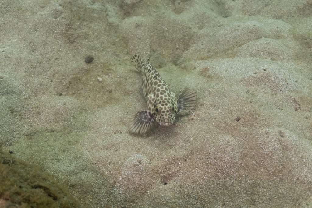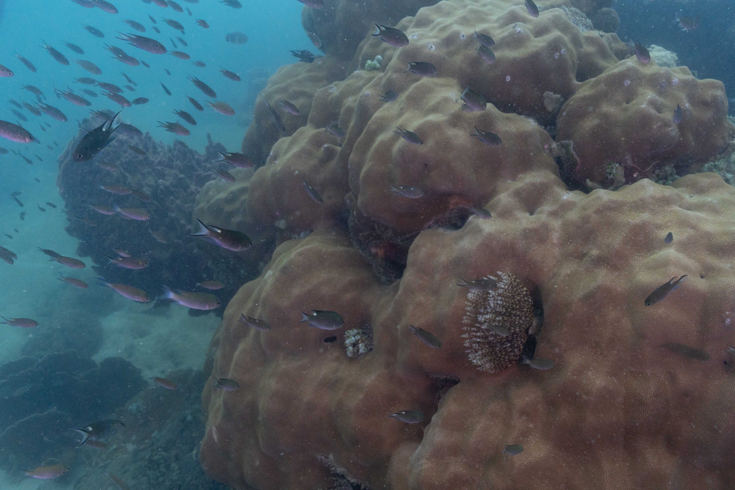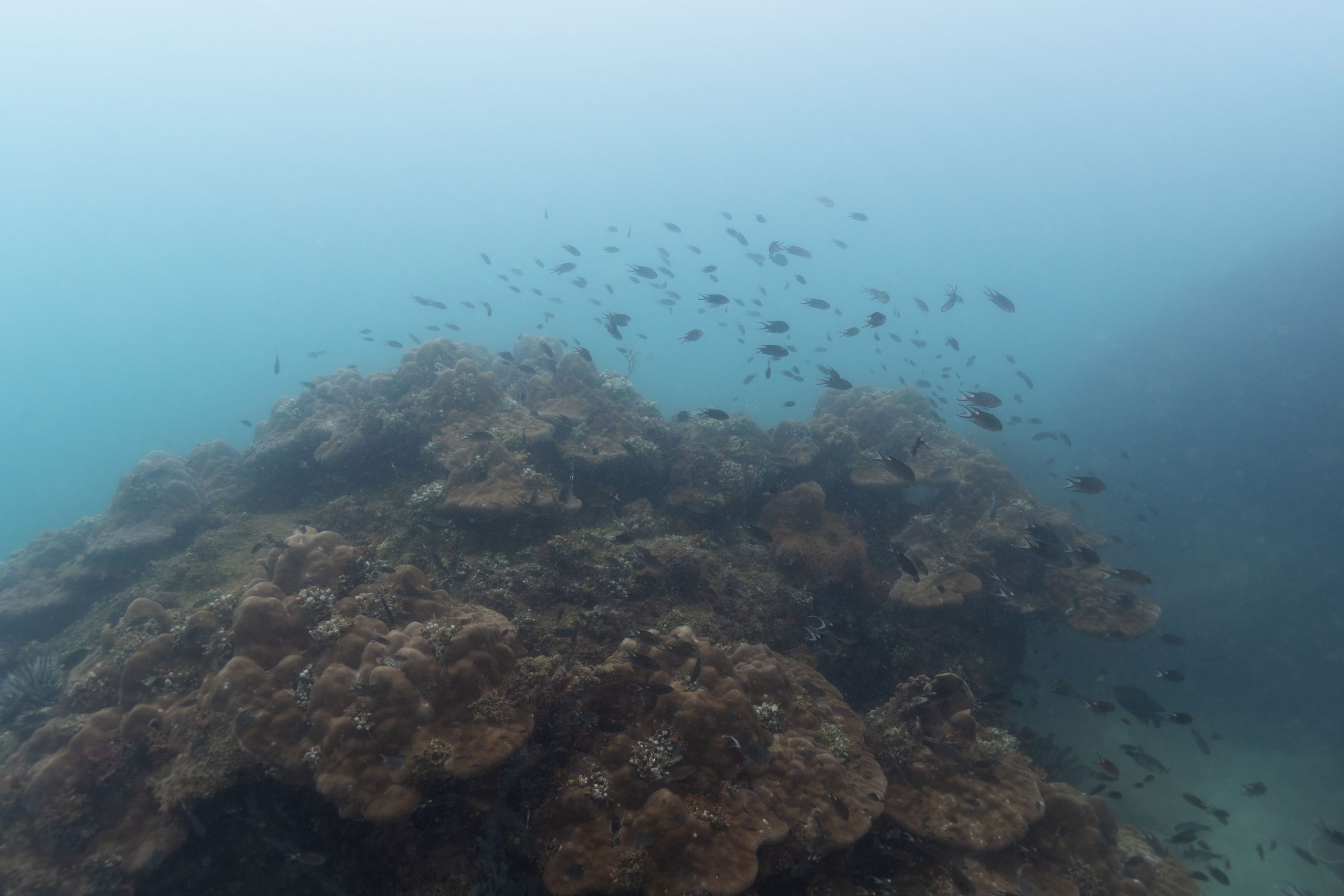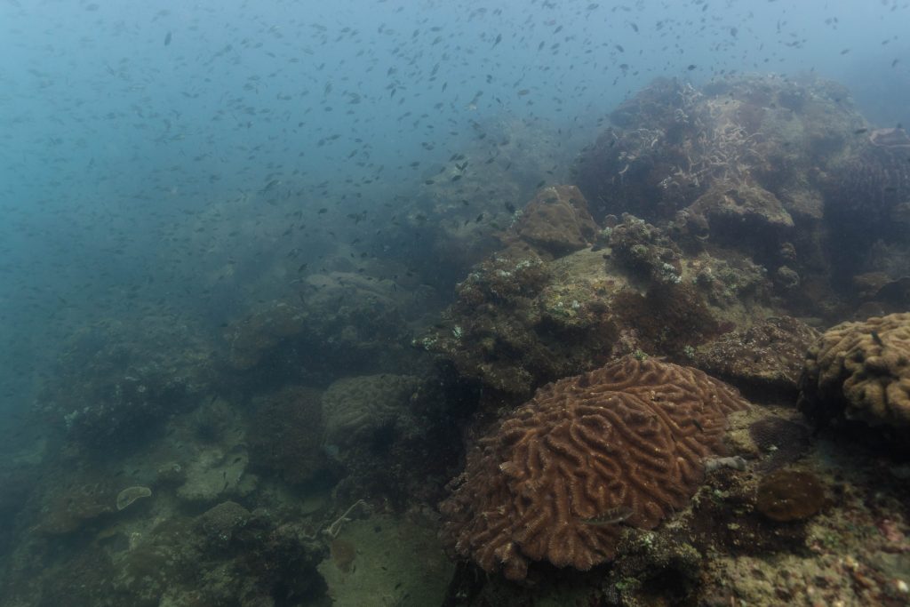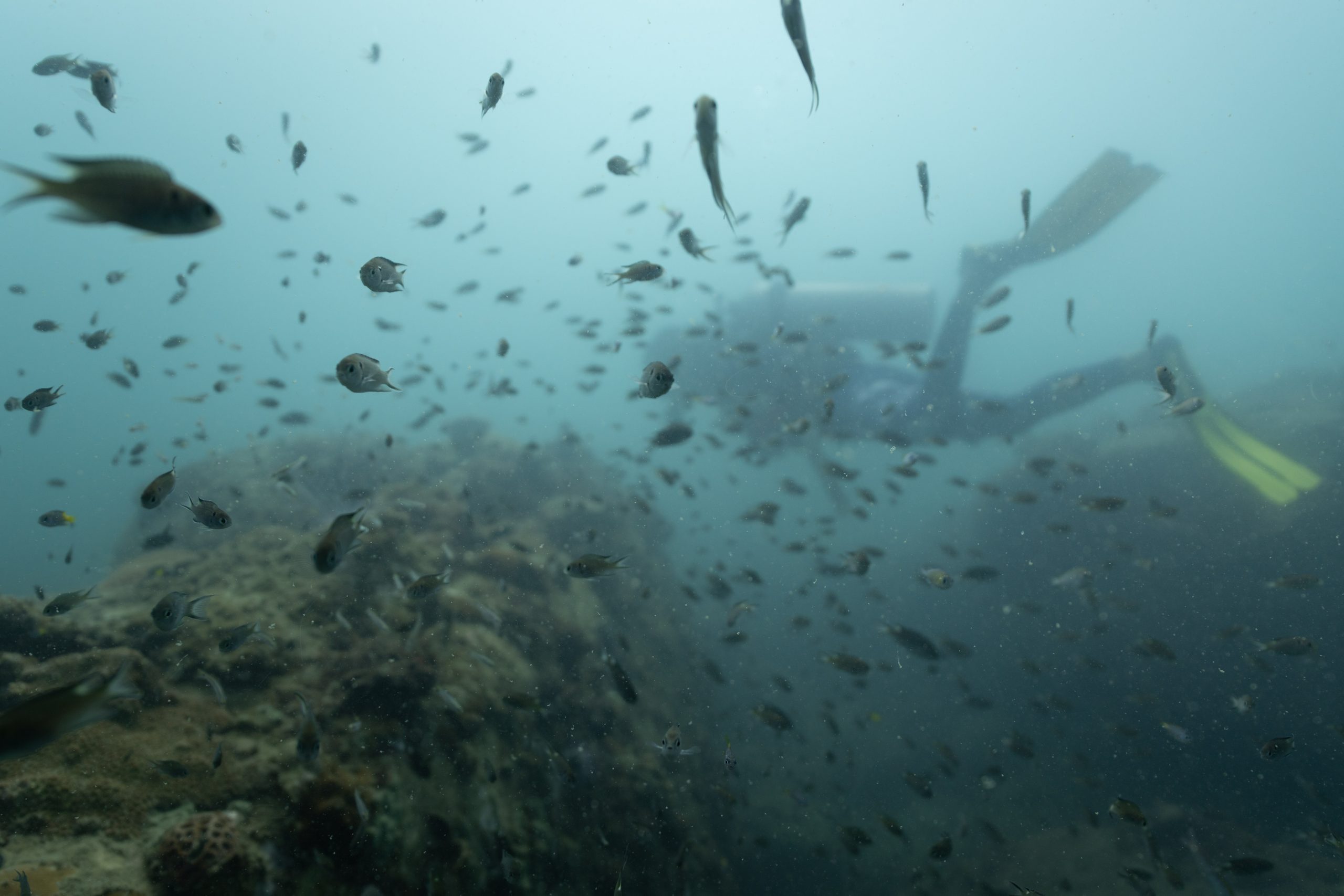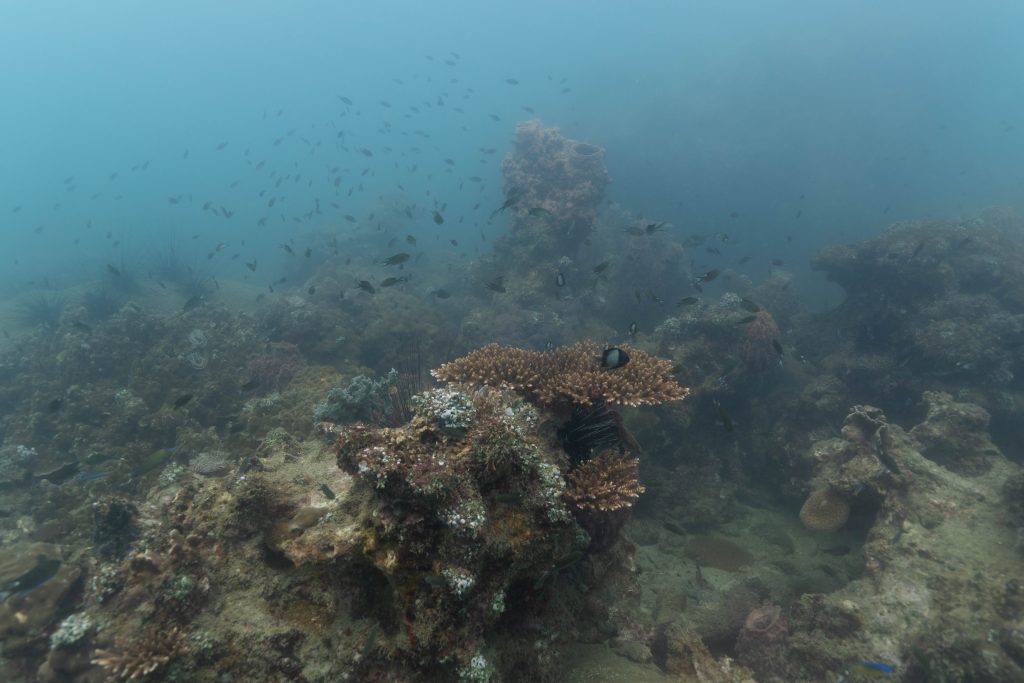 Am nächsten Morgen sah ich vertraute Gesichter. Ein Holzboot hatte angelegt. Und darauf war die altbekannte Tauchcrew versammelt. Sie hatten es mir schon mitgeteilt. Der Sturm auf der Nordseite zwang sie, heute im Süden zu tauchen, und ich wollte mich anschließen. Noch einmal ins Wasser, darauf freute ich mich. Die Sicht auf der Südseite war noch schlechter als im Norden. Heute waren wir eine recht große Gruppe von fünf Leuten, und wir mussten uns bemühen, uns nicht zu verlieren. Oft sah ich die anderen Taucher nur noch schemenhaft. Aber auch hier war die Unterwasserwelt spannend. Wir sahen zwei Tintenfische, die sich minutenlang beobachten ließen. Es war ein schöner Tag.