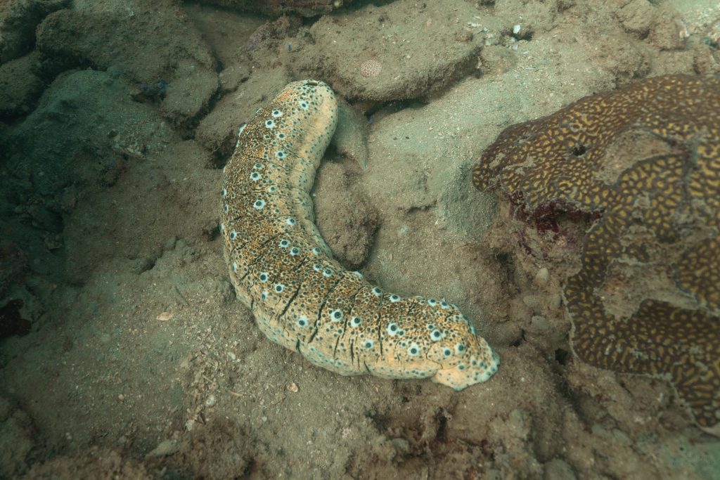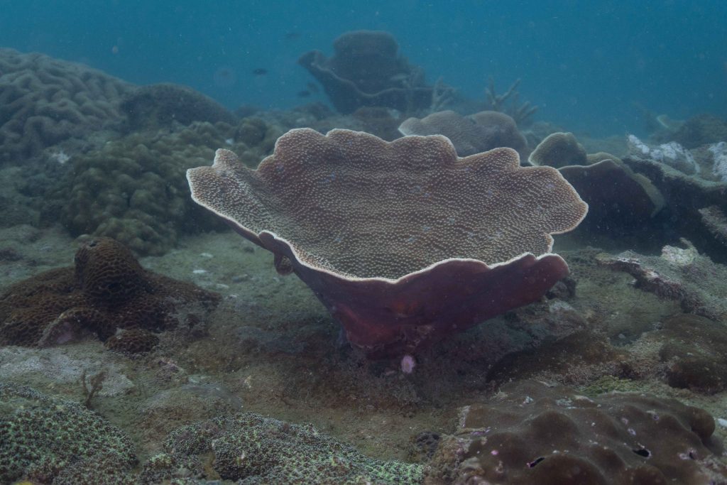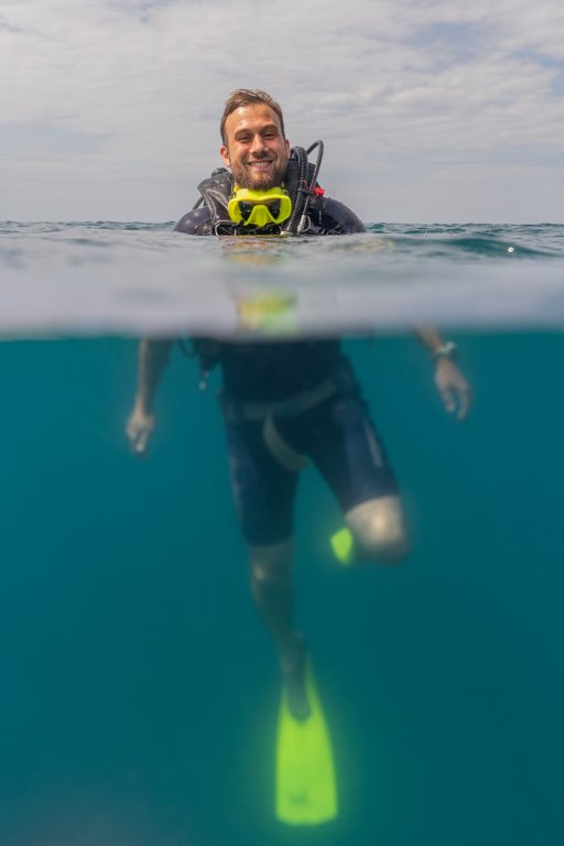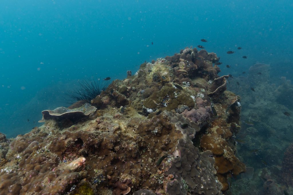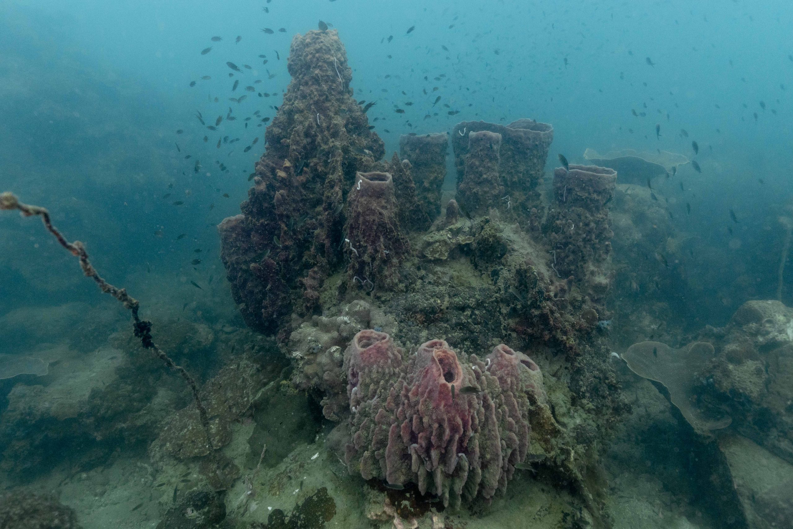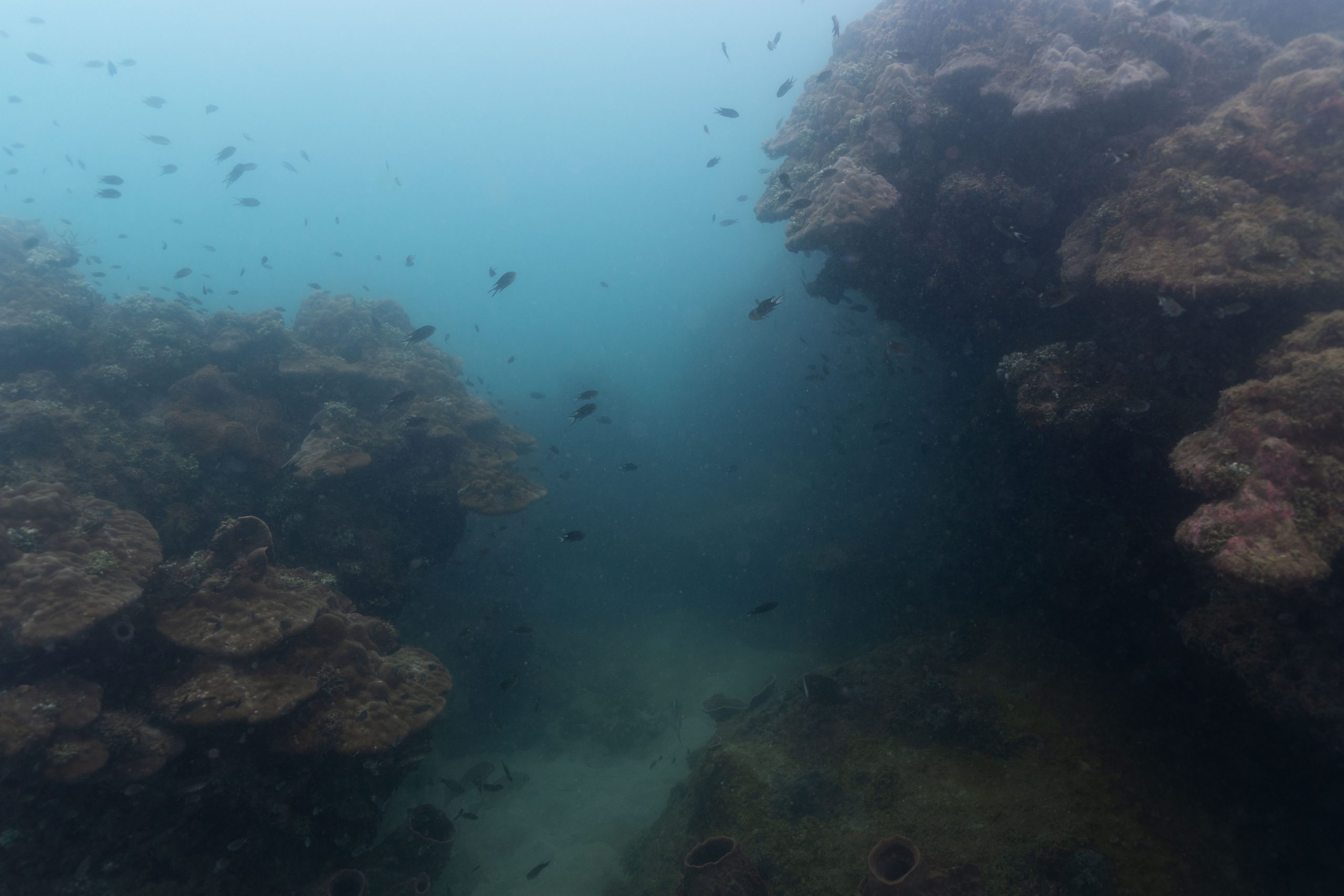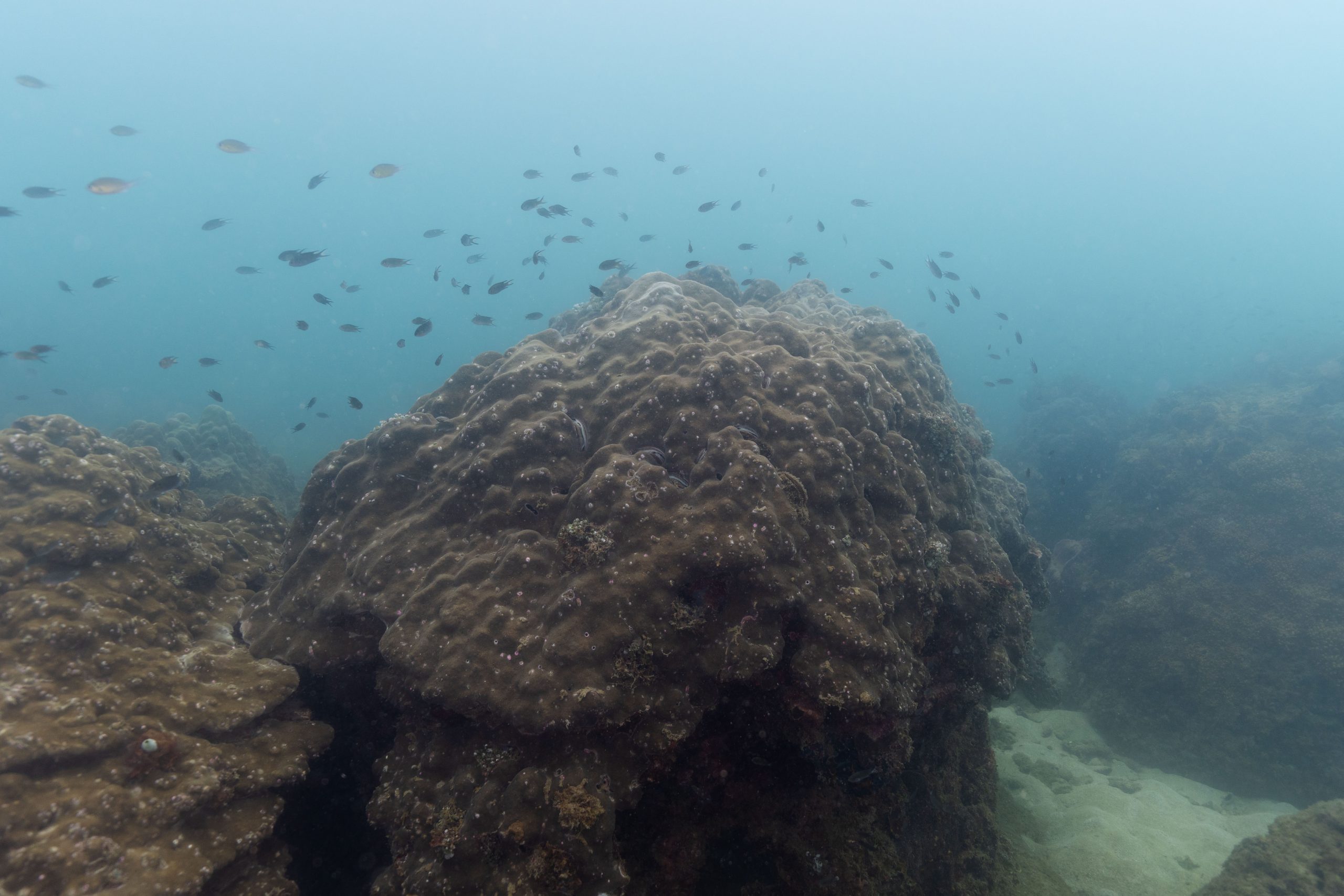 Am nächsten Morgen sah ich vertraute Gesichter. Ein Holzboot hatte angelegt. Und darauf war die altbekannte Tauchcrew versammelt. Sie hatten es mir schon mitgeteilt. Der Sturm auf der Nordseite zwang sie, heute im Süden zu tauchen, und ich wollte mich anschließen. Noch einmal ins Wasser, darauf freute ich mich. Die Sicht auf der Südseite war noch schlechter als im Norden. Heute waren wir eine recht große Gruppe von fünf Leuten, und wir mussten uns bemühen, uns nicht zu verlieren. Oft sah ich die anderen Taucher nur noch schemenhaft. Aber auch hier war die Unterwasserwelt spannend. Wir sahen zwei Tintenfische, die sich minutenlang beobachten ließen. Es war ein schöner Tag.