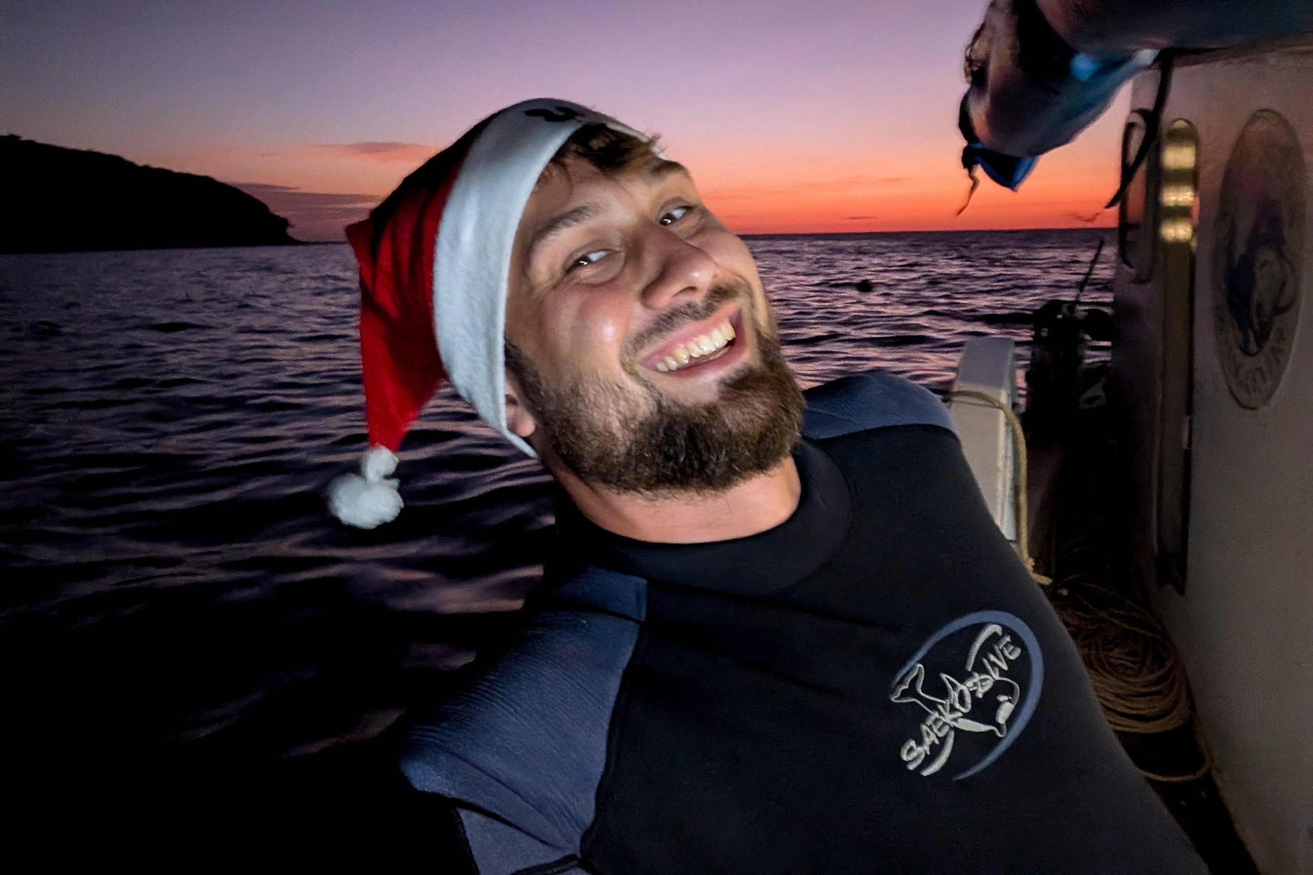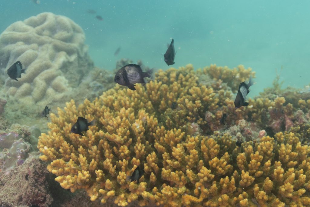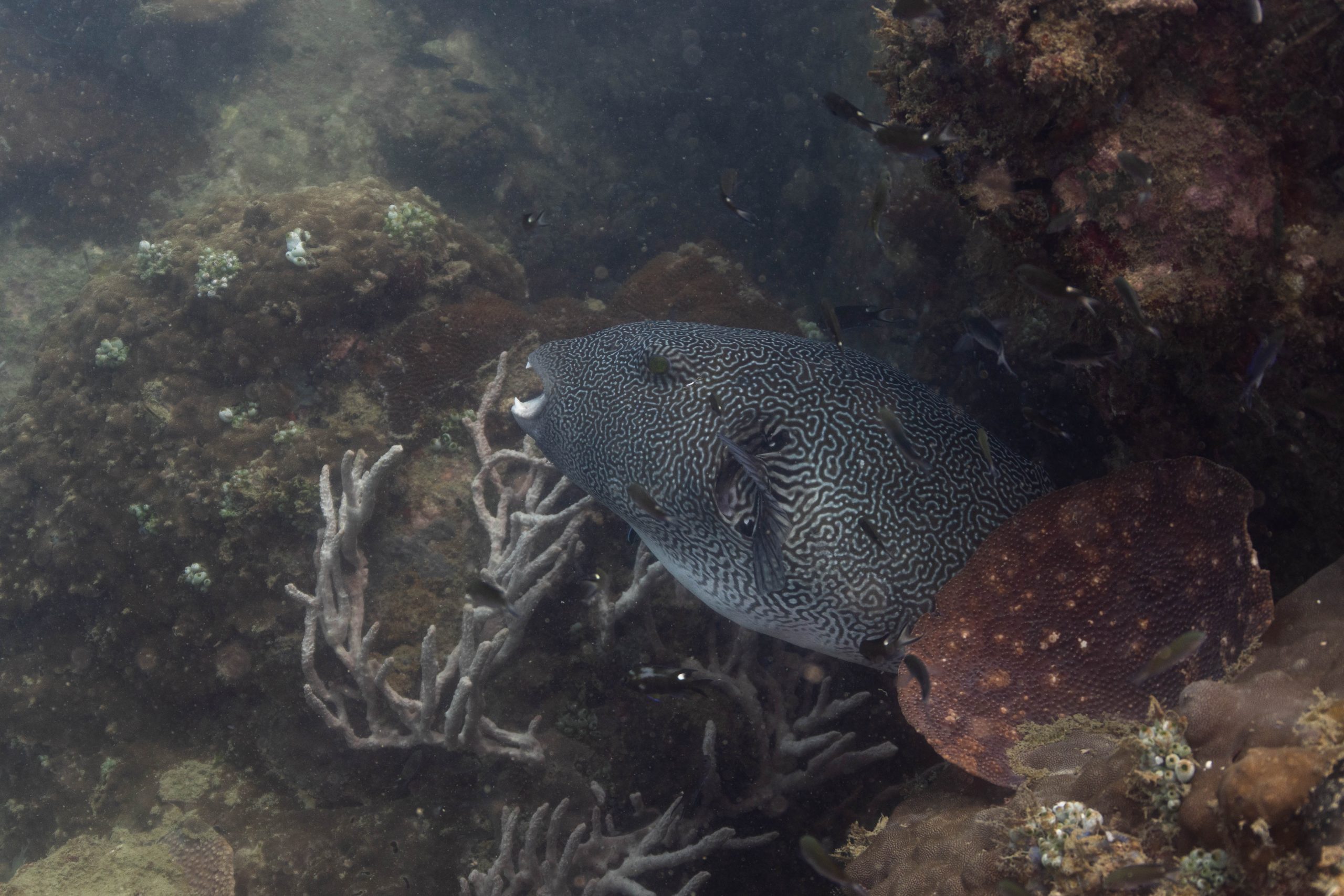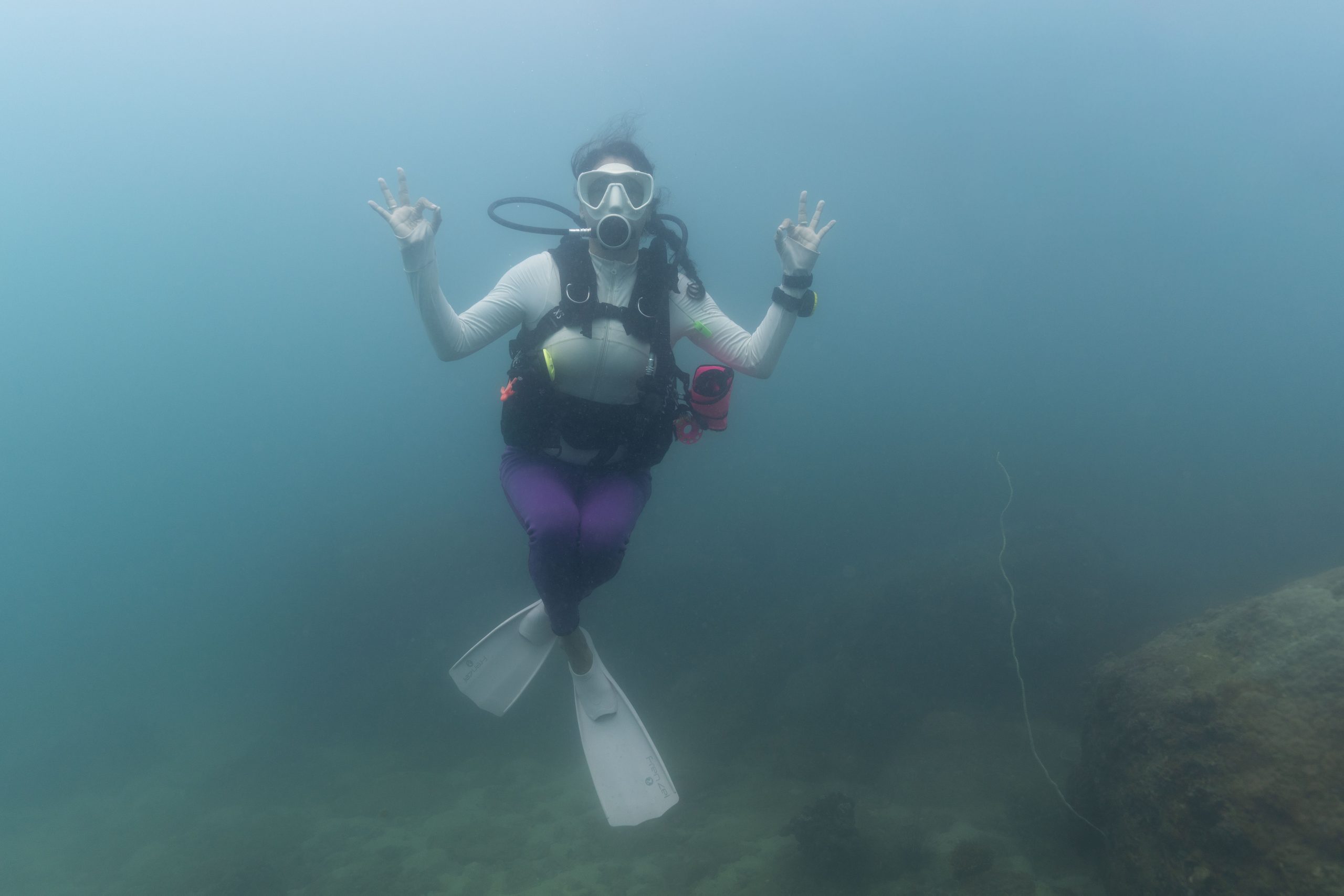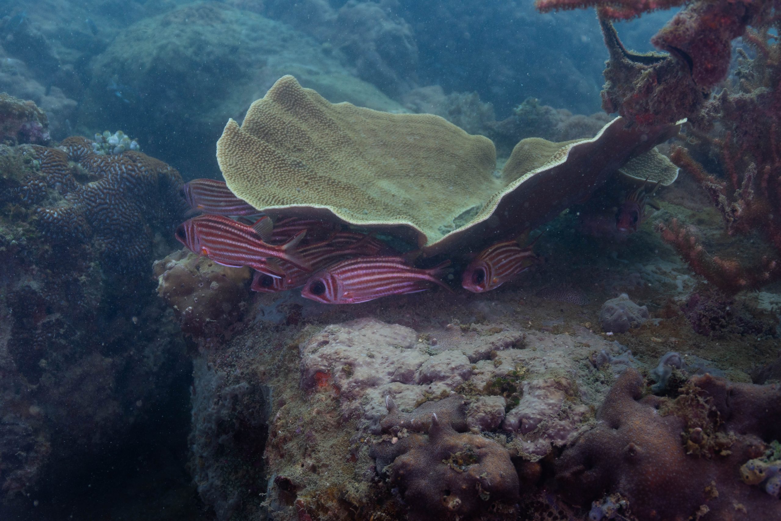 Am nächsten Morgen sah ich vertraute Gesichter. Ein Holzboot hatte angelegt. Und darauf war die altbekannte Tauchcrew versammelt. Sie hatten es mir schon mitgeteilt. Der Sturm auf der Nordseite zwang sie, heute im Süden zu tauchen, und ich wollte mich anschließen. Noch einmal ins Wasser, darauf freute ich mich. Die Sicht auf der Südseite war noch schlechter als im Norden. Heute waren wir eine recht große Gruppe von fünf Leuten, und wir mussten uns bemühen, uns nicht zu verlieren. Oft sah ich die anderen Taucher nur noch schemenhaft. Aber auch hier war die Unterwasserwelt spannend. Wir sahen zwei Tintenfische, die sich minutenlang beobachten ließen. Es war ein schöner Tag.