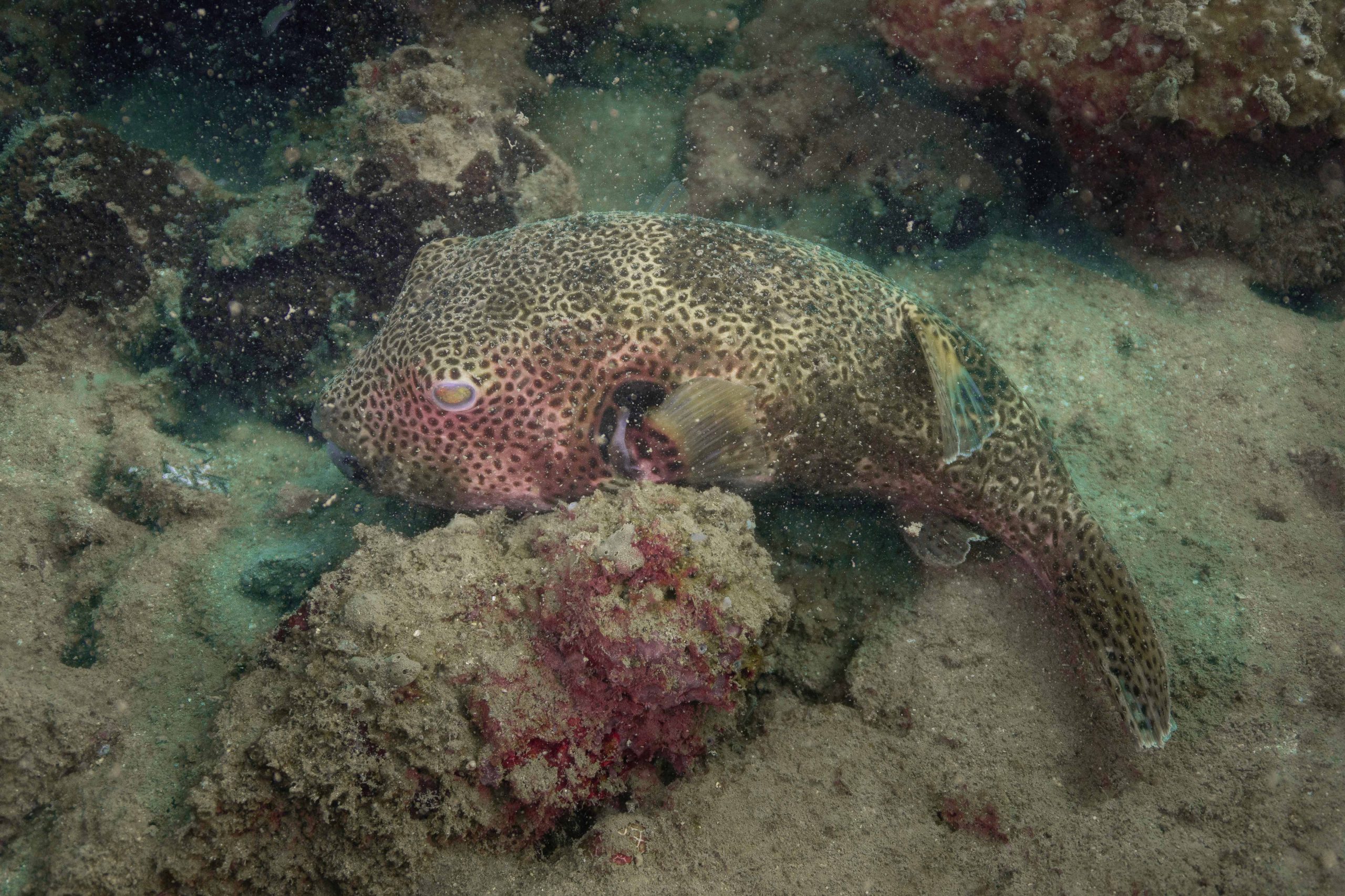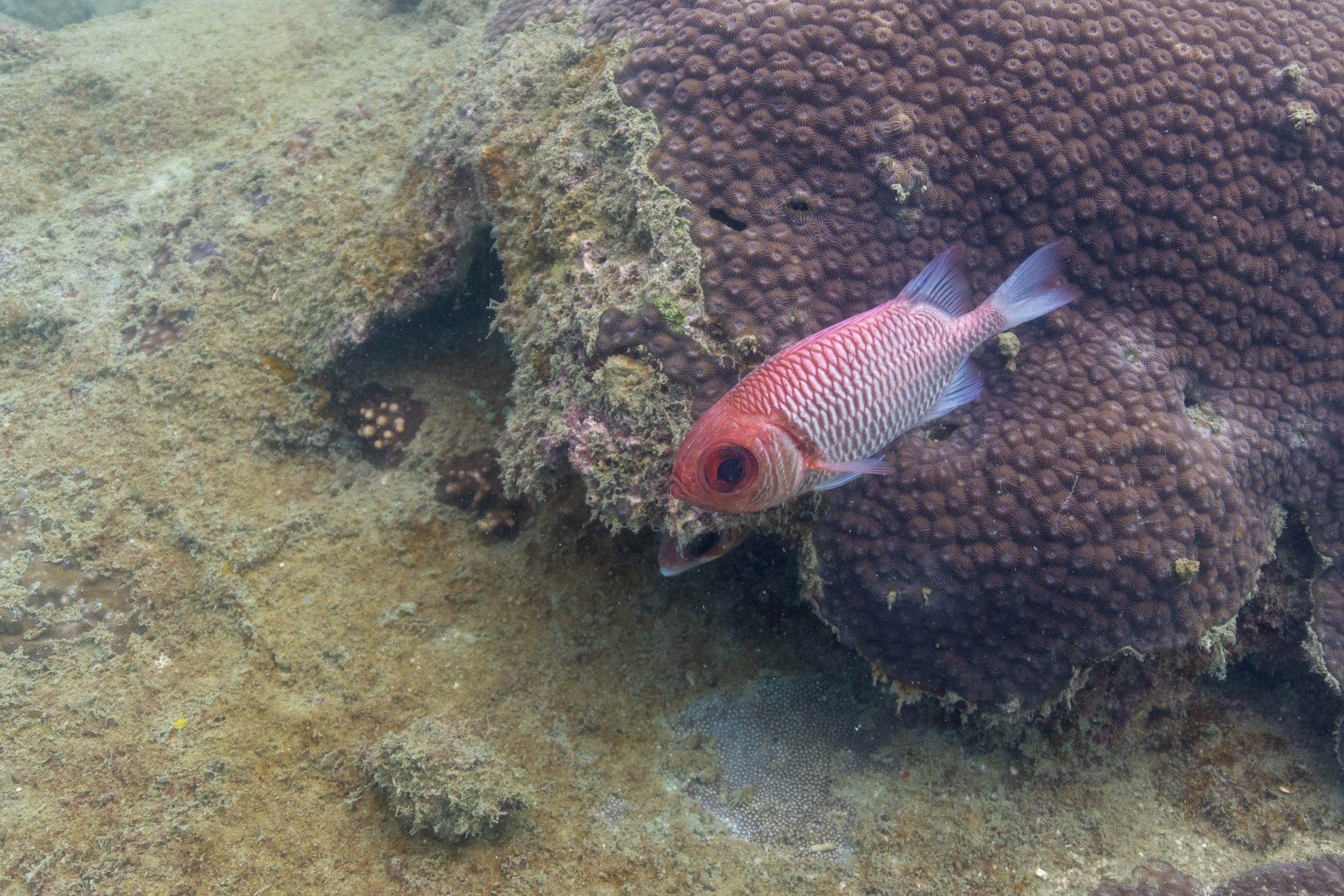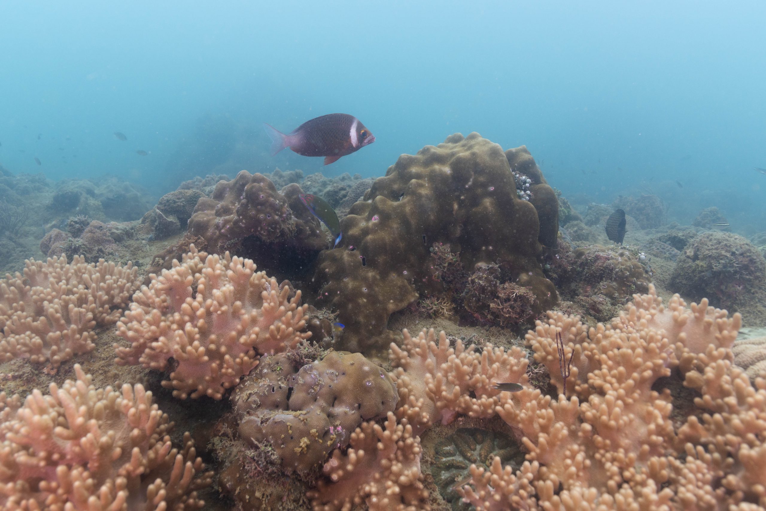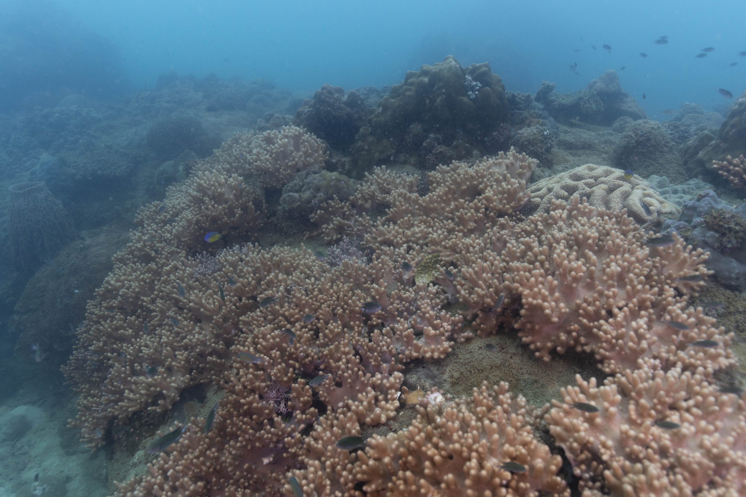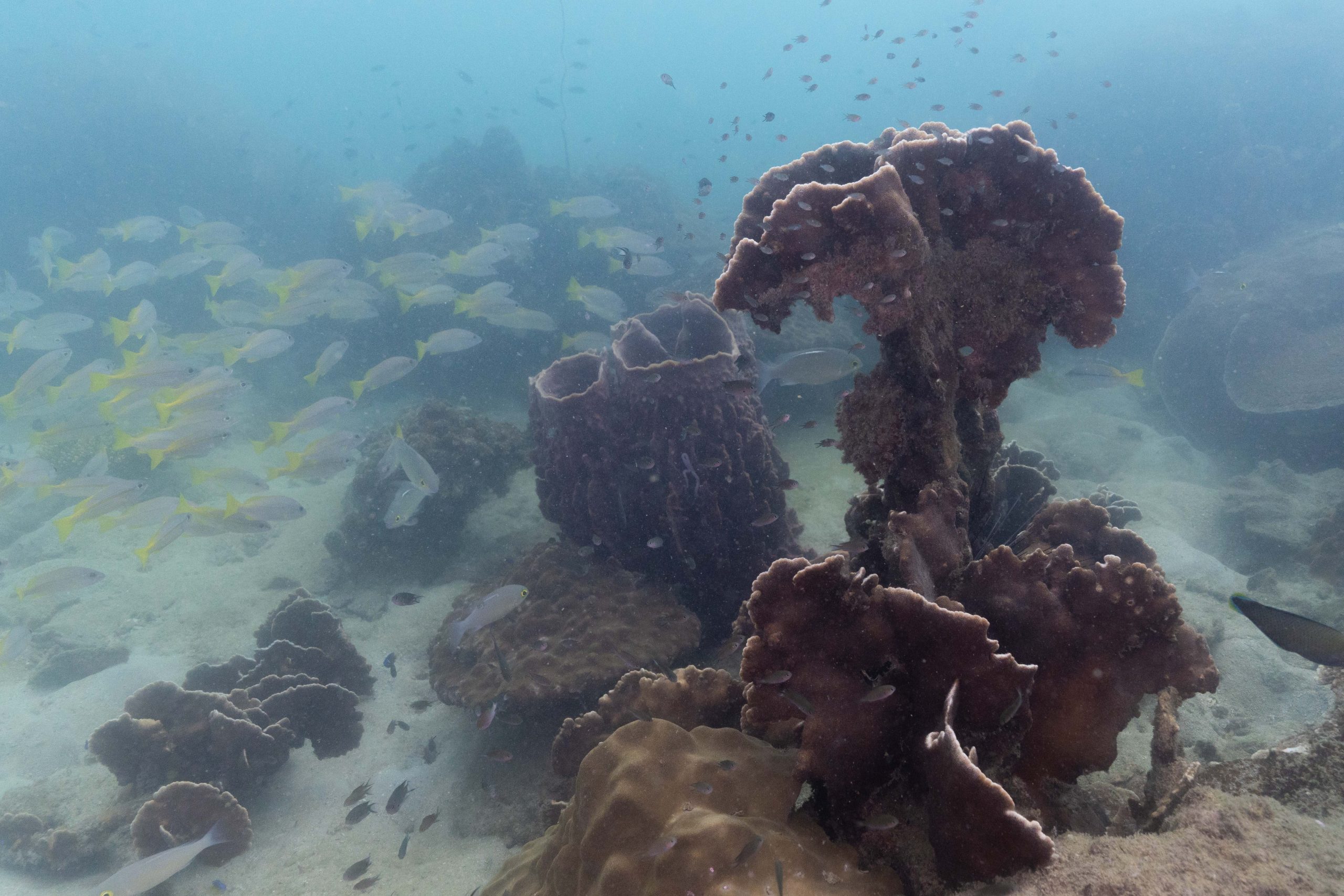 Am nächsten Morgen sah ich vertraute Gesichter. Ein Holzboot hatte angelegt. Und darauf war die altbekannte Tauchcrew versammelt. Sie hatten es mir schon mitgeteilt. Der Sturm auf der Nordseite zwang sie, heute im Süden zu tauchen, und ich wollte mich anschließen. Noch einmal ins Wasser, darauf freute ich mich. Die Sicht auf der Südseite war noch schlechter als im Norden. Heute waren wir eine recht große Gruppe von fünf Leuten, und wir mussten uns bemühen, uns nicht zu verlieren. Oft sah ich die anderen Taucher nur noch schemenhaft. Aber auch hier war die Unterwasserwelt spannend. Wir sahen zwei Tintenfische, die sich minutenlang beobachten ließen. Es war ein schöner Tag.