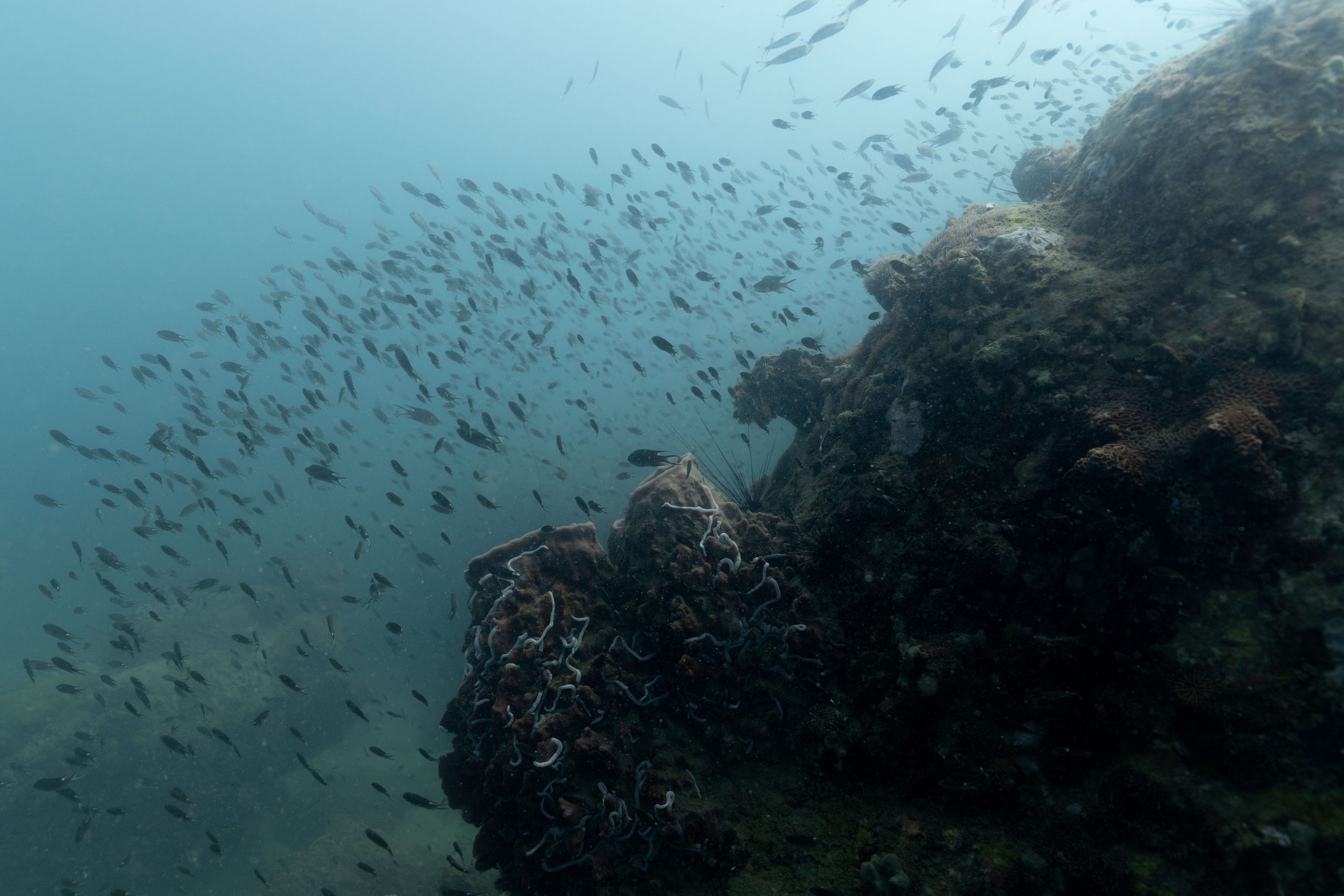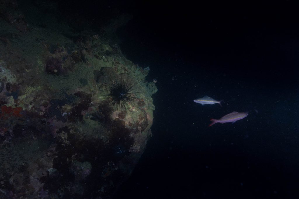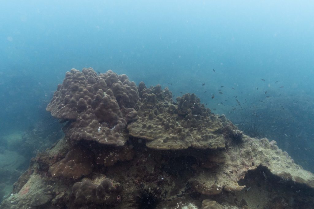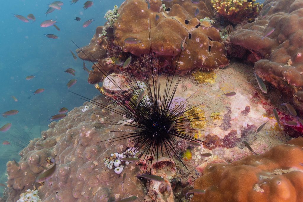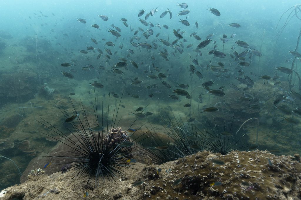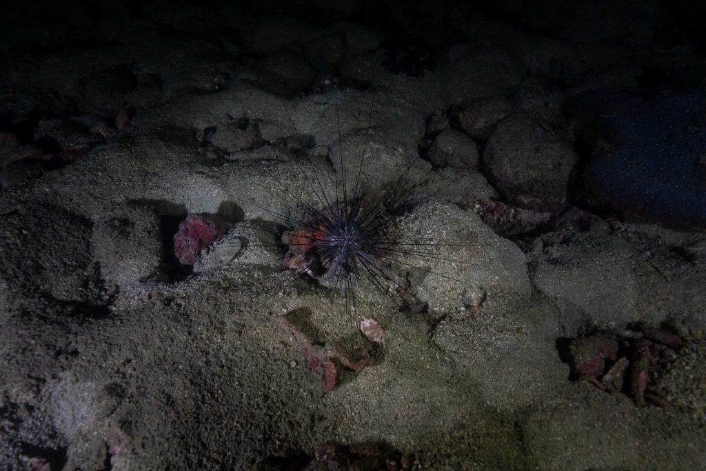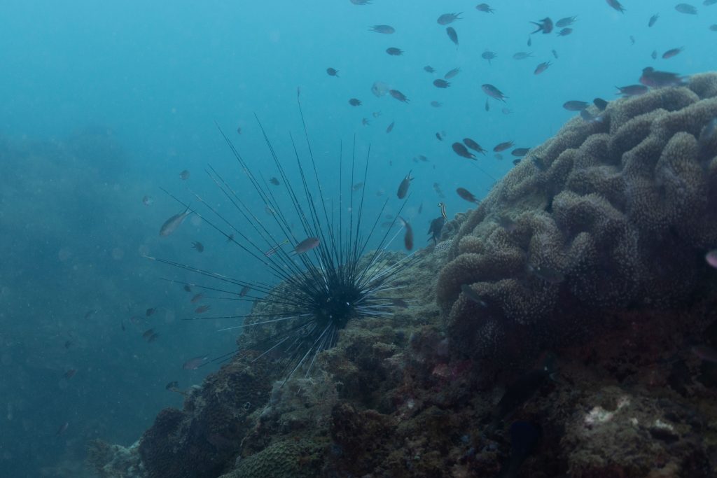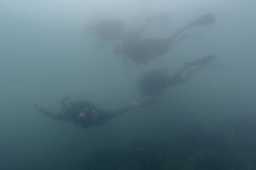 Die nächsten zwei Tage verbrachte ich auf dem Meer. Ich wollte tauchen – und war gespannt auf die hiesige Unterwasserwelt. Beim Sprung ins Meer war ich sofort von einem grauen Nebel umgeben. Das Wasser ist durch Schwebstoffe erstaunlich trüb. Man sieht nur wenige Meter weit. Das ist prinzipiell kein Problem, kann es doch bedeuten, dass das nahrhafte Wasser besonders viele Pflanzen und Tiere hervorbringt. Und so war es tatsächlich. Am Meeresgrund fand ich ein spannendes Biotop vor. Unzählige Schwämme, Korallen und verzweigte Wasserpflanzen bedeckten den Grund. Dazwischen lebten vor allem Seeigel, aber auch vielerlei Fische und Muscheln. Zwei Tage lang schwebte ich durch die schemenhafte Unterwasserwelt, aus der immer wieder bunte Fische auftauchten. Es war großartig!