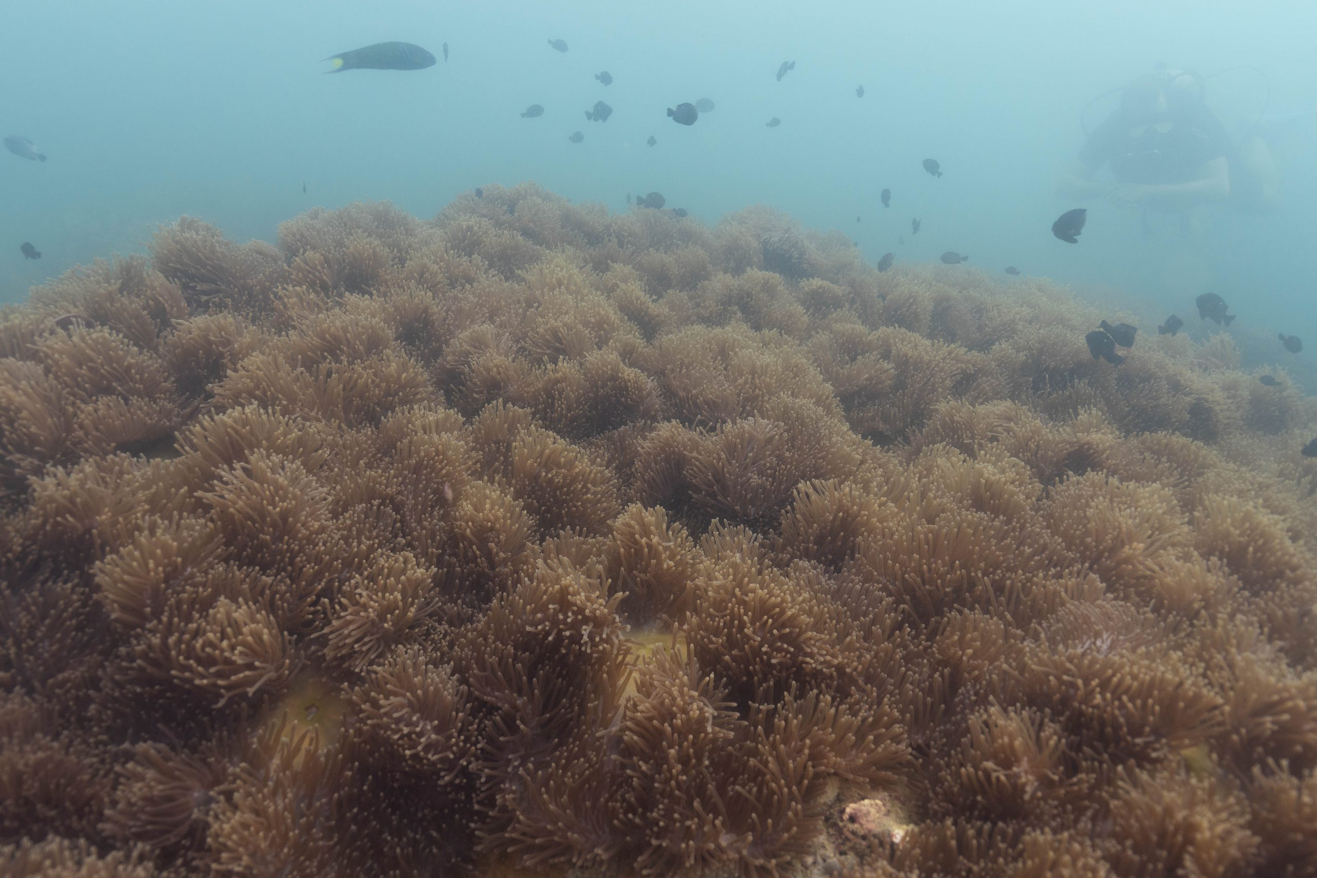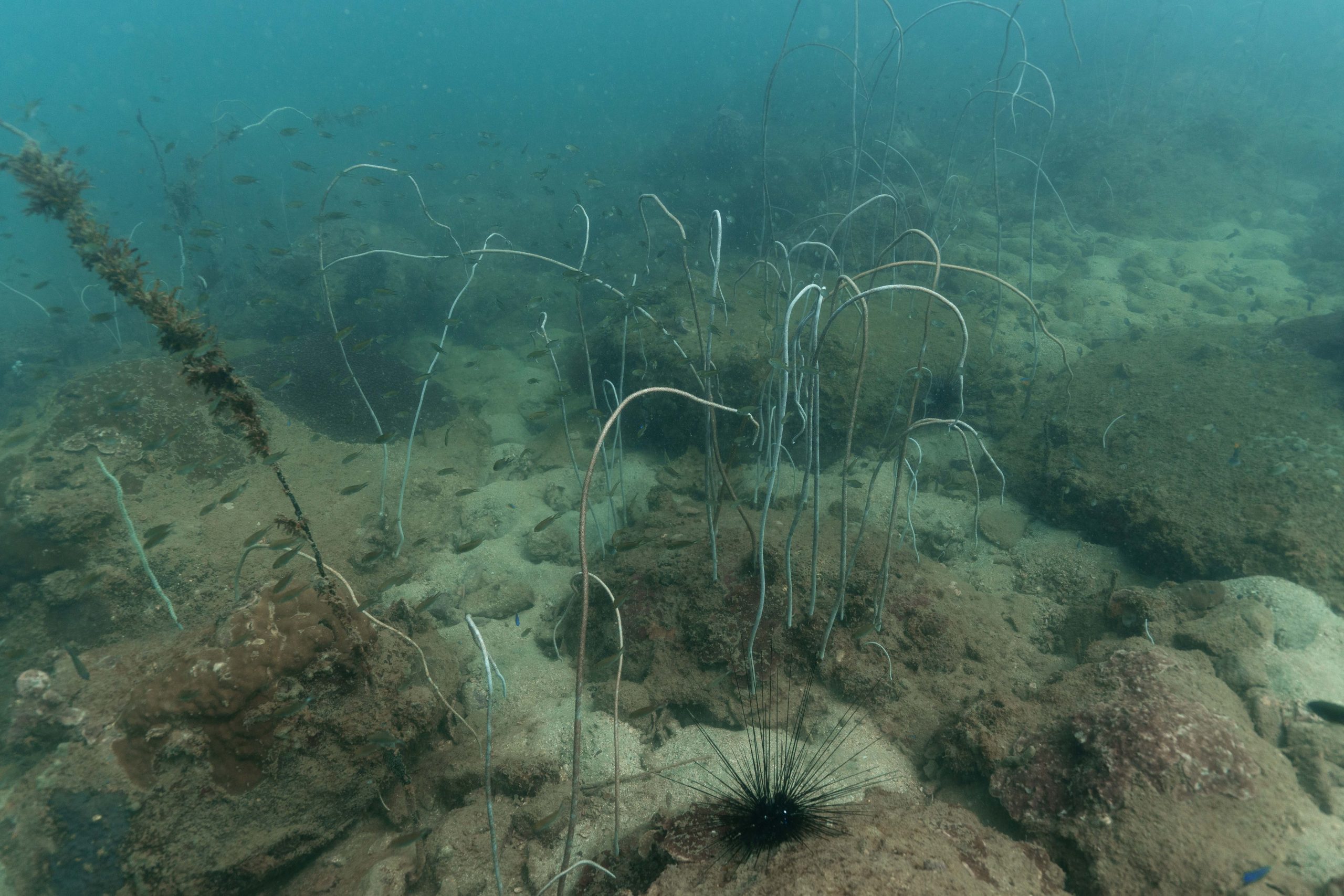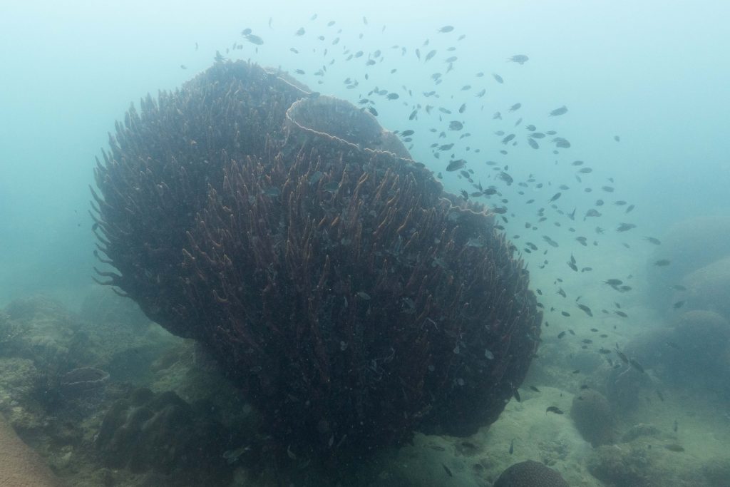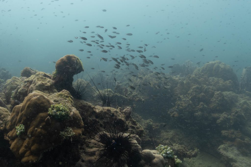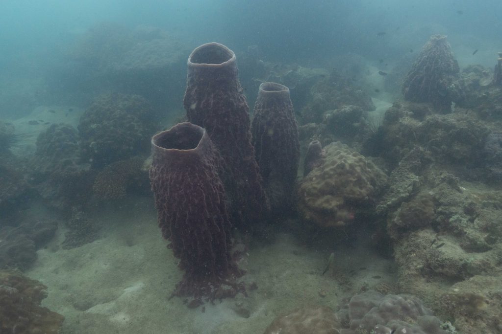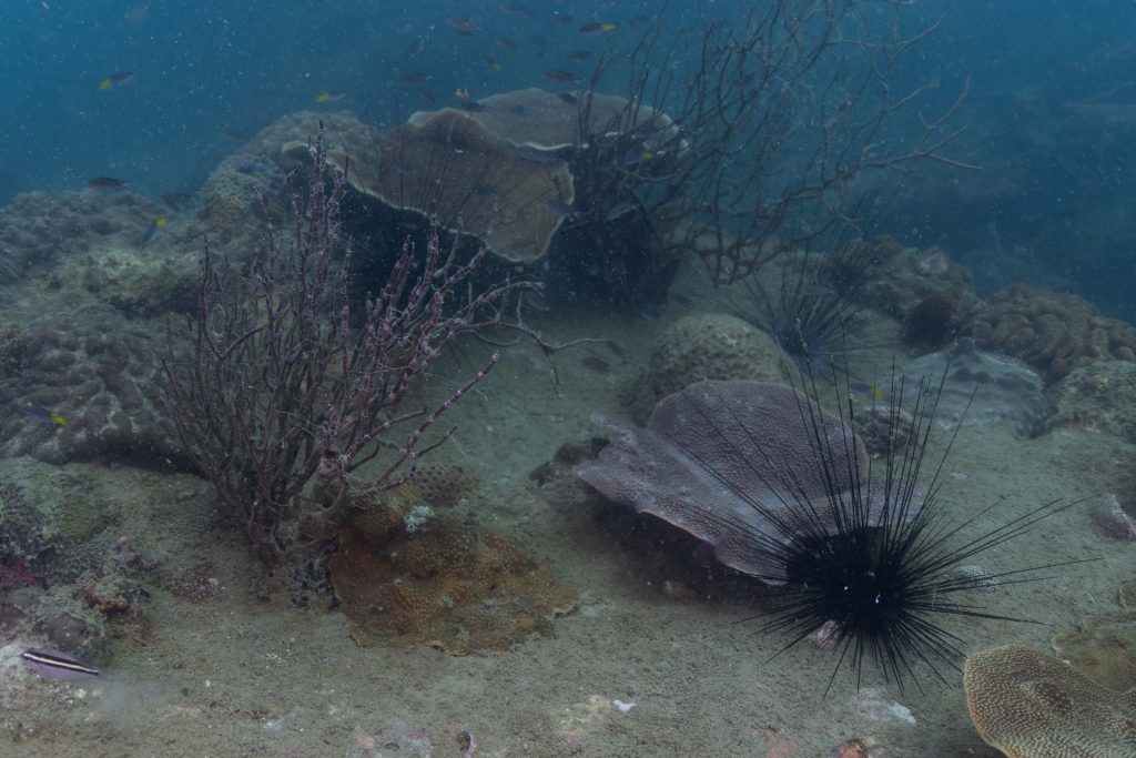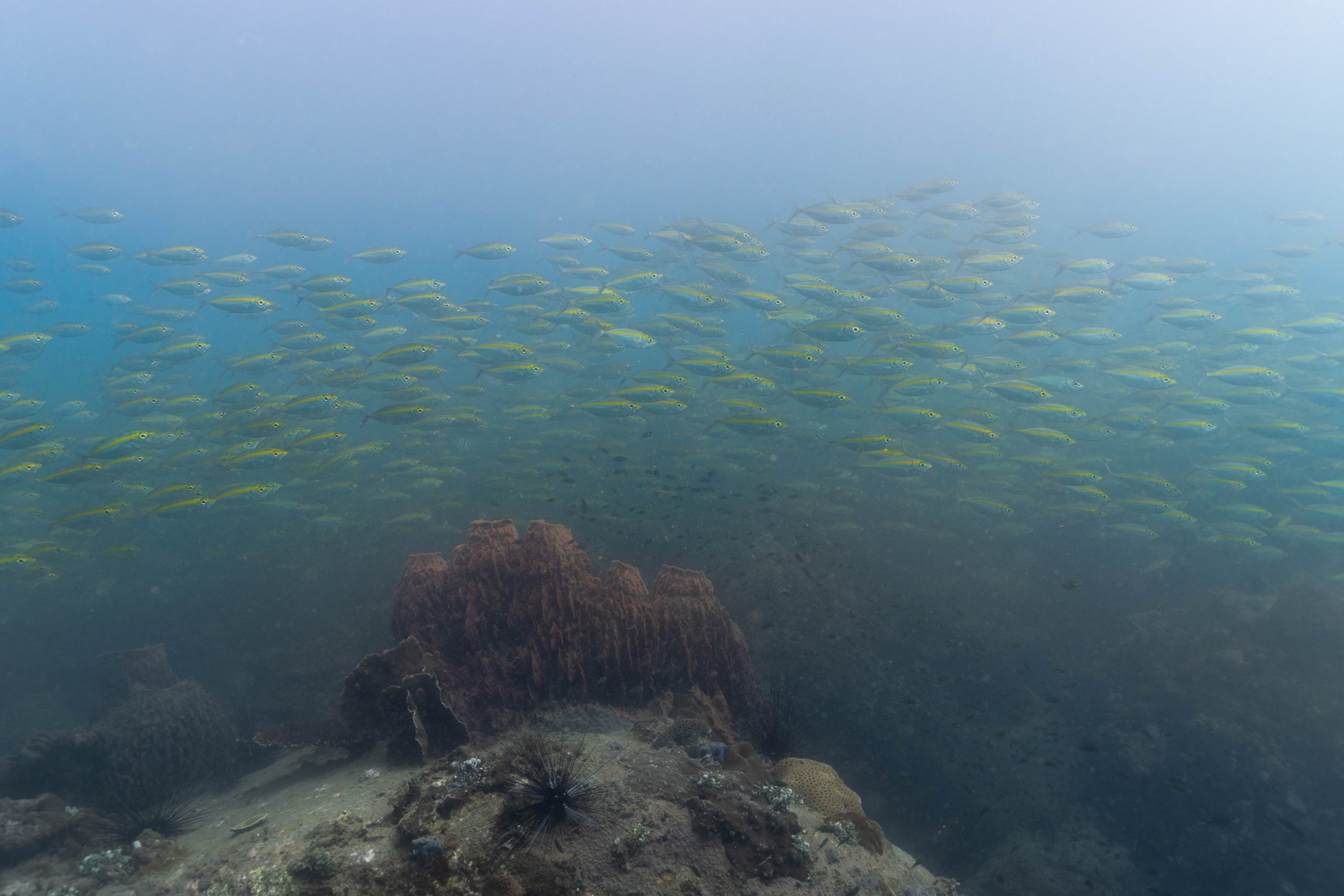 Die nächsten zwei Tage verbrachte ich auf dem Meer. Ich wollte tauchen – und war gespannt auf die hiesige Unterwasserwelt. Beim Sprung ins Meer war ich sofort von einem grauen Nebel umgeben. Das Wasser ist durch Schwebstoffe erstaunlich trüb. Man sieht nur wenige Meter weit. Das ist prinzipiell kein Problem, kann es doch bedeuten, dass das nahrhafte Wasser besonders viele Pflanzen und Tiere hervorbringt. Und so war es tatsächlich. Am Meeresgrund fand ich ein spannendes Biotop vor. Unzählige Schwämme, Korallen und verzweigte Wasserpflanzen bedeckten den Grund. Dazwischen lebten vor allem Seeigel, aber auch vielerlei Fische und Muscheln. Zwei Tage lang schwebte ich durch die schemenhafte Unterwasserwelt, aus der immer wieder bunte Fische auftauchten. Es war großartig!