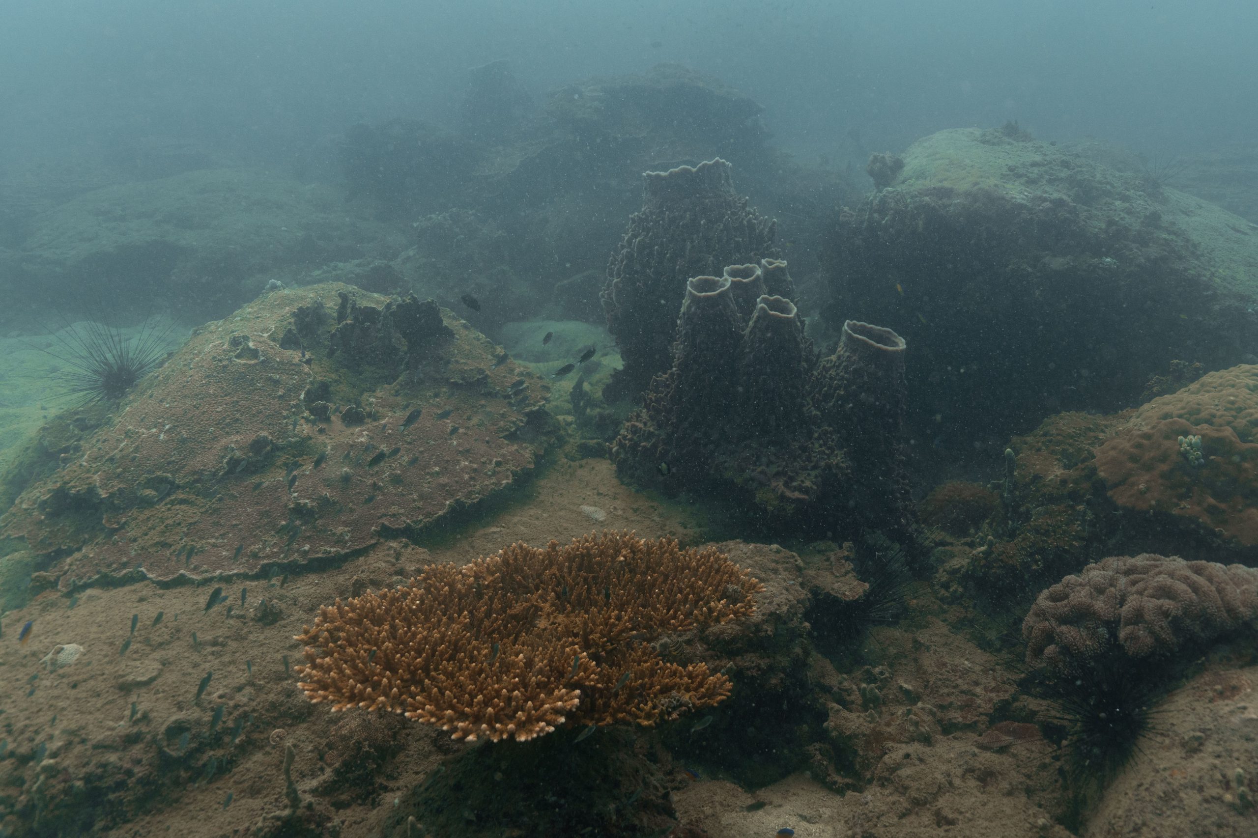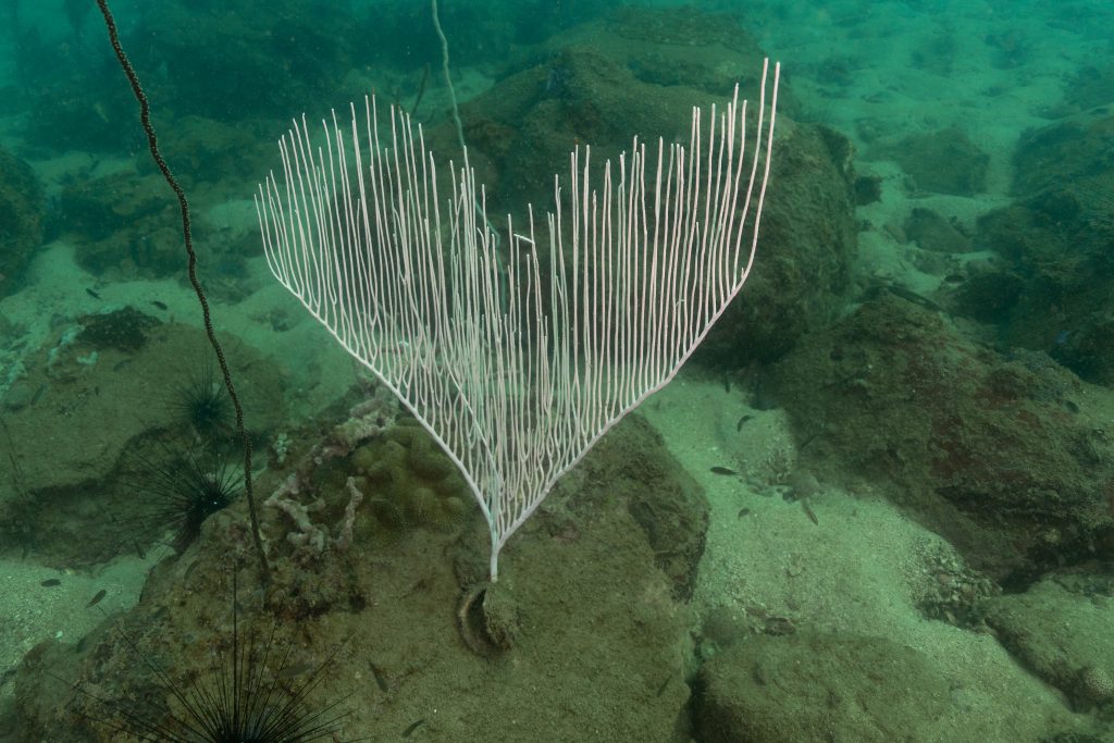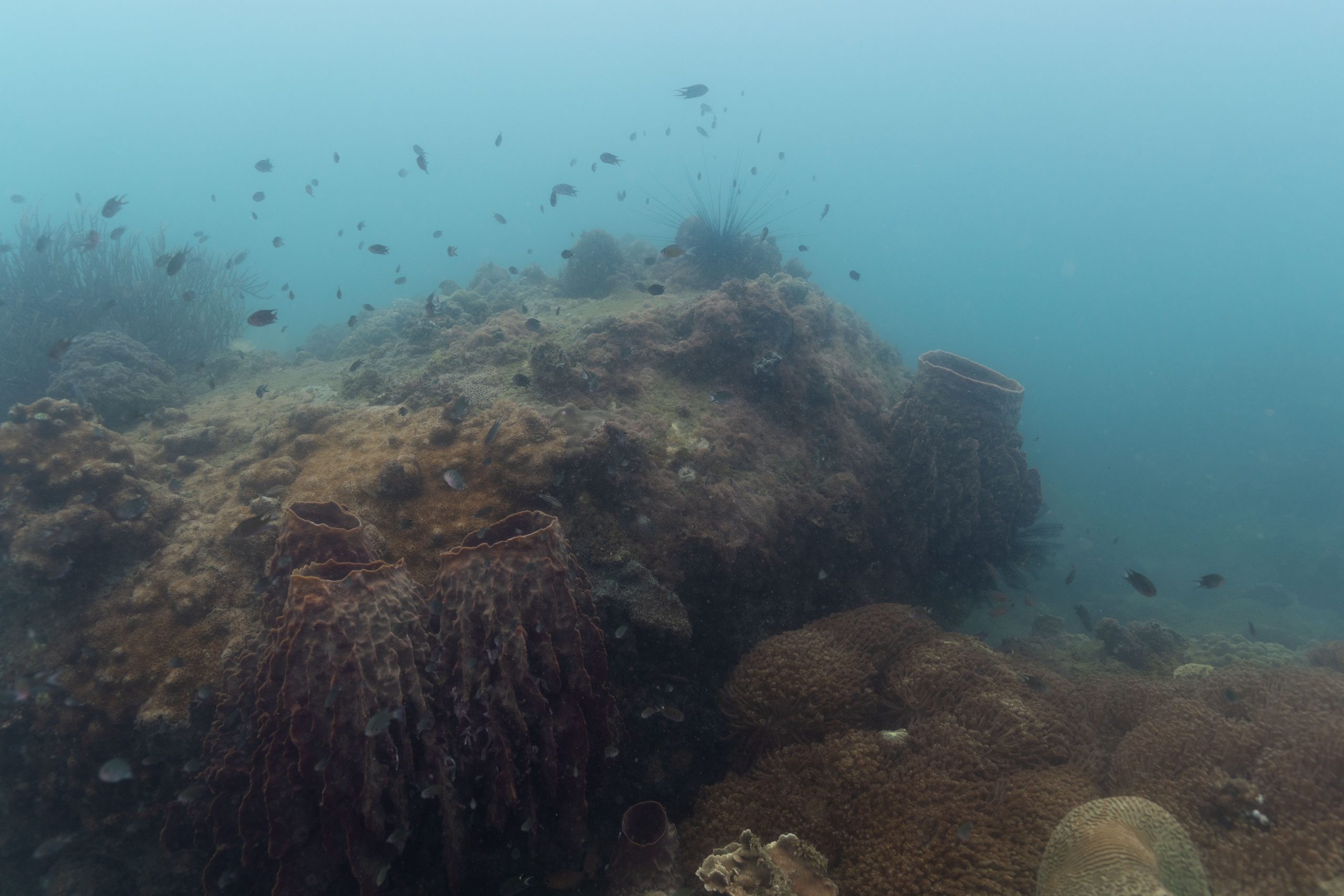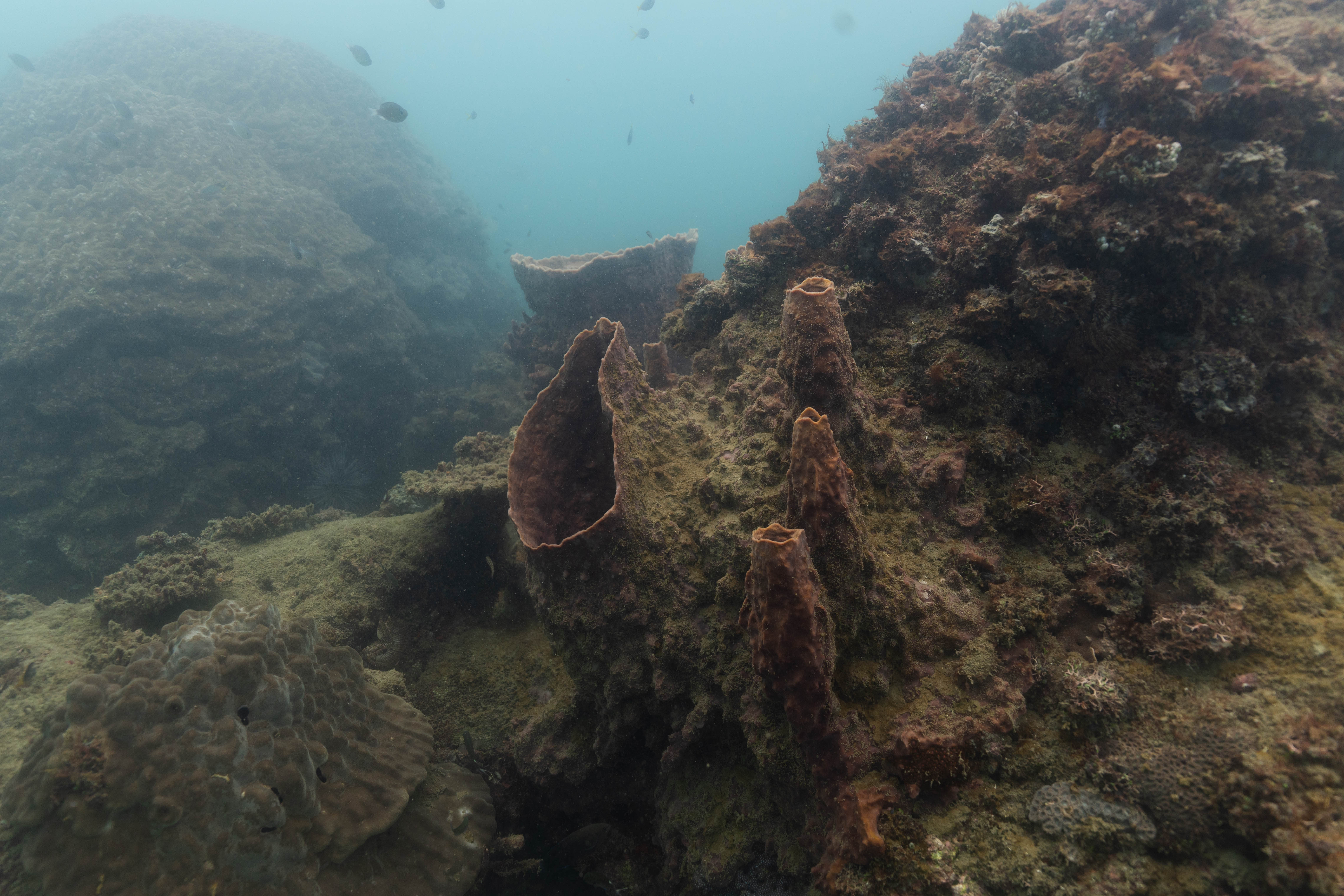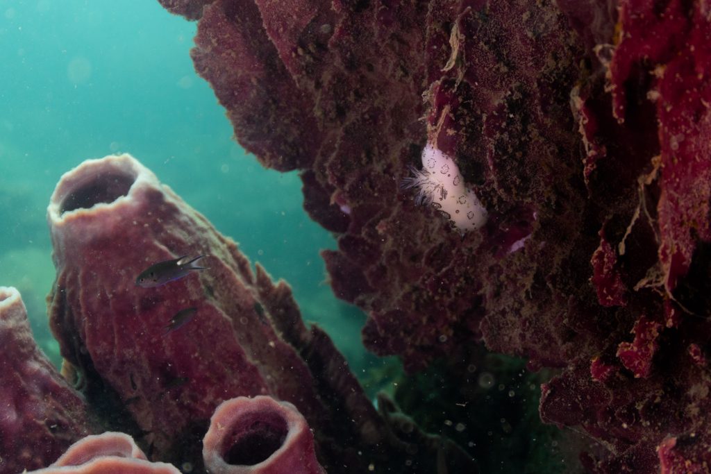 Die nächsten zwei Tage verbrachte ich auf dem Meer. Ich wollte tauchen – und war gespannt auf die hiesige Unterwasserwelt. Beim Sprung ins Meer war ich sofort von einem grauen Nebel umgeben. Das Wasser ist durch Schwebstoffe erstaunlich trüb. Man sieht nur wenige Meter weit. Das ist prinzipiell kein Problem, kann es doch bedeuten, dass das nahrhafte Wasser besonders viele Pflanzen und Tiere hervorbringt. Und so war es tatsächlich. Am Meeresgrund fand ich ein spannendes Biotop vor. Unzählige Schwämme, Korallen und verzweigte Wasserpflanzen bedeckten den Grund. Dazwischen lebten vor allem Seeigel, aber auch vielerlei Fische und Muscheln. Zwei Tage lang schwebte ich durch die schemenhafte Unterwasserwelt, aus der immer wieder bunte Fische auftauchten. Es war großartig!