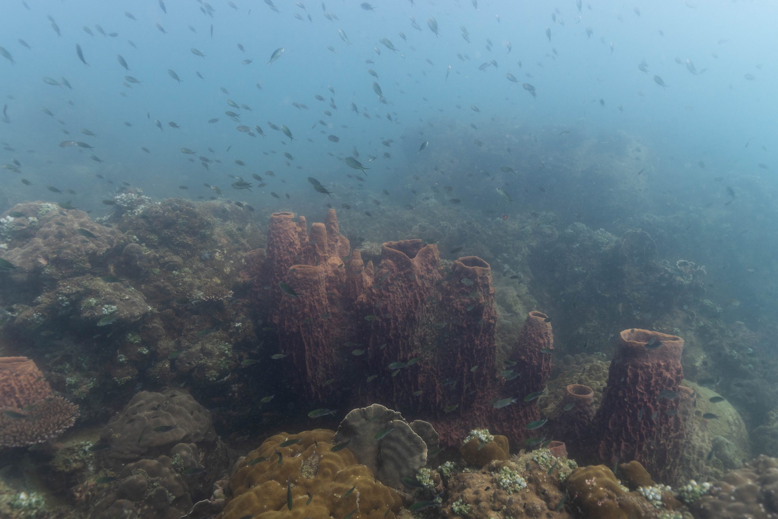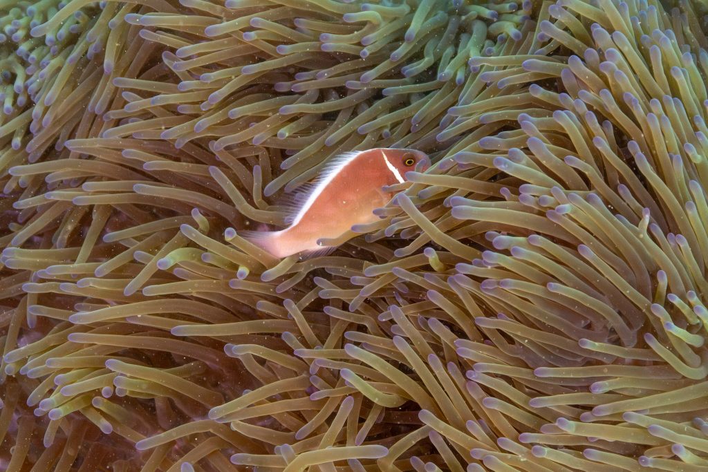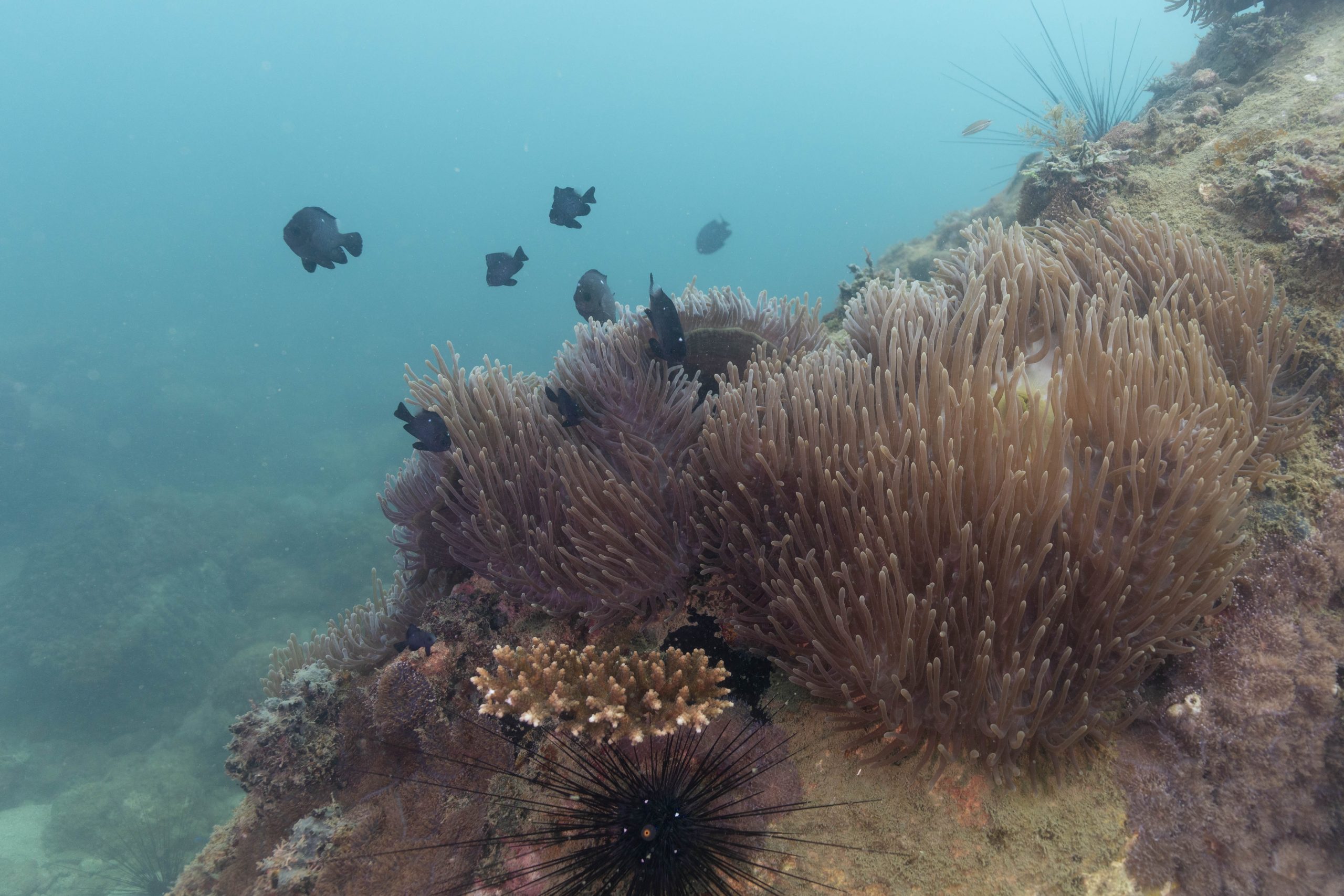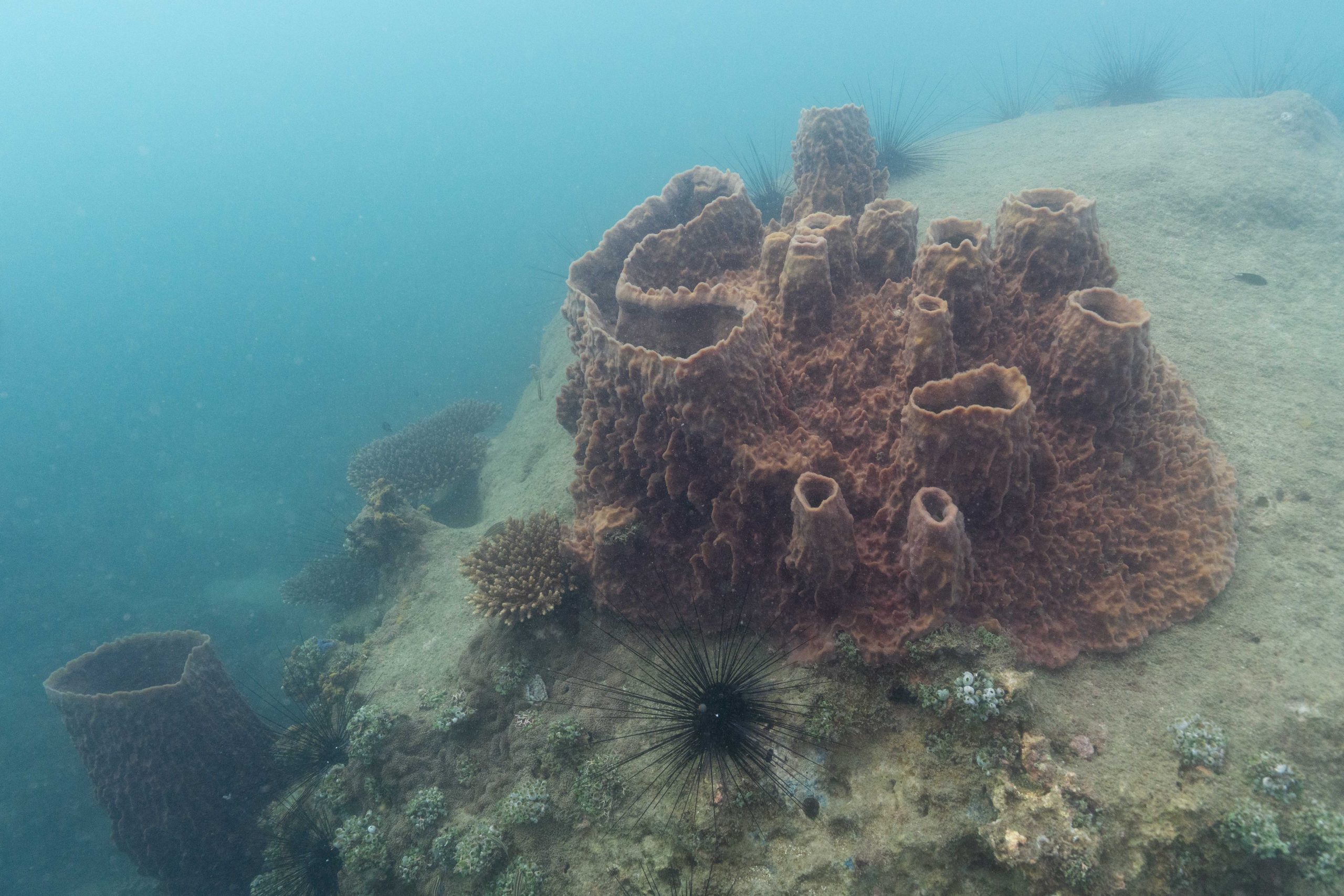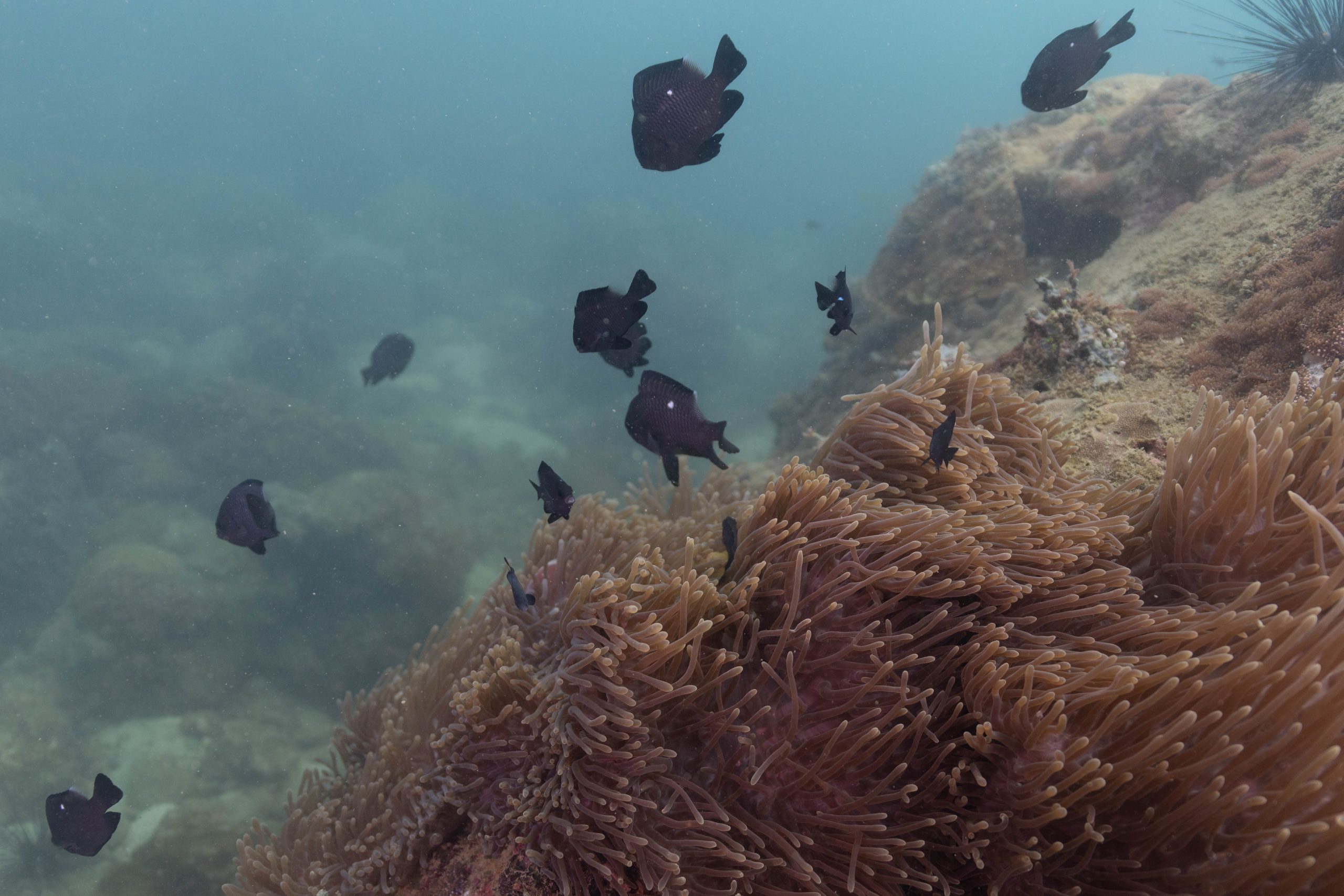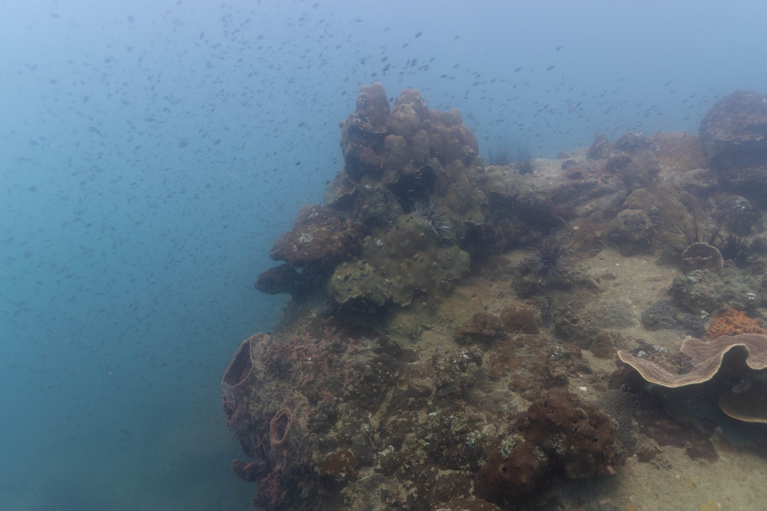Die nächsten zwei Tage verbrachte ich auf dem Meer. Ich wollte tauchen – und war gespannt auf die hiesige Unterwasserwelt. Beim Sprung ins Meer war ich sofort von einem grauen Nebel umgeben. Das Wasser ist durch Schwebstoffe erstaunlich trüb. Man sieht nur wenige Meter weit. Das ist prinzipiell kein Problem, kann es doch bedeuten, dass das nahrhafte Wasser besonders viele Pflanzen und Tiere hervorbringt. Und so war es tatsächlich. Am Meeresgrund fand ich ein spannendes Biotop vor. Unzählige Schwämme, Korallen und verzweigte Wasserpflanzen bedeckten den Grund. Dazwischen lebten vor allem Seeigel, aber auch vielerlei Fische und Muscheln. Zwei Tage lang schwebte ich durch die schemenhafte Unterwasserwelt, aus der immer wieder bunte Fische auftauchten. Es war großartig!