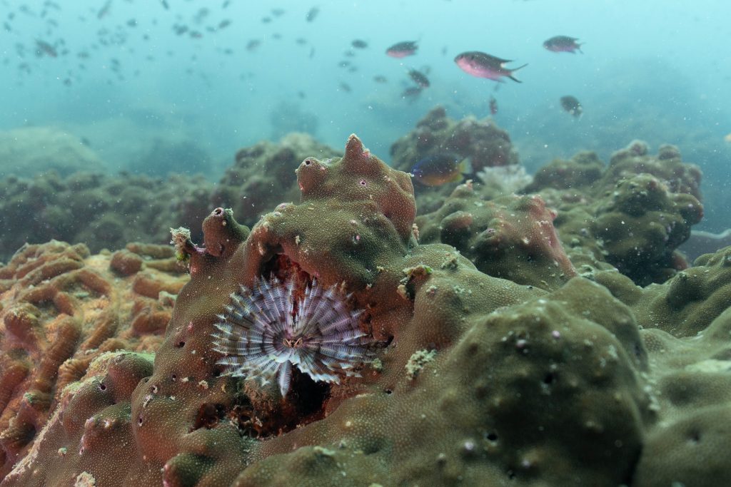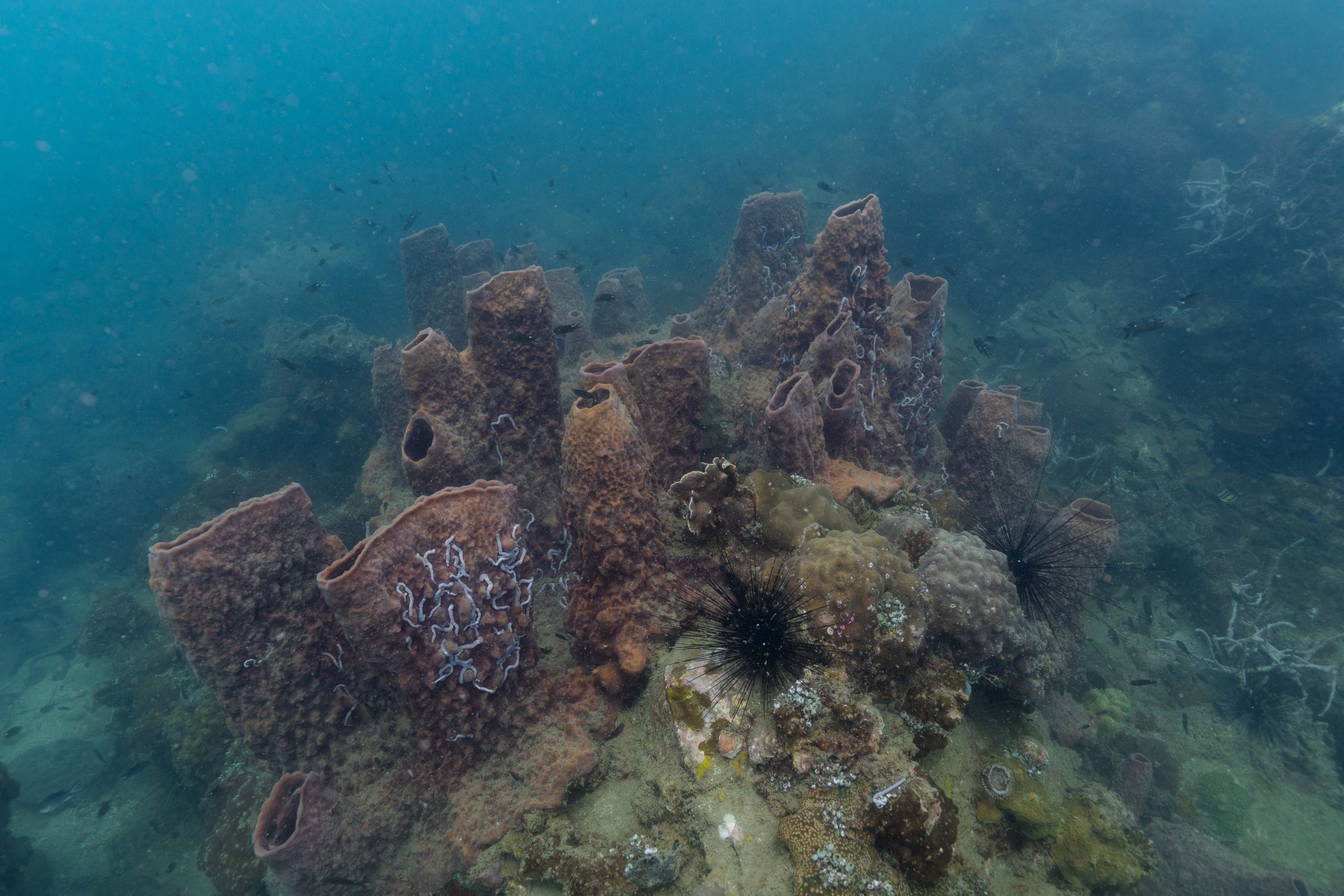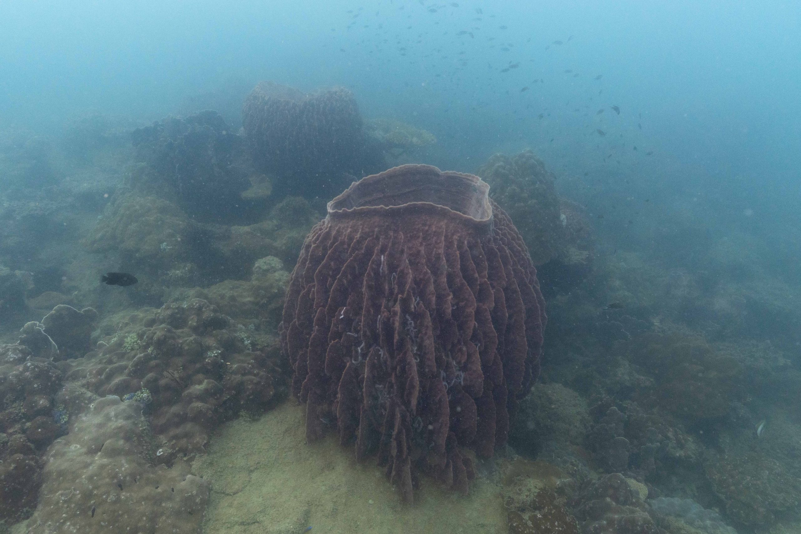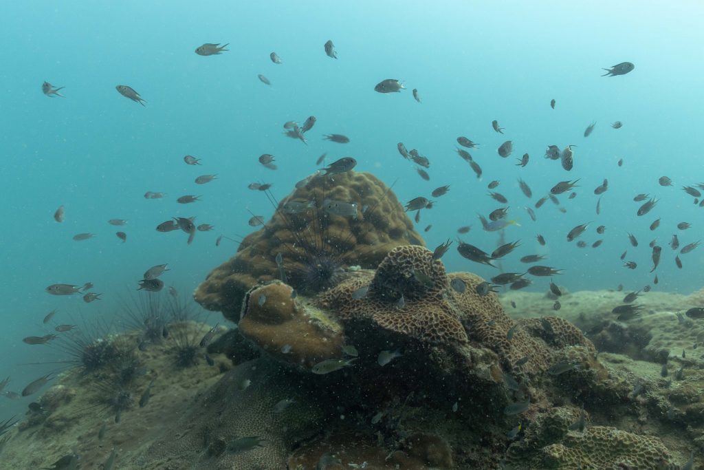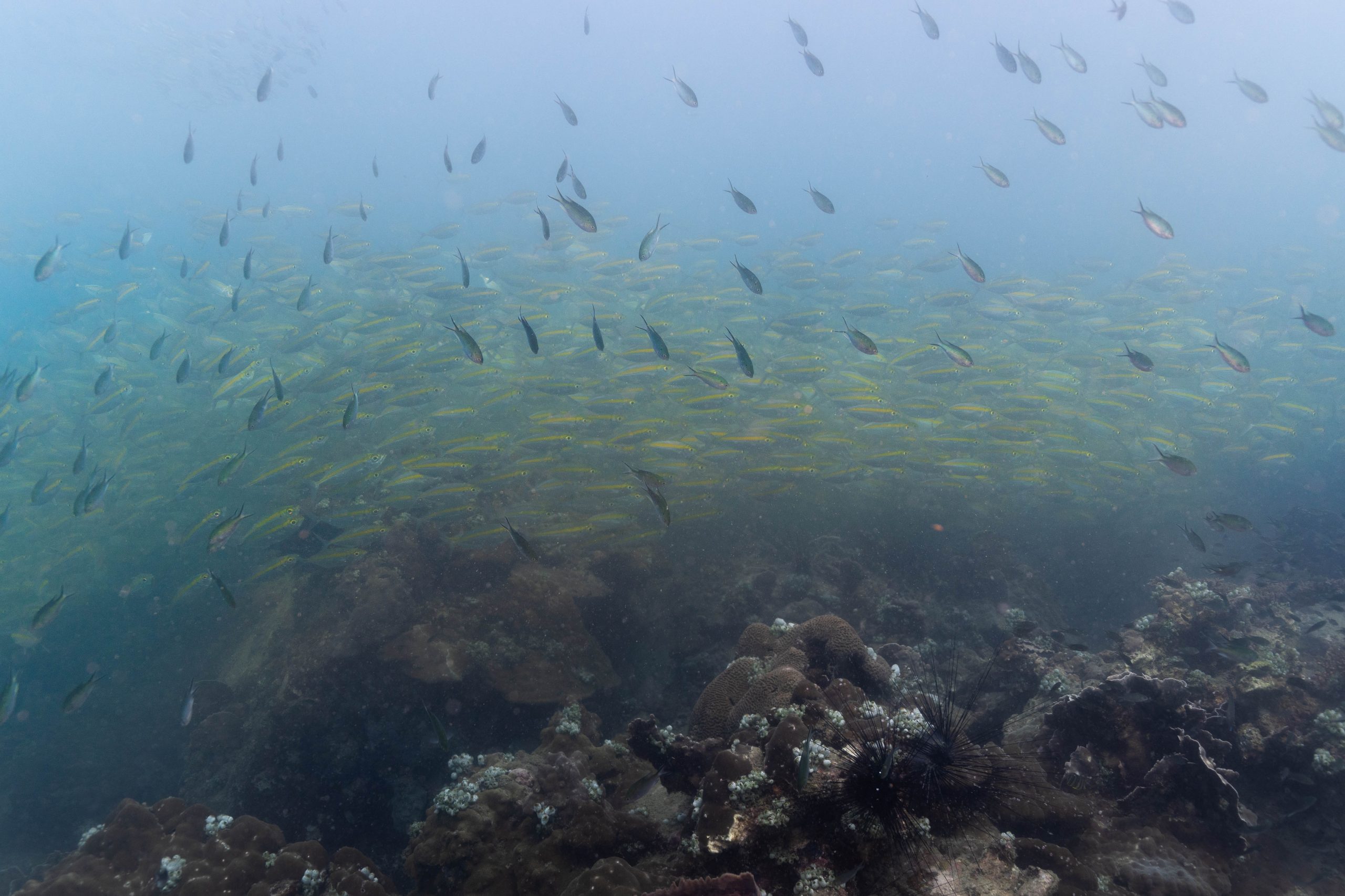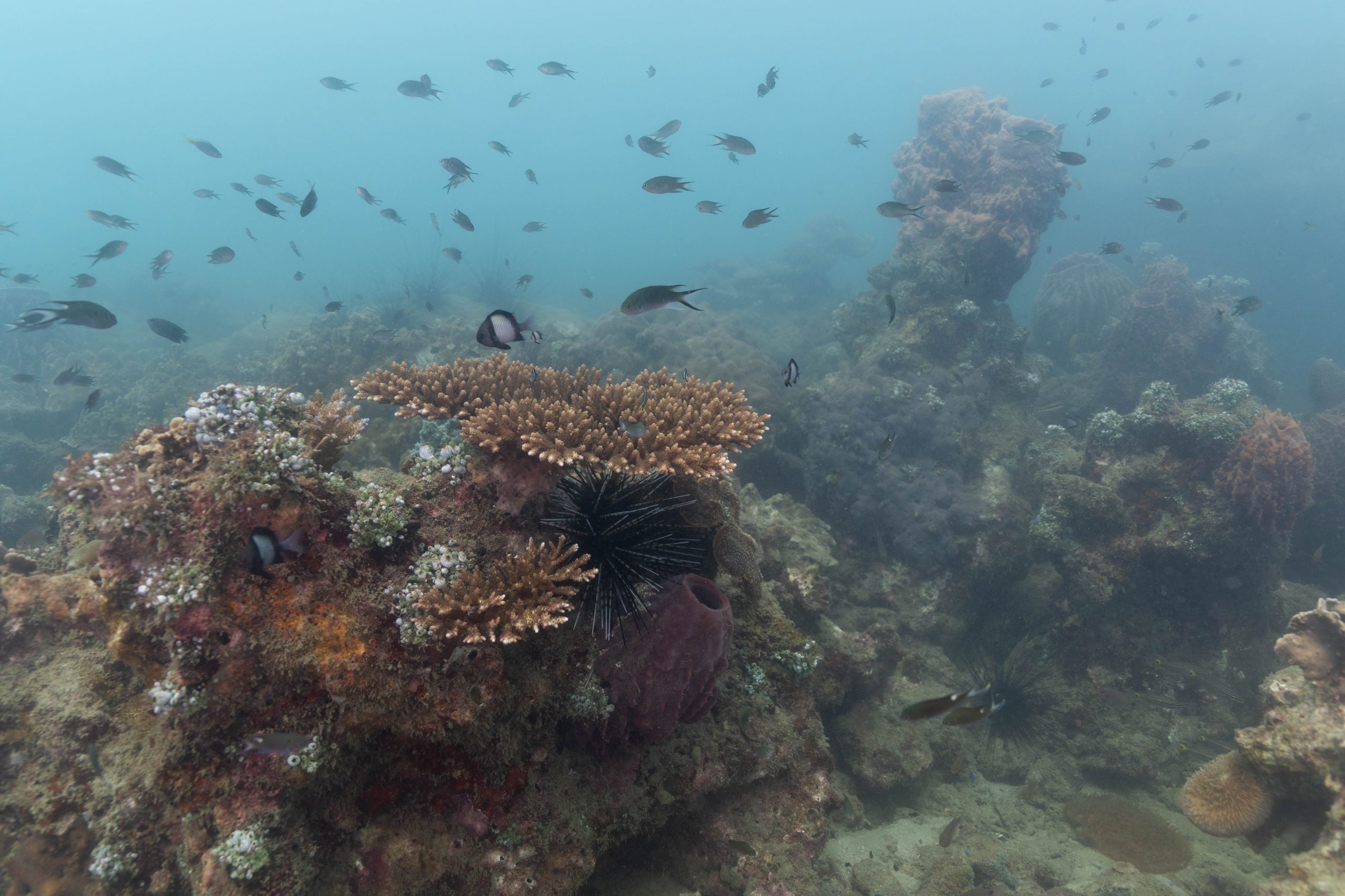 Die nächsten zwei Tage verbrachte ich auf dem Meer. Ich wollte tauchen – und war gespannt auf die hiesige Unterwasserwelt. Beim Sprung ins Meer war ich sofort von einem grauen Nebel umgeben. Das Wasser ist durch Schwebstoffe erstaunlich trüb. Man sieht nur wenige Meter weit. Das ist prinzipiell kein Problem, kann es doch bedeuten, dass das nahrhafte Wasser besonders viele Pflanzen und Tiere hervorbringt. Und so war es tatsächlich. Am Meeresgrund fand ich ein spannendes Biotop vor. Unzählige Schwämme, Korallen und verzweigte Wasserpflanzen bedeckten den Grund. Dazwischen lebten vor allem Seeigel, aber auch vielerlei Fische und Muscheln. Zwei Tage lang schwebte ich durch die schemenhafte Unterwasserwelt, aus der immer wieder bunte Fische auftauchten. Es war großartig!
