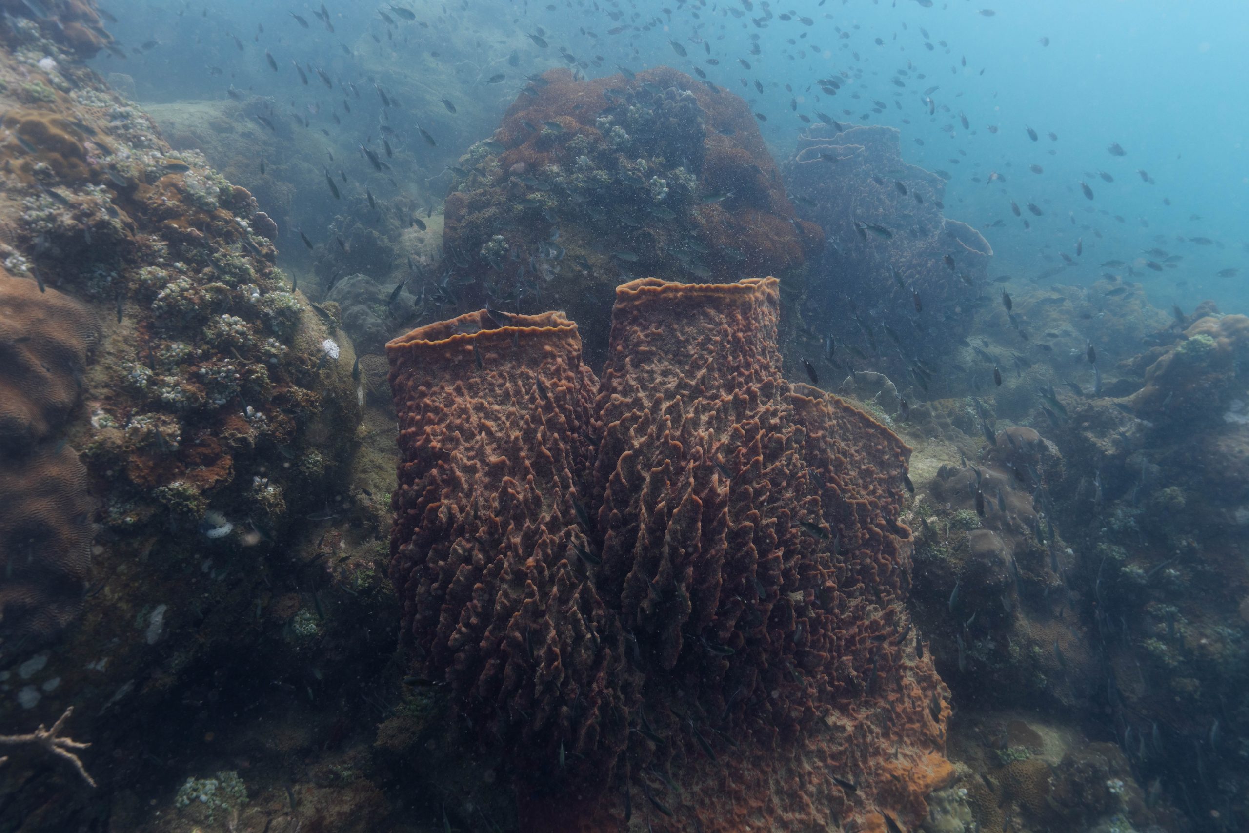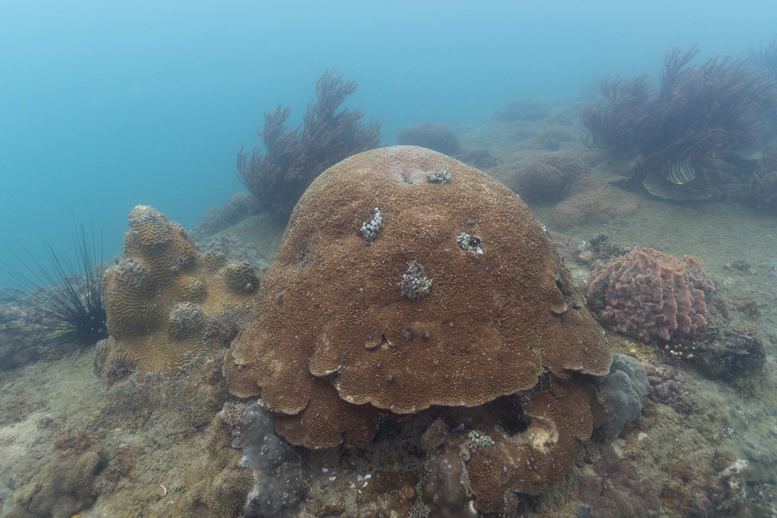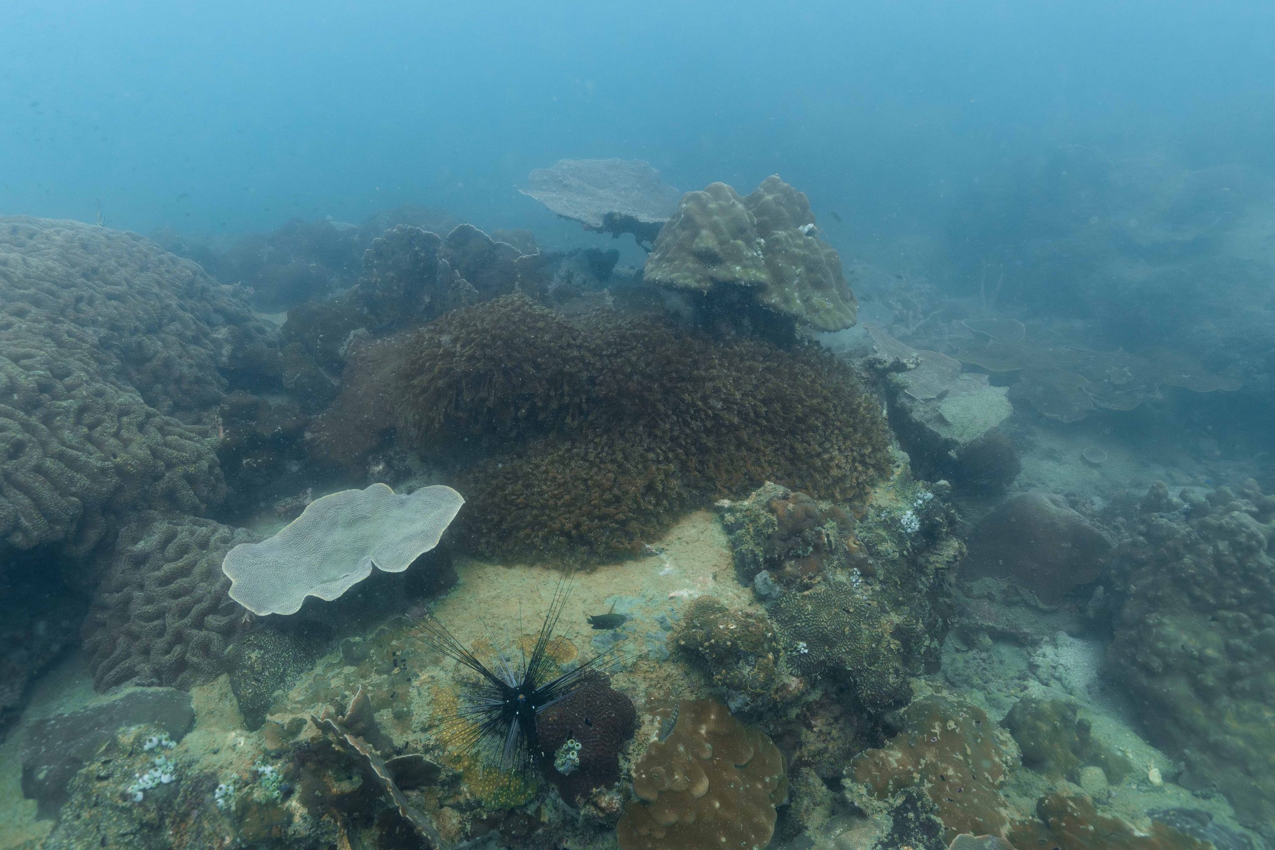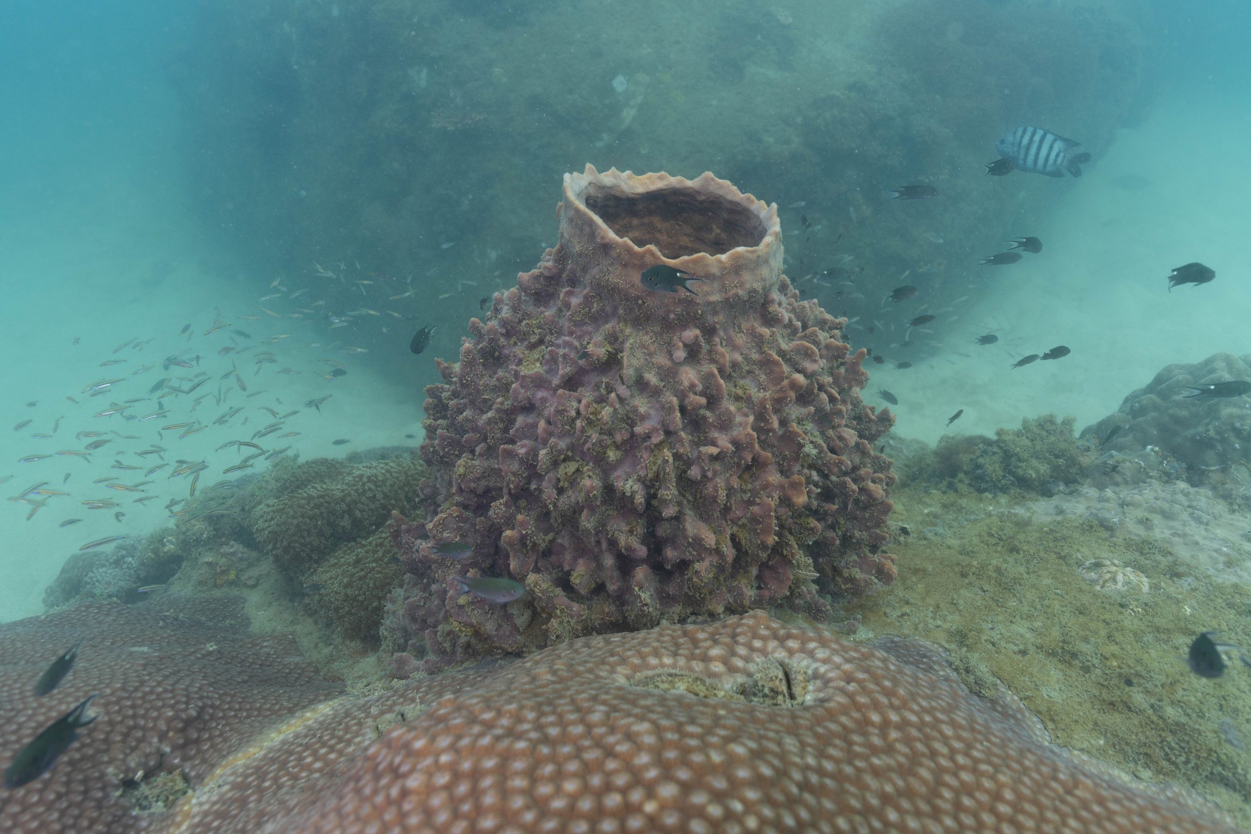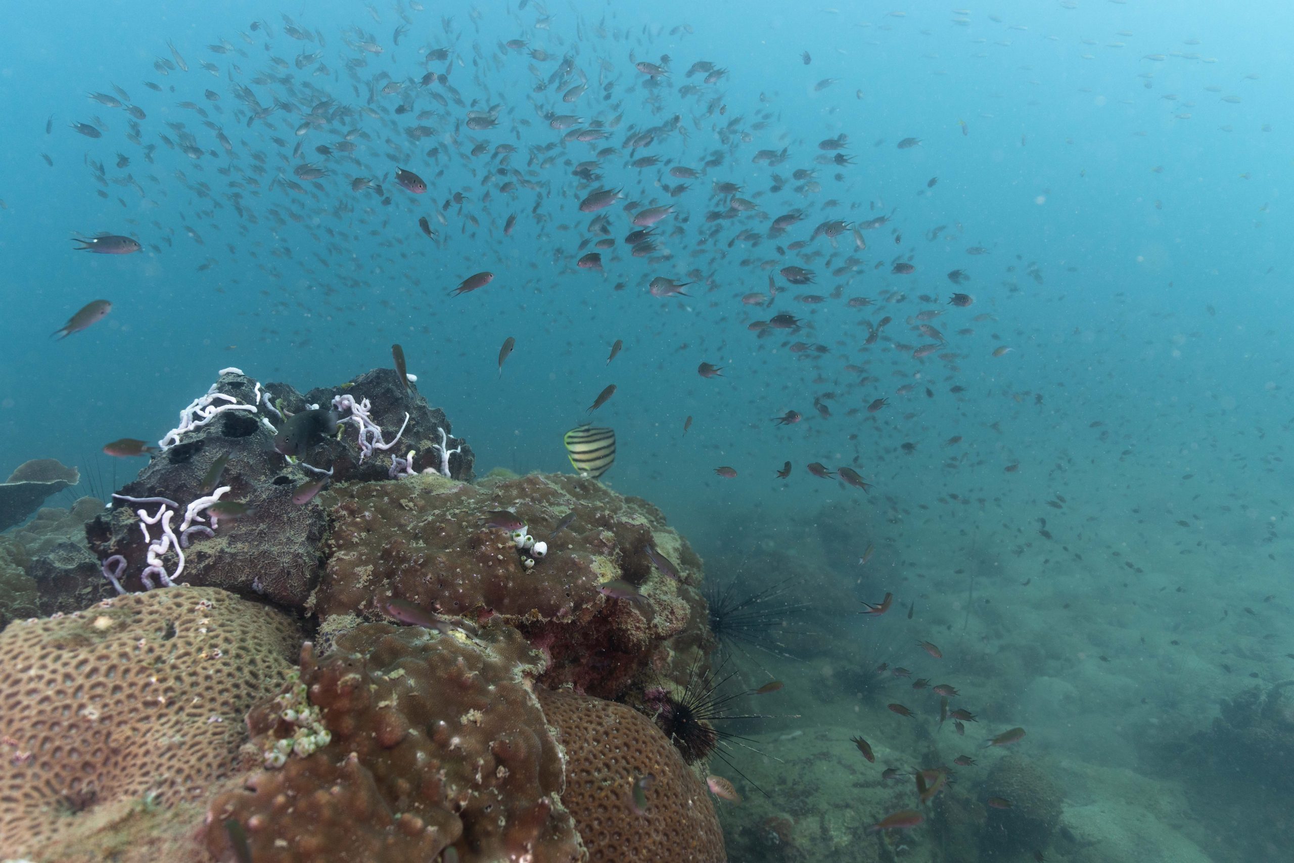 Die nächsten zwei Tage verbrachte ich auf dem Meer. Ich wollte tauchen – und war gespannt auf die hiesige Unterwasserwelt. Beim Sprung ins Meer war ich sofort von einem grauen Nebel umgeben. Das Wasser ist durch Schwebstoffe erstaunlich trüb. Man sieht nur wenige Meter weit. Das ist prinzipiell kein Problem, kann es doch bedeuten, dass das nahrhafte Wasser besonders viele Pflanzen und Tiere hervorbringt. Und so war es tatsächlich. Am Meeresgrund fand ich ein spannendes Biotop vor. Unzählige Schwämme, Korallen und verzweigte Wasserpflanzen bedeckten den Grund. Dazwischen lebten vor allem Seeigel, aber auch vielerlei Fische und Muscheln. Zwei Tage lang schwebte ich durch die schemenhafte Unterwasserwelt, aus der immer wieder bunte Fische auftauchten. Es war großartig!