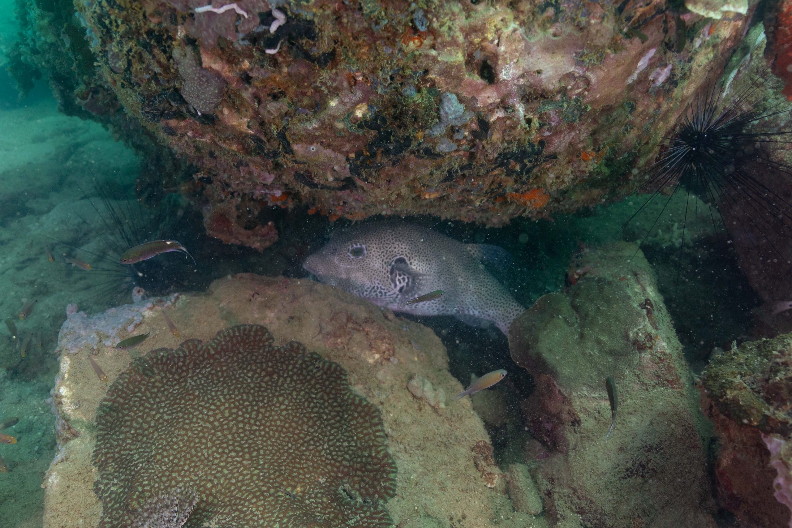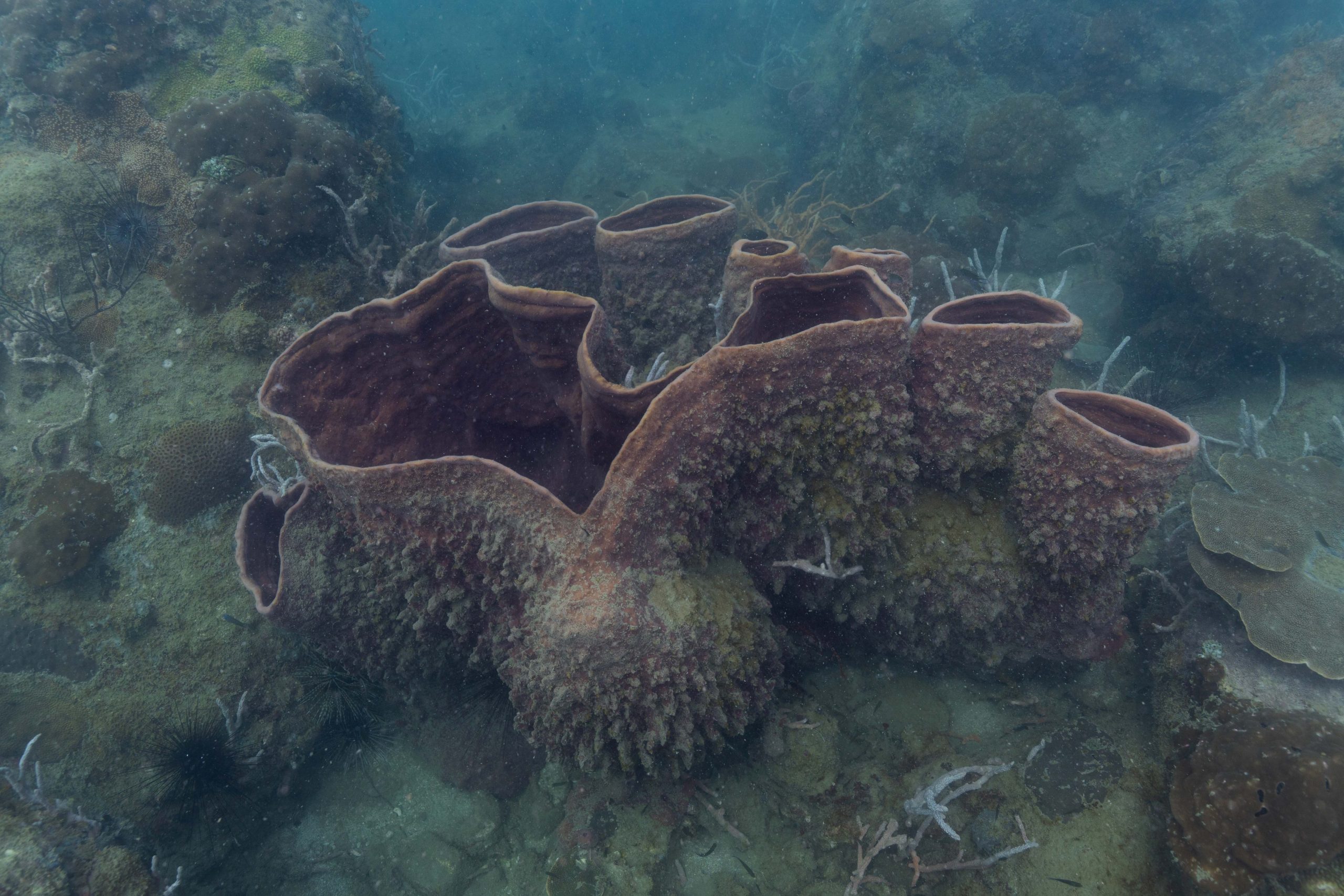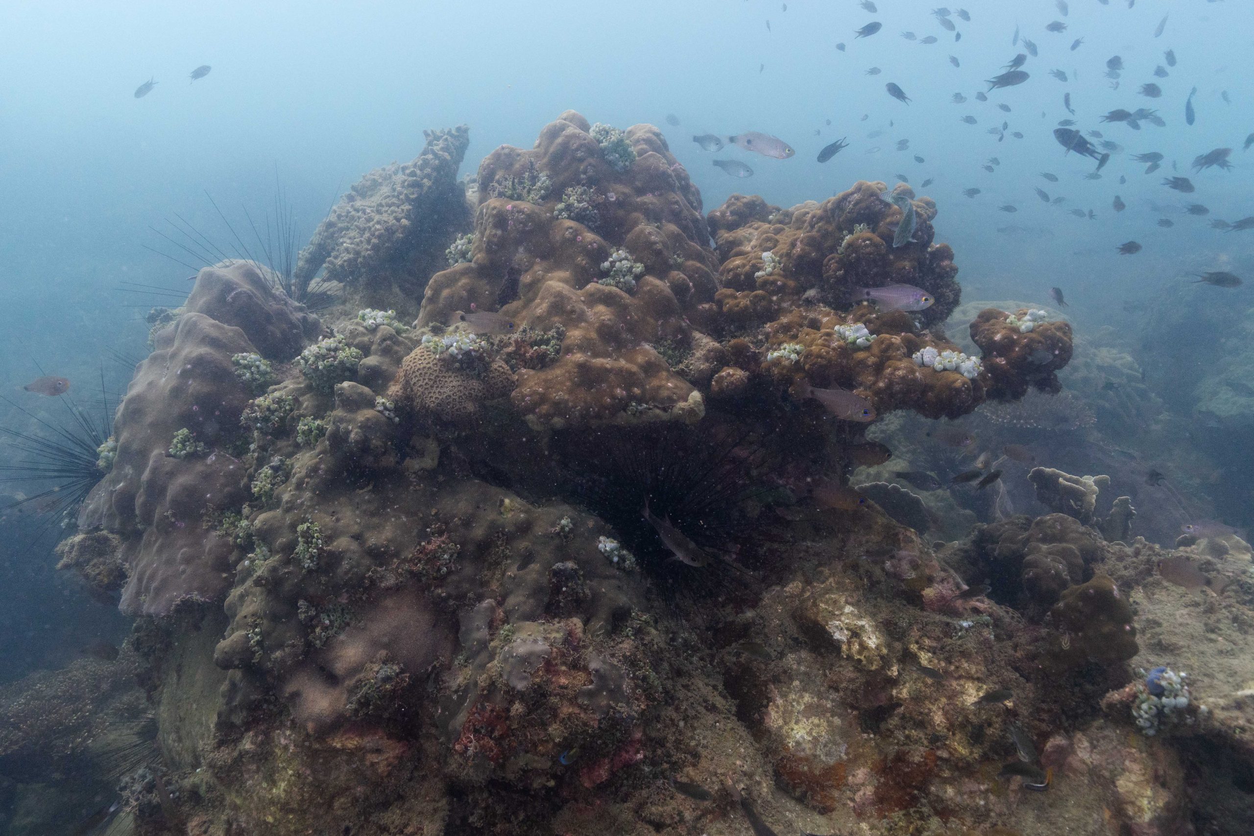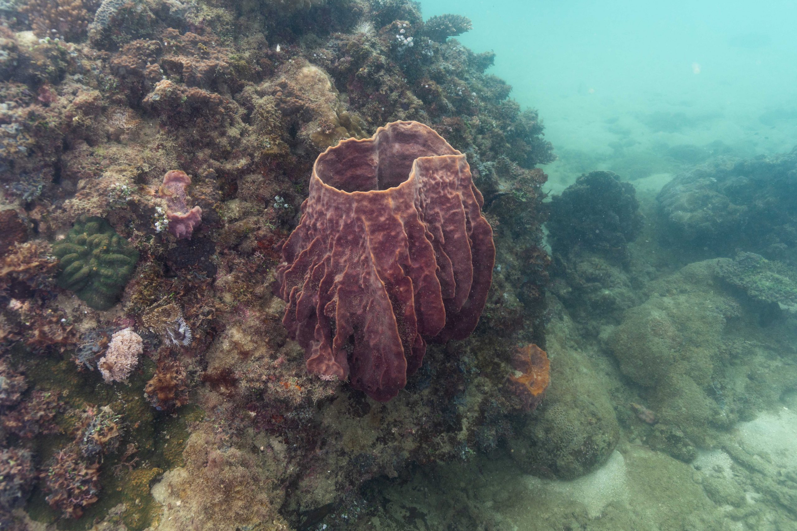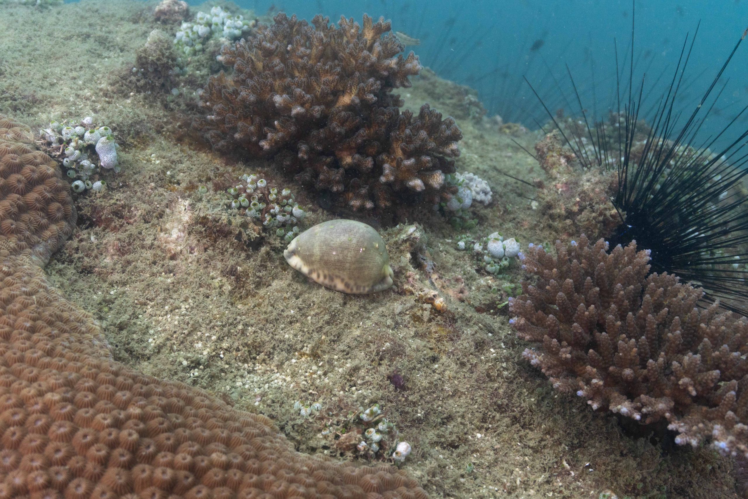 Die nächsten zwei Tage verbrachte ich auf dem Meer. Ich wollte tauchen – und war gespannt auf die hiesige Unterwasserwelt. Beim Sprung ins Meer war ich sofort von einem grauen Nebel umgeben. Das Wasser ist durch Schwebstoffe erstaunlich trüb. Man sieht nur wenige Meter weit. Das ist prinzipiell kein Problem, kann es doch bedeuten, dass das nahrhafte Wasser besonders viele Pflanzen und Tiere hervorbringt. Und so war es tatsächlich. Am Meeresgrund fand ich ein spannendes Biotop vor. Unzählige Schwämme, Korallen und verzweigte Wasserpflanzen bedeckten den Grund. Dazwischen lebten vor allem Seeigel, aber auch vielerlei Fische und Muscheln. Zwei Tage lang schwebte ich durch die schemenhafte Unterwasserwelt, aus der immer wieder bunte Fische auftauchten. Es war großartig!