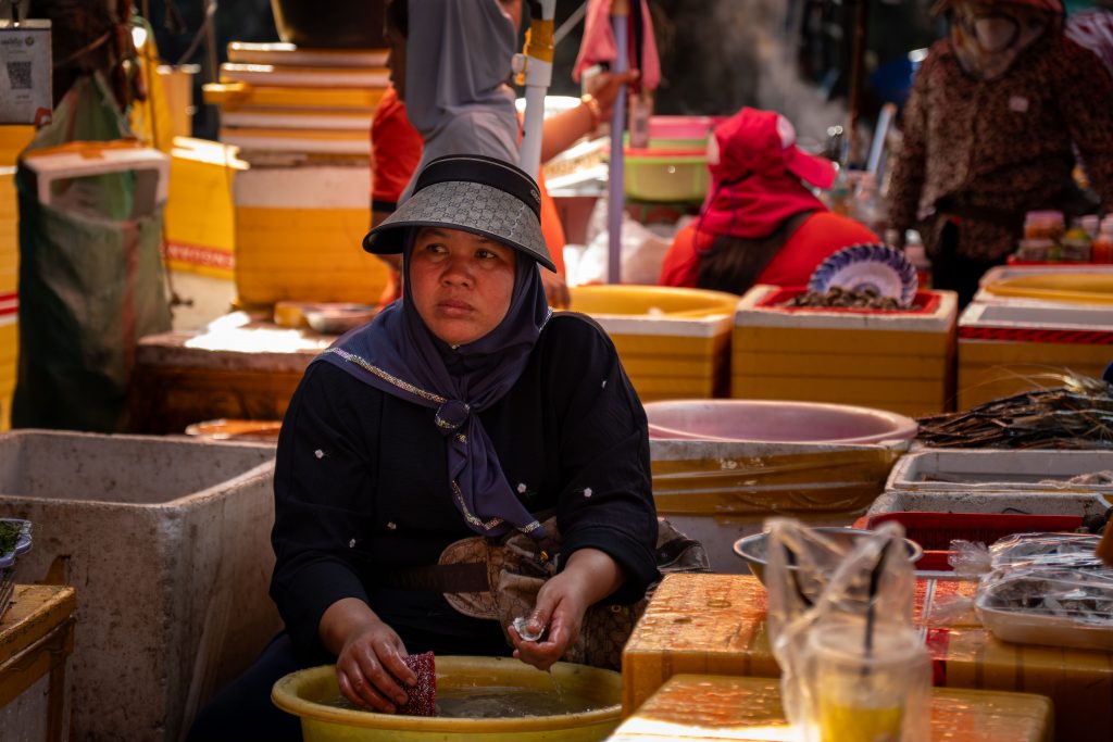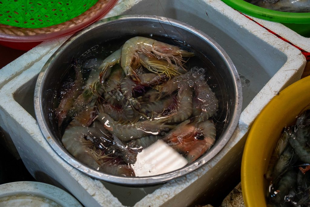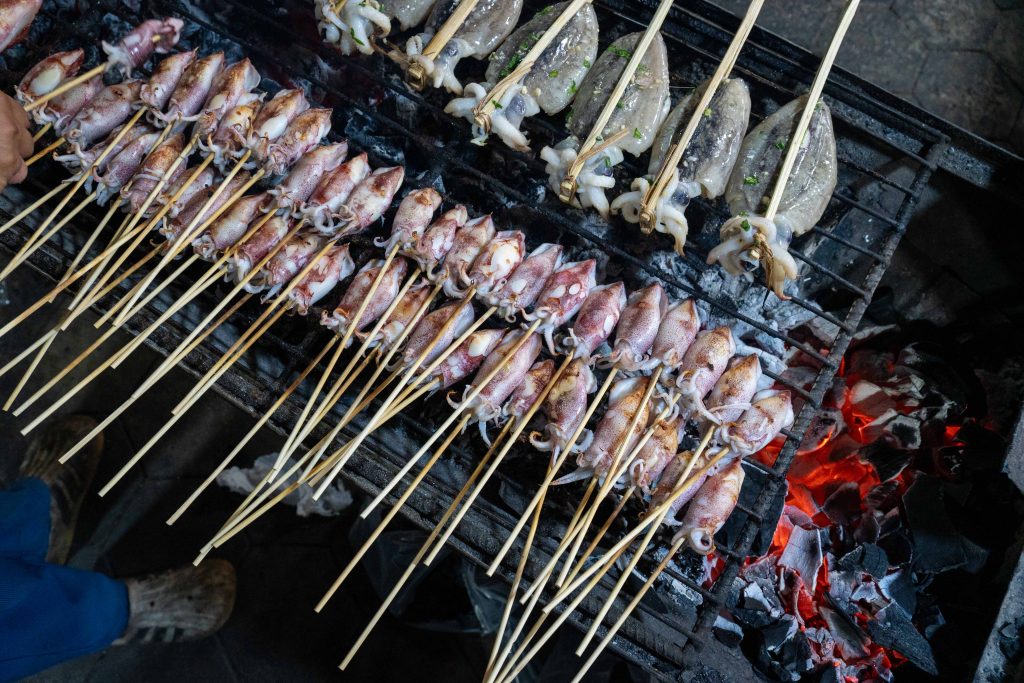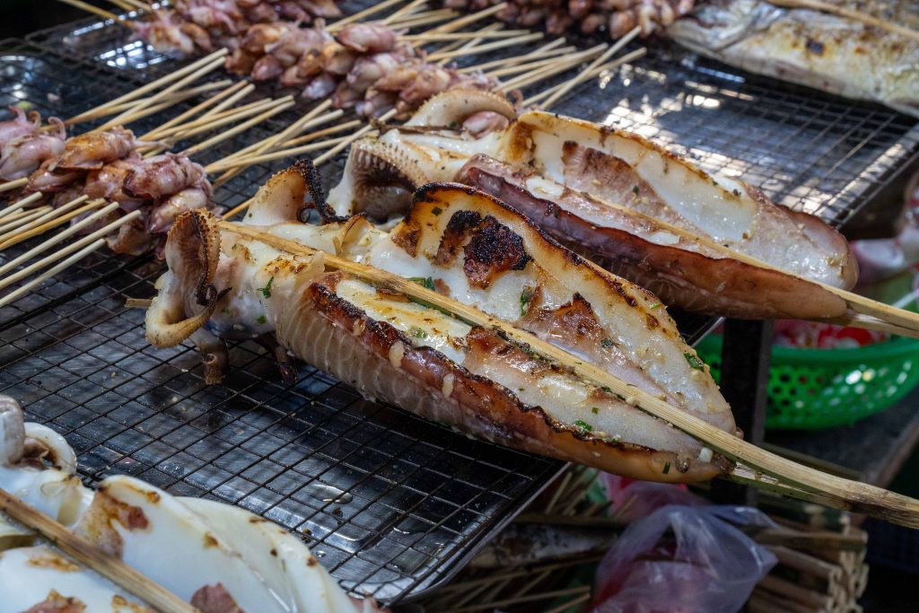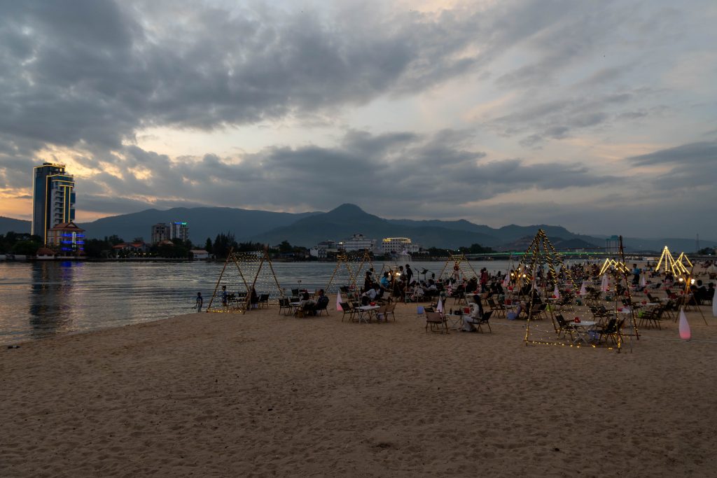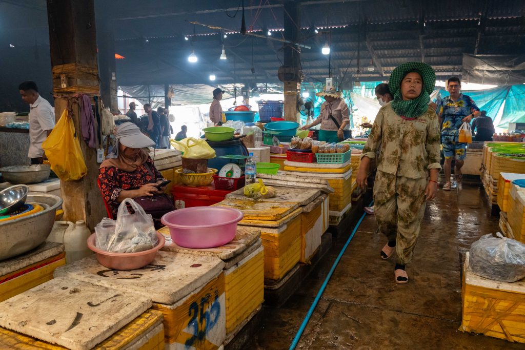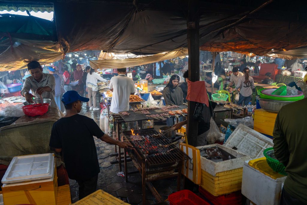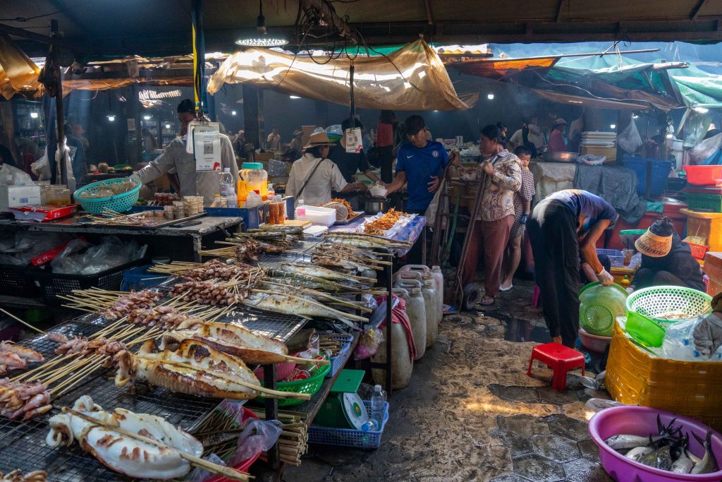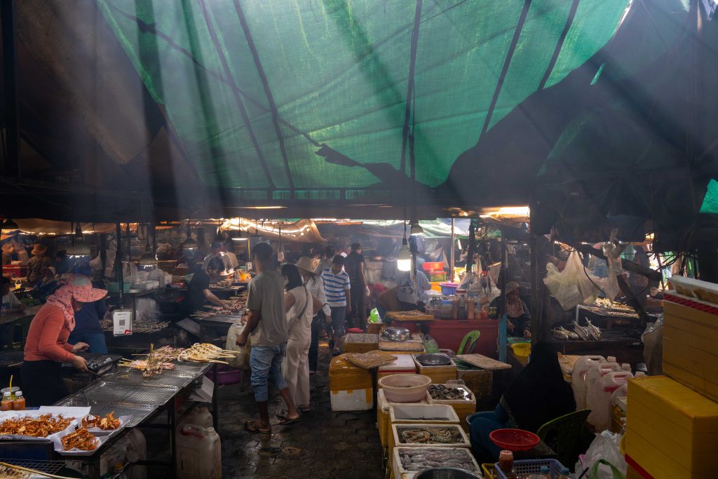 Ich erreichte Sihanoukville und nahm einen Bus nach Kampot, die letzte Station auf meiner Reise. Die kleine Stadt liegt an einem Fluss, und ganz in der Nähe befindet sich das Meer. Nun fühlte es sich schon nach Abschied an. Ich trauerte der Insel hinterher und machte mich widerwillig, aber pflichtbewusst auf den Weg, Kampot und Umgebung zu erkunden. Mit dem Motorroller fuhr ich nach Kep, einer kleinen Stadt in der Nähe. Dort gibt es einen Krabbenmarkt. Der begeisterte mich dann doch. Unter den bunten Dächern von Schirmen und Zelten reihten sich die Stände der Verkäufer aneinander. Auf Tischen und Kisten stapelten sich Krebse und Fische. Die konnte man kaufen und auch direkt vor Ort zubereiten lassen. Der Markt war völlig vernebelt vom Rauch der Grills.