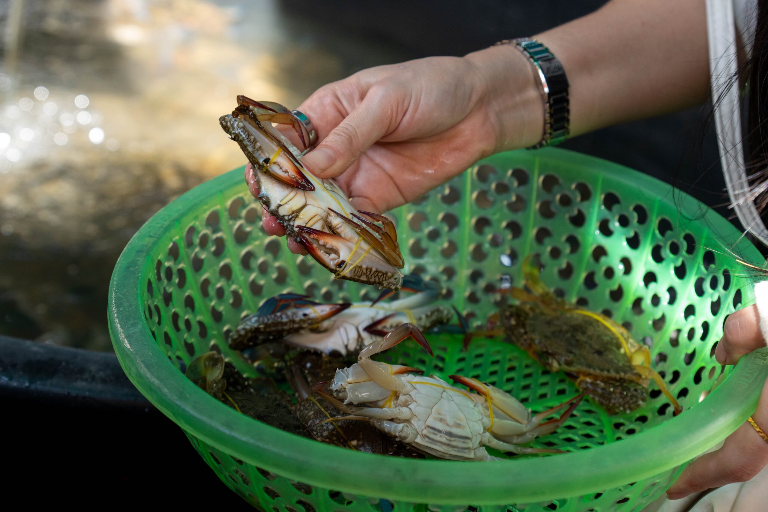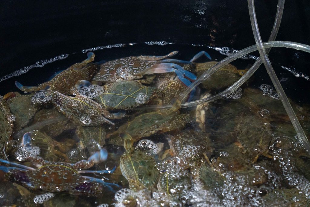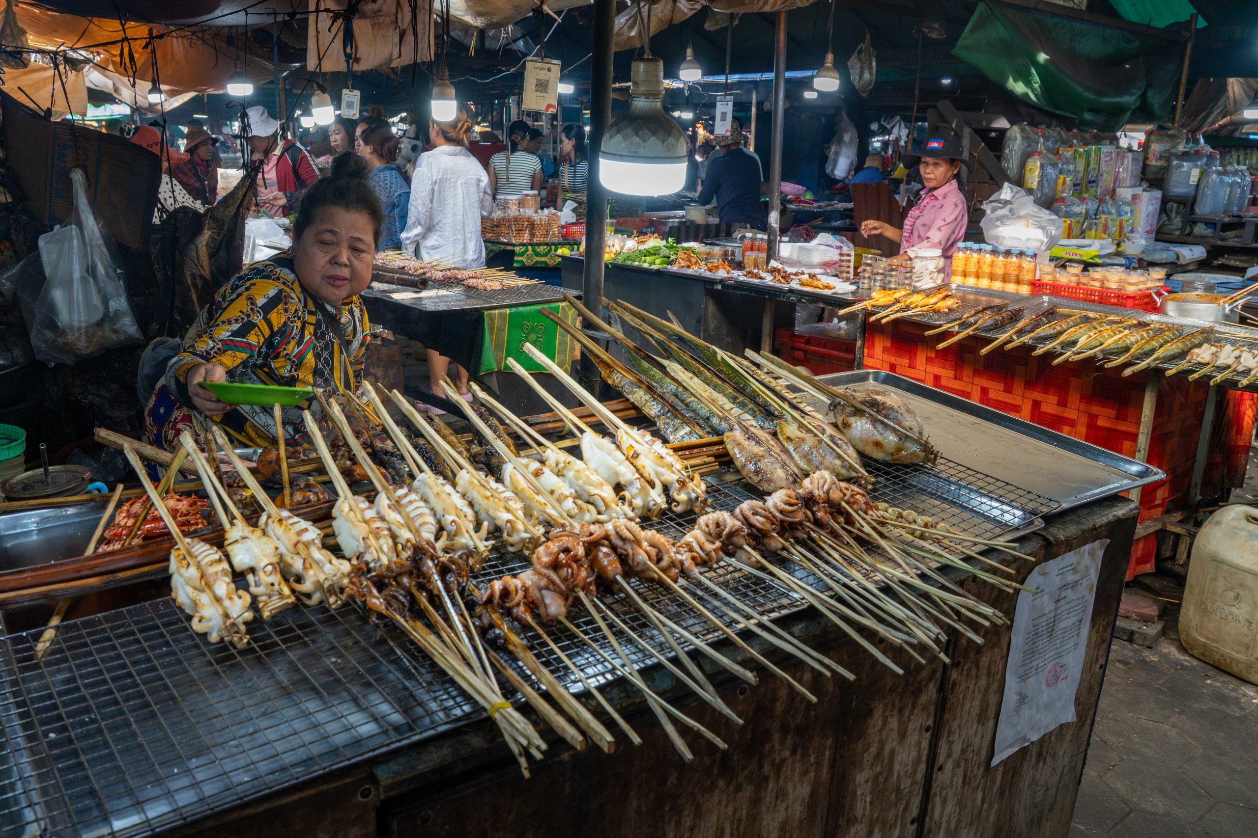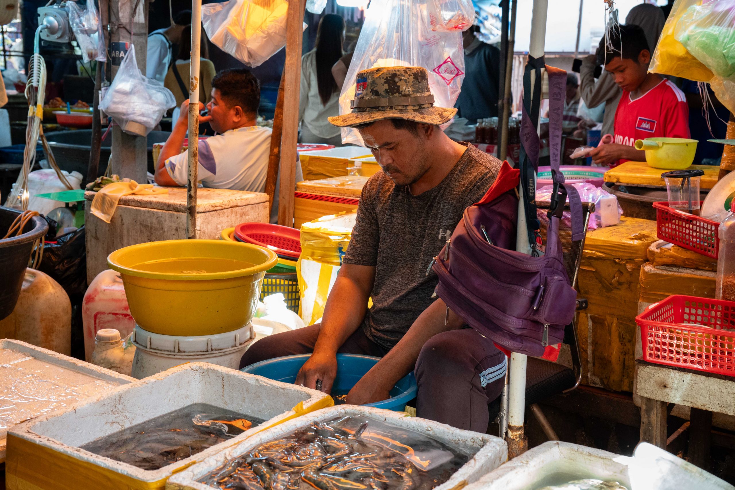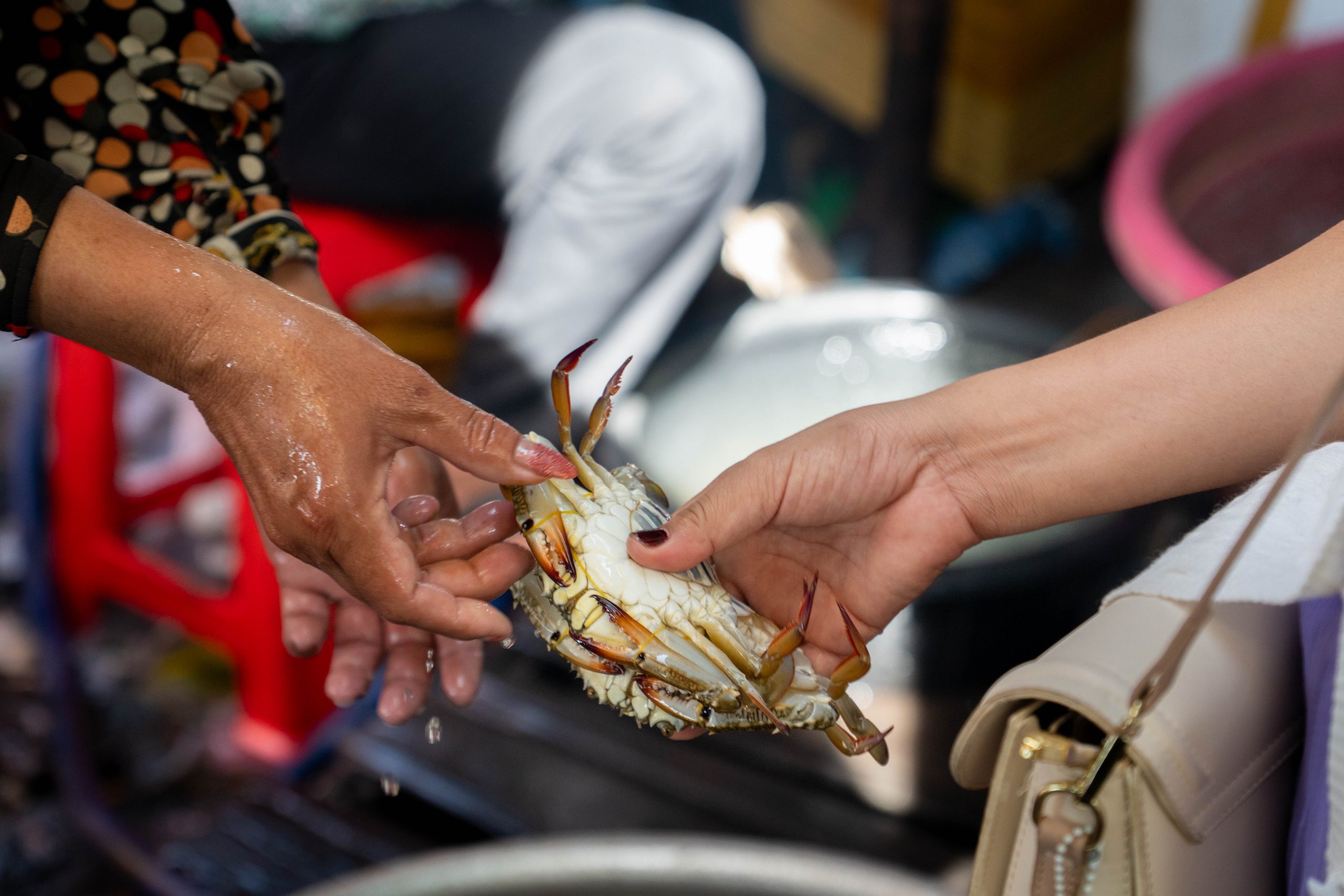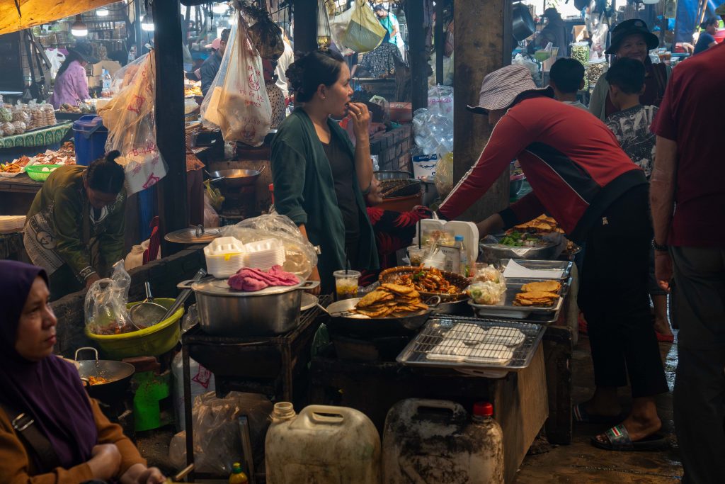 Ich erreichte Sihanoukville und nahm einen Bus nach Kampot, die letzte Station auf meiner Reise. Die kleine Stadt liegt an einem Fluss, und ganz in der Nähe befindet sich das Meer. Nun fühlte es sich schon nach Abschied an. Ich trauerte der Insel hinterher und machte mich widerwillig, aber pflichtbewusst auf den Weg, Kampot und Umgebung zu erkunden. Mit dem Motorroller fuhr ich nach Kep, einer kleinen Stadt in der Nähe. Dort gibt es einen Krabbenmarkt. Der begeisterte mich dann doch. Unter den bunten Dächern von Schirmen und Zelten reihten sich die Stände der Verkäufer aneinander. Auf Tischen und Kisten stapelten sich Krebse und Fische. Die konnte man kaufen und auch direkt vor Ort zubereiten lassen. Der Markt war völlig vernebelt vom Rauch der Grills.
