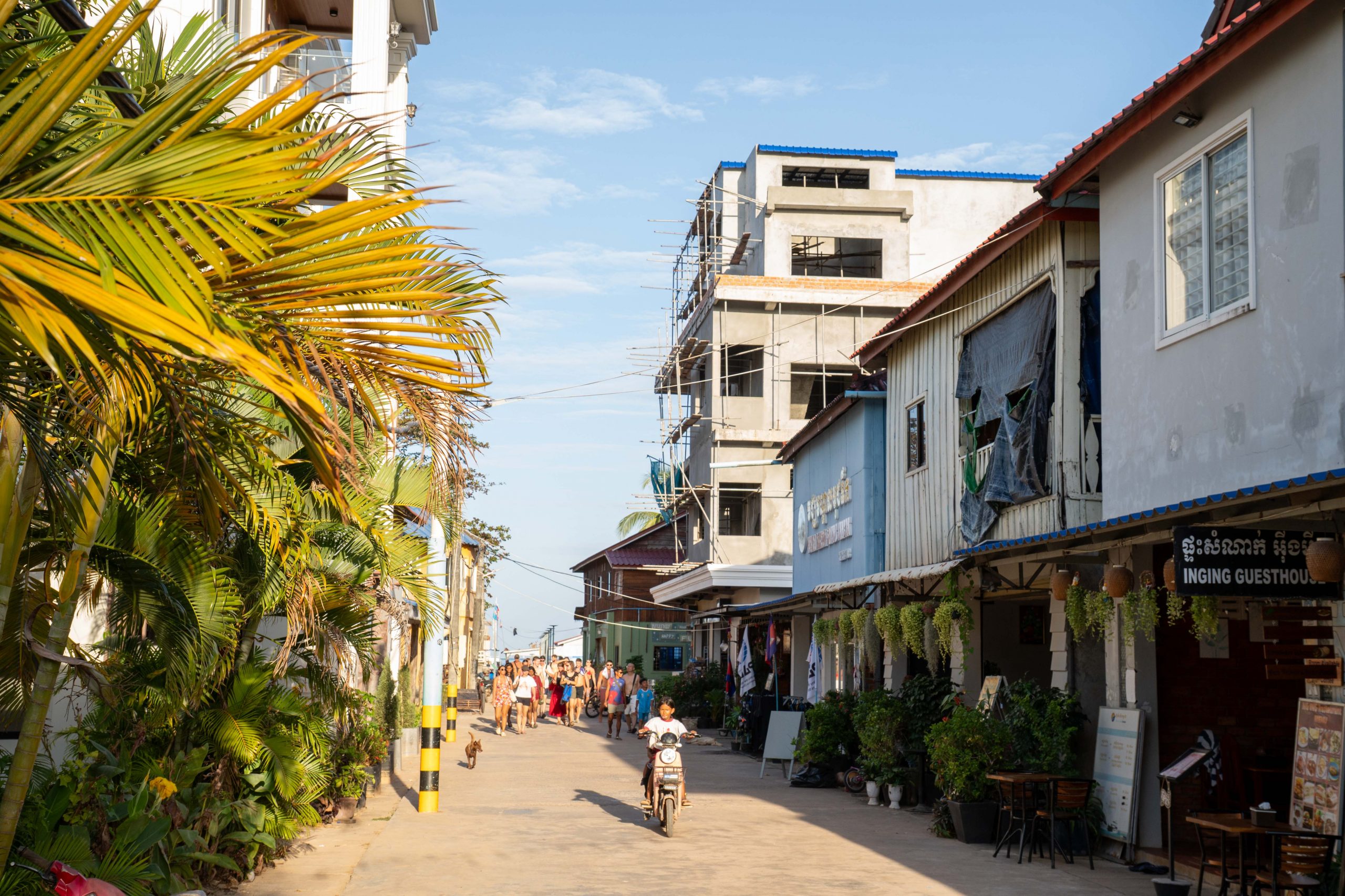 Abschließend besuchte ich den Bokor-Hill-Nationalpark. Es ist ein dichter Wald auf einem Felsenplateau. Rund eine Stunde lang quälte ich mein Moped die steilen Serpentinen hinauf. Oben finden sich die Überreste einer französischen Siedlung, in den 1920er Jahren errichtet. Die Kolonialmächte nutzten den Berg für eine Ferienanlage. Die kleine Geisterstadt ist gut besucht. Familien kommen zum Picknick. Und junge Liebespaare spazieren schüchtern über das Gelände, verborgen vor den strengen Augen ihrer Eltern.