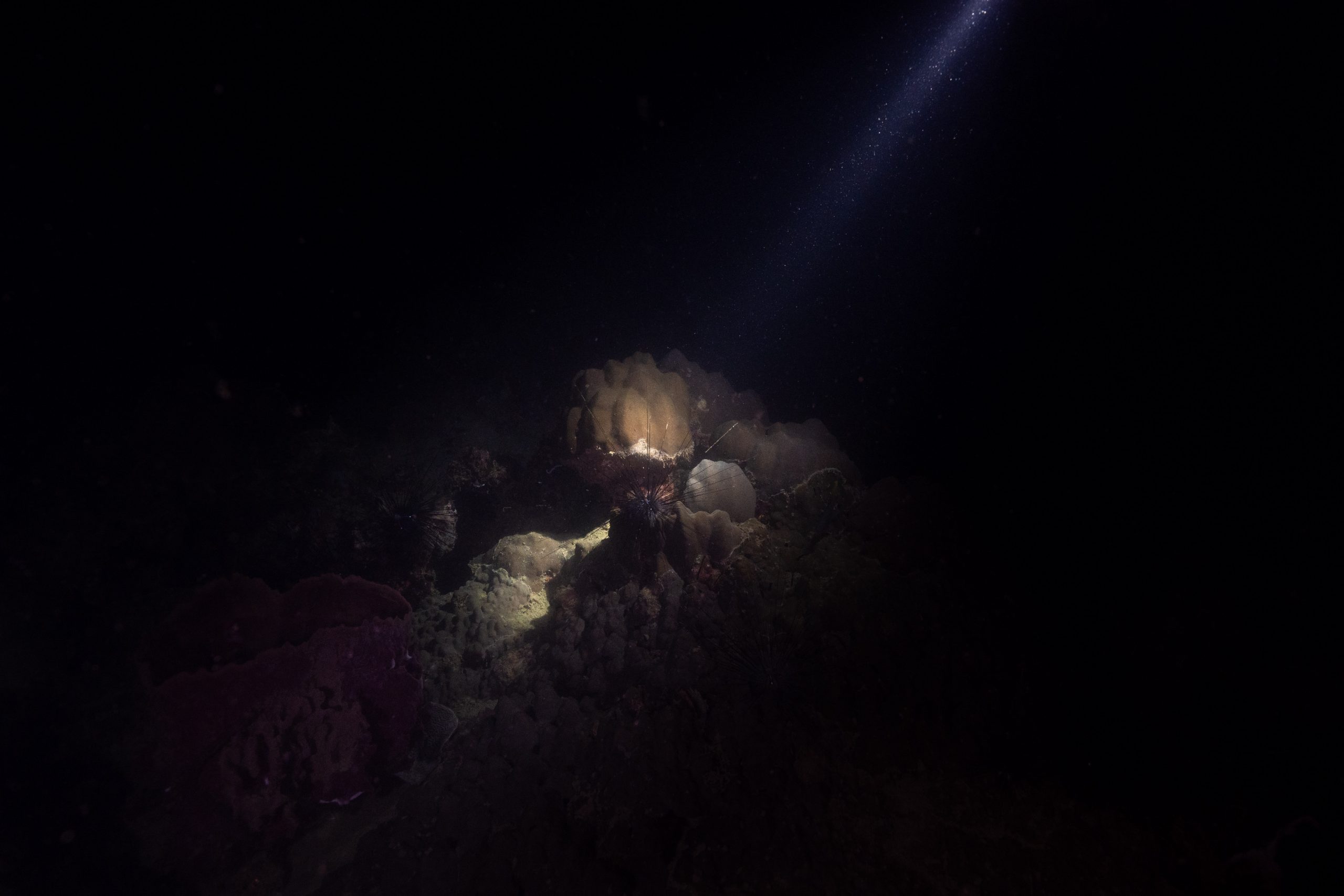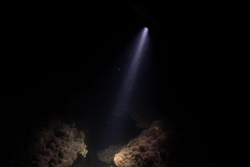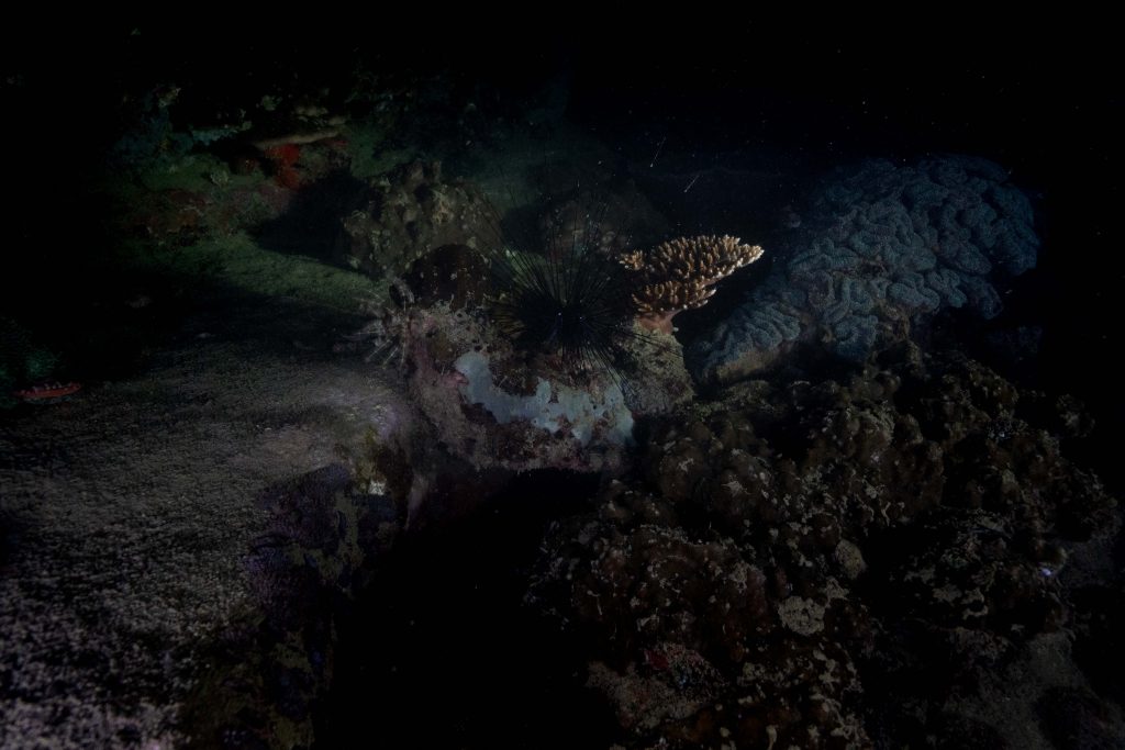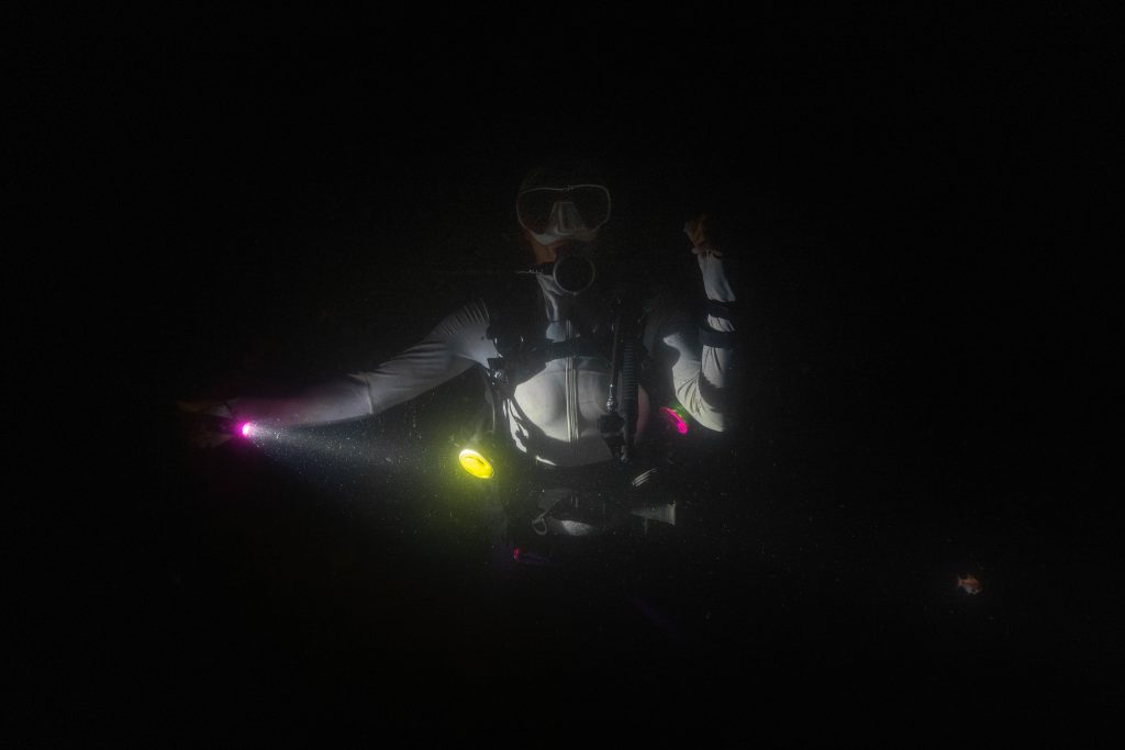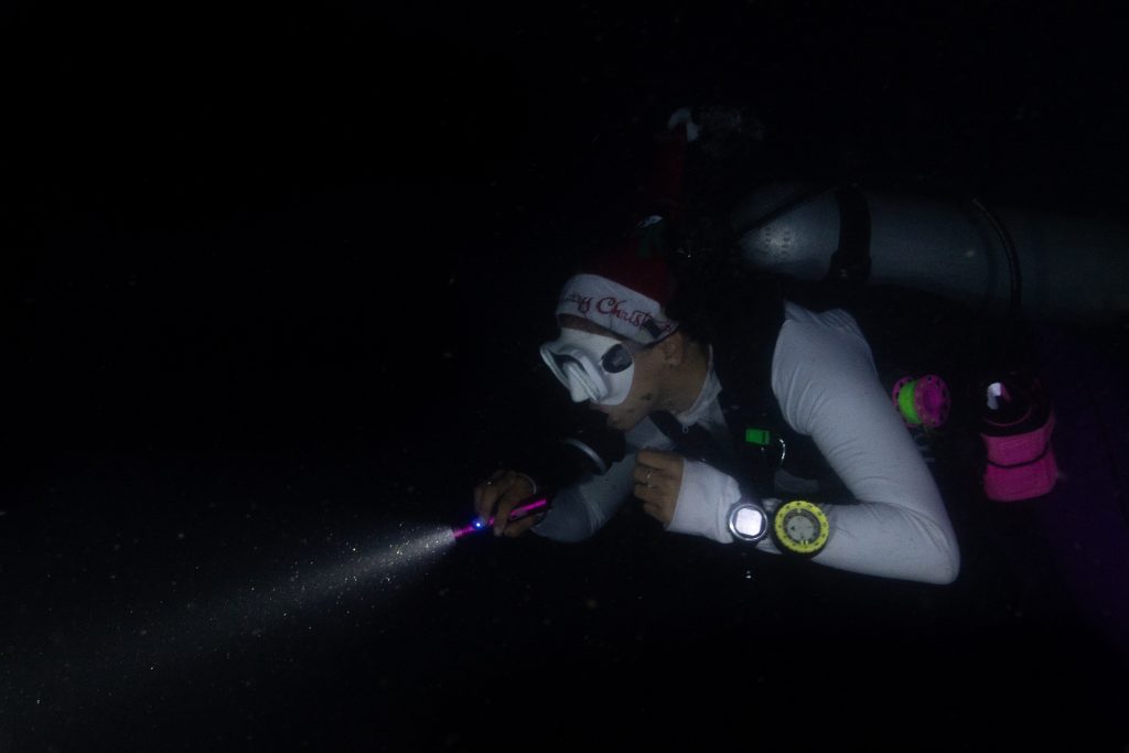 Am ersten Tauchtag wagte ich ein zusätzliches Abenteuer. Es war der Heilige Abend, doch weit weg von zu Hause hatte ich für Weihnachten ohnehin keine Pläne. Ähnlich ging es meiner Tauchlehrerin, die aus Mexiko kam. Also entschieden wir, in der Nacht noch einmal die Unterwasserwelt zu besuchen. Der hölzerne Kutter brachte uns hinaus aufs Meer, bis wir die Lichter des Ortes nur noch in der Ferne glimmen sahen. Mit Taschenlampen ausgerüstet sprangen wir vom Boot – und waren sofort von pechschwarzer Dunkelheit umgeben. Unter Wasser scheinen die Lampen nur wenige Meter weit, bevor sich der Lichtstrahl verliert. Manchmal glitzern Schwebstoffe im Licht, oder ein Fisch verirrt sich in den Schein. Ansonsten waren wir in Schwarz gehüllt, während wir ins Meer hinabsanken. Der Computer am Handgelenk misst die Tiefe. Nach etwa zehn Metern tauchte unter uns der Grund auf. Nun konnte der Lichterschein die Silhouetten des schlafenden Riffs ertasten. Wir tauchten eine Stunde lang durch eine stille, finstere und friedliche Welt. Ich glaube, der Reiz des nächtlichen Tauchens liegt genau in dieser Dunkelheit. Als wir eine Sandbank fanden, ließen wir uns auf den Boden sinken und schalteten die Lichter aus. In Finsternis gehüllt, hörten wir nur die dumpfen Geräusche der Unterwasserwelt. Wir begannen mit den Armen zu rudern und ringsumher erglommen winzige Lichter. Rund um Koh Rong Sanloem lebt biolumineszierendes Plankton. Bewegungen im Wasser bringen es zum Leuchten. Wir setzten unseren Tauchgang fort. Ich muss zugeben, in der Dunkelheit hatte ich ein wenig Mühe, die Kamera zu bedienen, das Licht einzustellen und gleichzeitig meine Tauchpartnerin nicht zu verlieren. Doch am Ende war ich froh, dass es mir gelungen war, einige Bilder aufzunehmen.