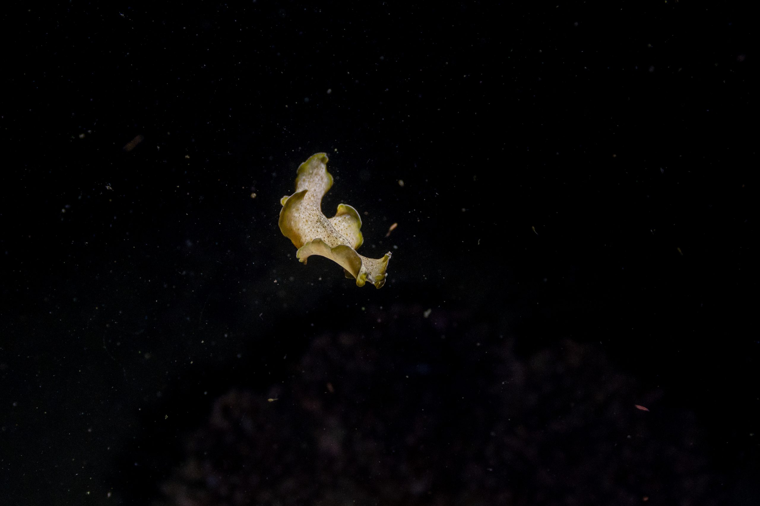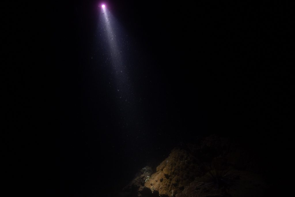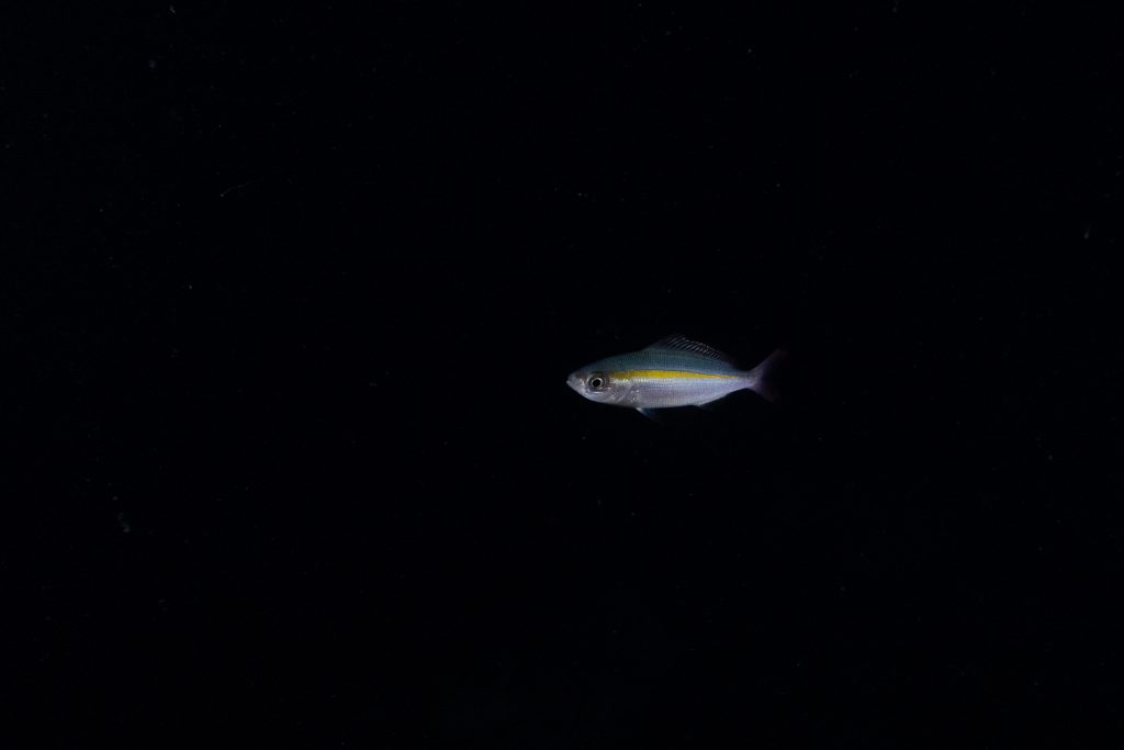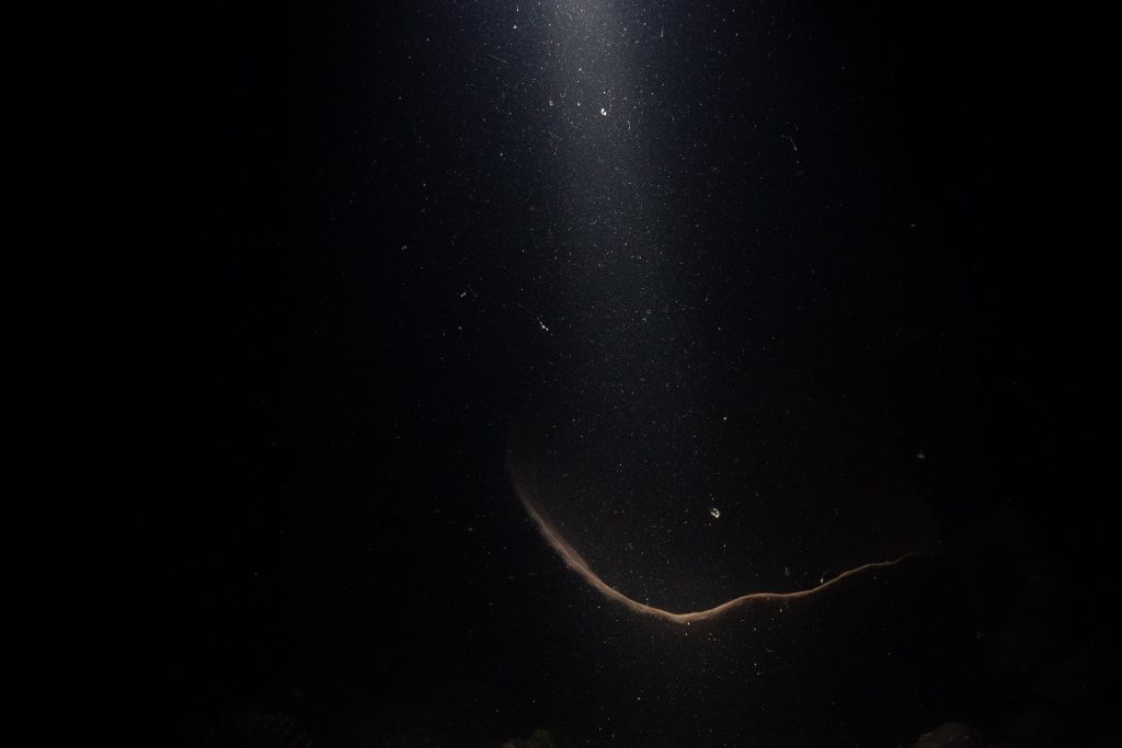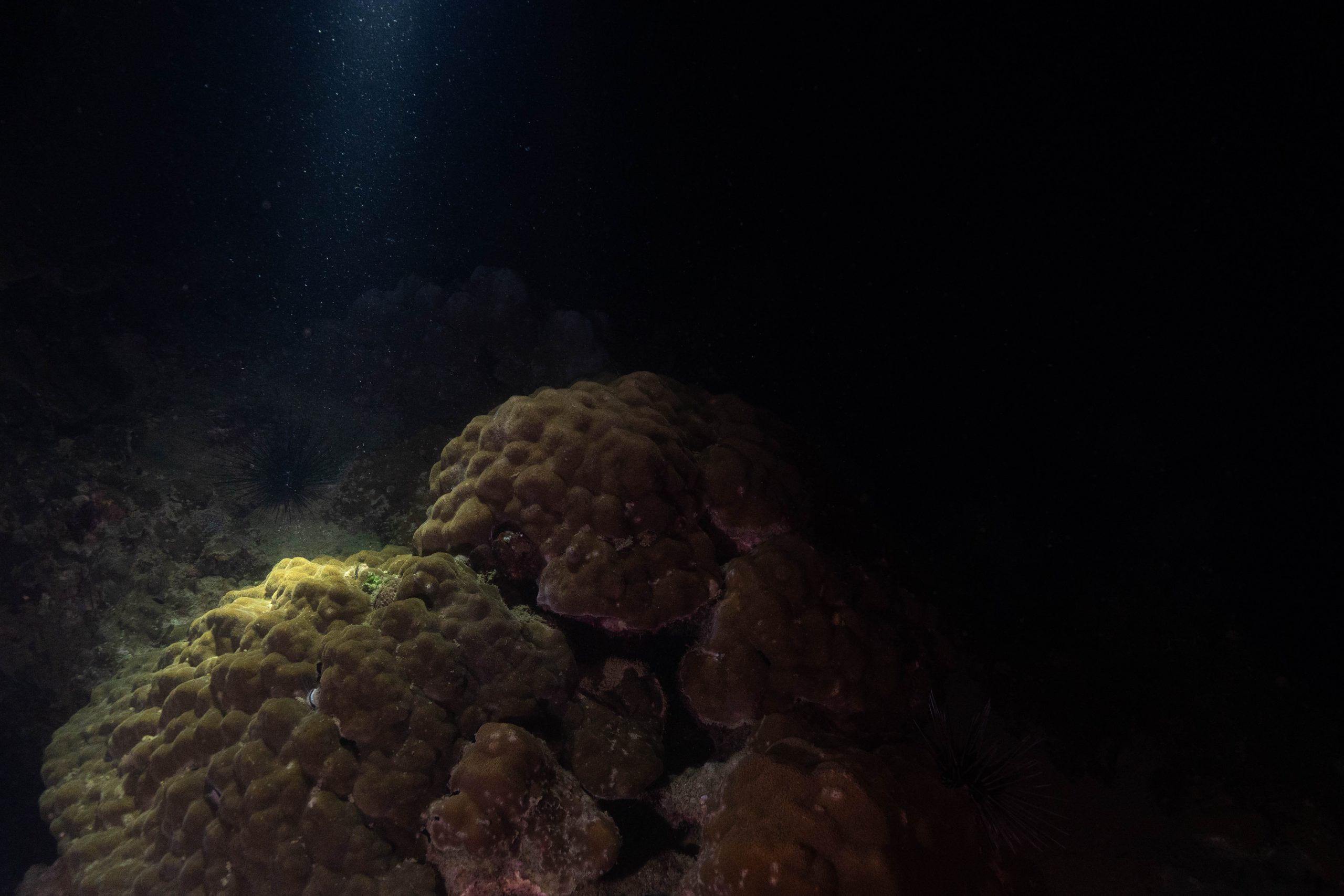 Am ersten Tauchtag wagte ich ein zusätzliches Abenteuer. Es war der Heilige Abend, doch weit weg von zu Hause hatte ich für Weihnachten ohnehin keine Pläne. Ähnlich ging es meiner Tauchlehrerin, die aus Mexiko kam. Also entschieden wir, in der Nacht noch einmal die Unterwasserwelt zu besuchen. Der hölzerne Kutter brachte uns hinaus aufs Meer, bis wir die Lichter des Ortes nur noch in der Ferne glimmen sahen. Mit Taschenlampen ausgerüstet sprangen wir vom Boot – und waren sofort von pechschwarzer Dunkelheit umgeben. Unter Wasser scheinen die Lampen nur wenige Meter weit, bevor sich der Lichtstrahl verliert. Manchmal glitzern Schwebstoffe im Licht, oder ein Fisch verirrt sich in den Schein. Ansonsten waren wir in Schwarz gehüllt, während wir ins Meer hinabsanken. Der Computer am Handgelenk misst die Tiefe. Nach etwa zehn Metern tauchte unter uns der Grund auf. Nun konnte der Lichterschein die Silhouetten des schlafenden Riffs ertasten. Wir tauchten eine Stunde lang durch eine stille, finstere und friedliche Welt. Ich glaube, der Reiz des nächtlichen Tauchens liegt genau in dieser Dunkelheit. Als wir eine Sandbank fanden, ließen wir uns auf den Boden sinken und schalteten die Lichter aus. In Finsternis gehüllt, hörten wir nur die dumpfen Geräusche der Unterwasserwelt. Wir begannen mit den Armen zu rudern und ringsumher erglommen winzige Lichter. Rund um Koh Rong Sanloem lebt biolumineszierendes Plankton. Bewegungen im Wasser bringen es zum Leuchten. Wir setzten unseren Tauchgang fort. Ich muss zugeben, in der Dunkelheit hatte ich ein wenig Mühe, die Kamera zu bedienen, das Licht einzustellen und gleichzeitig meine Tauchpartnerin nicht zu verlieren. Doch am Ende war ich froh, dass es mir gelungen war, einige Bilder aufzunehmen.