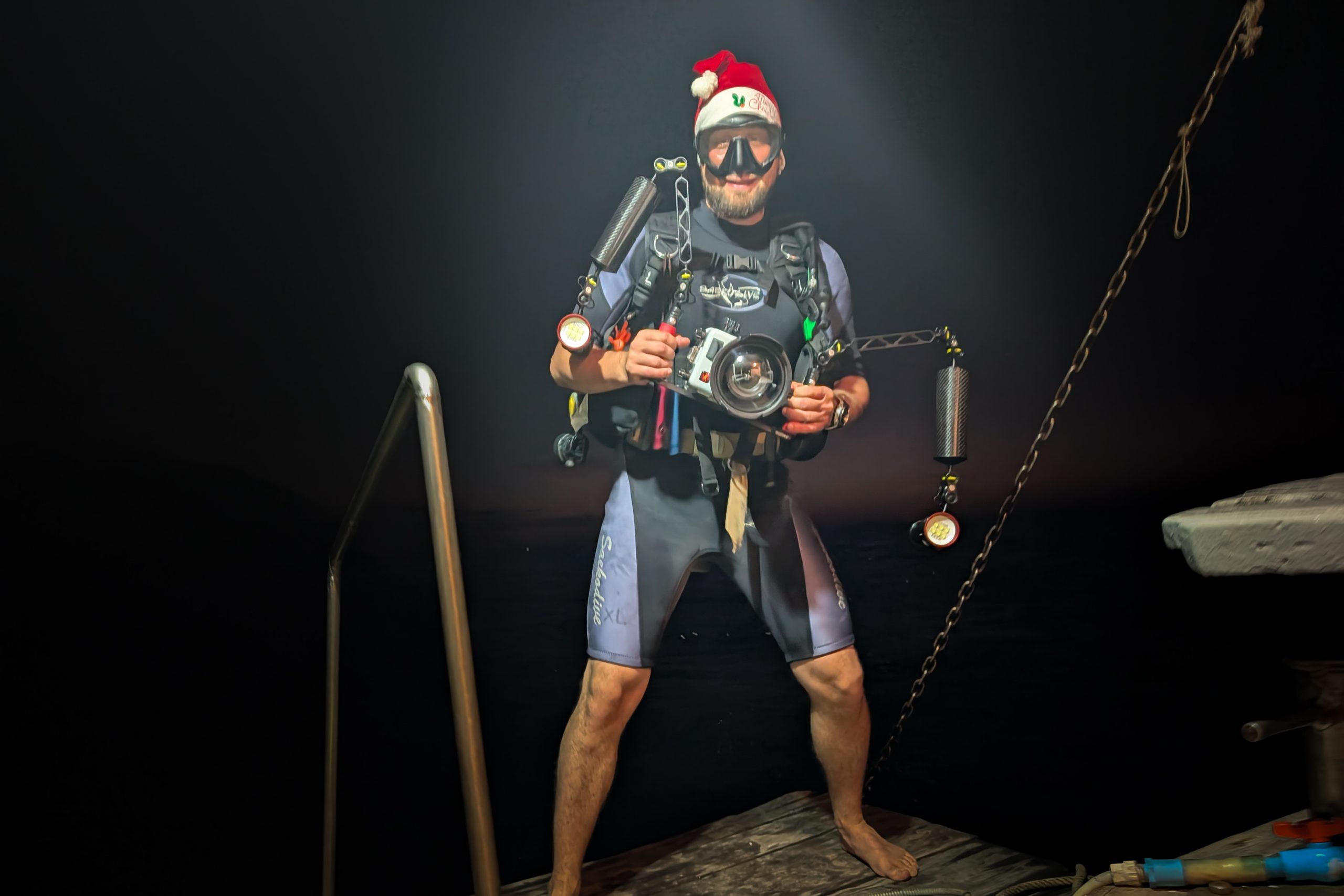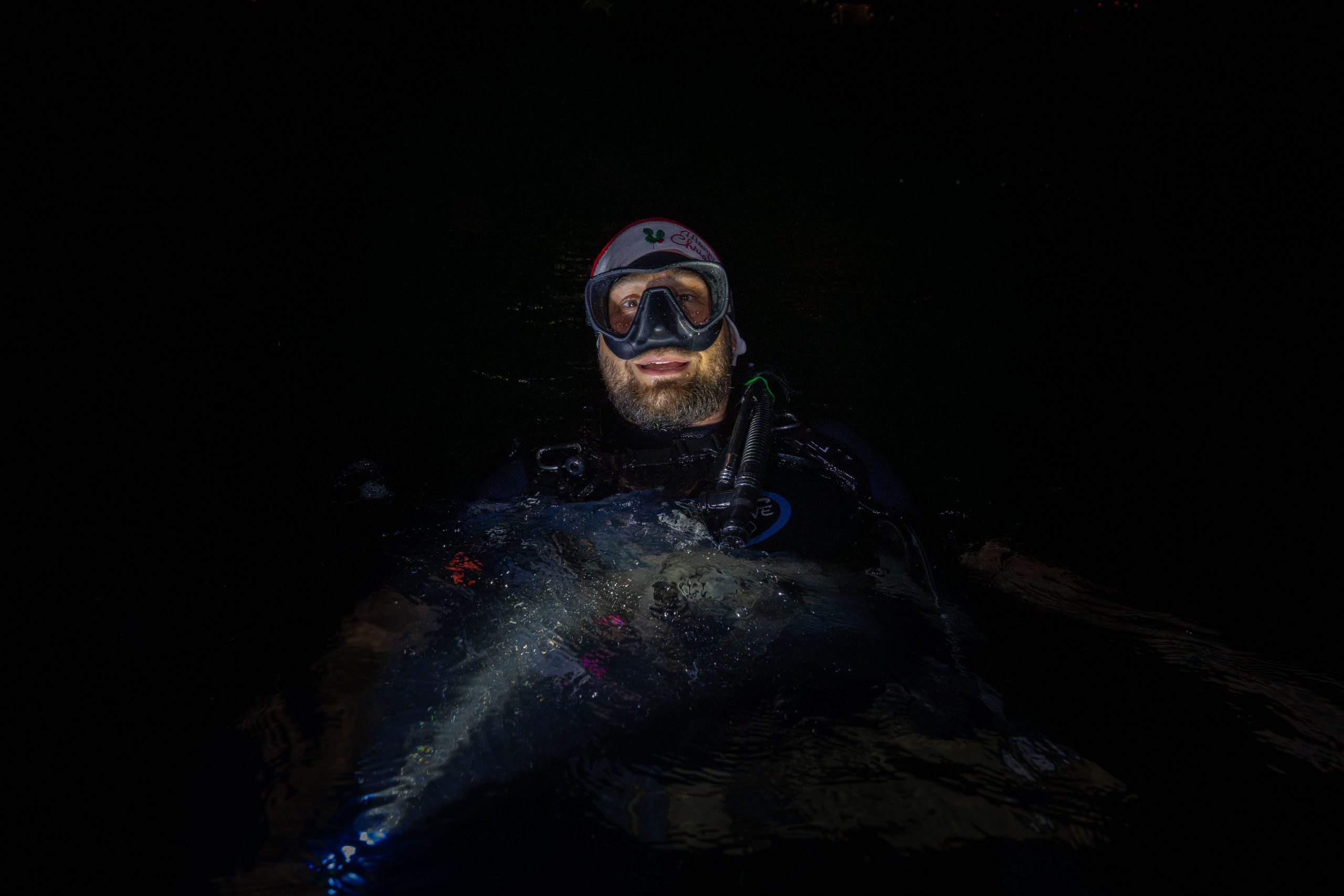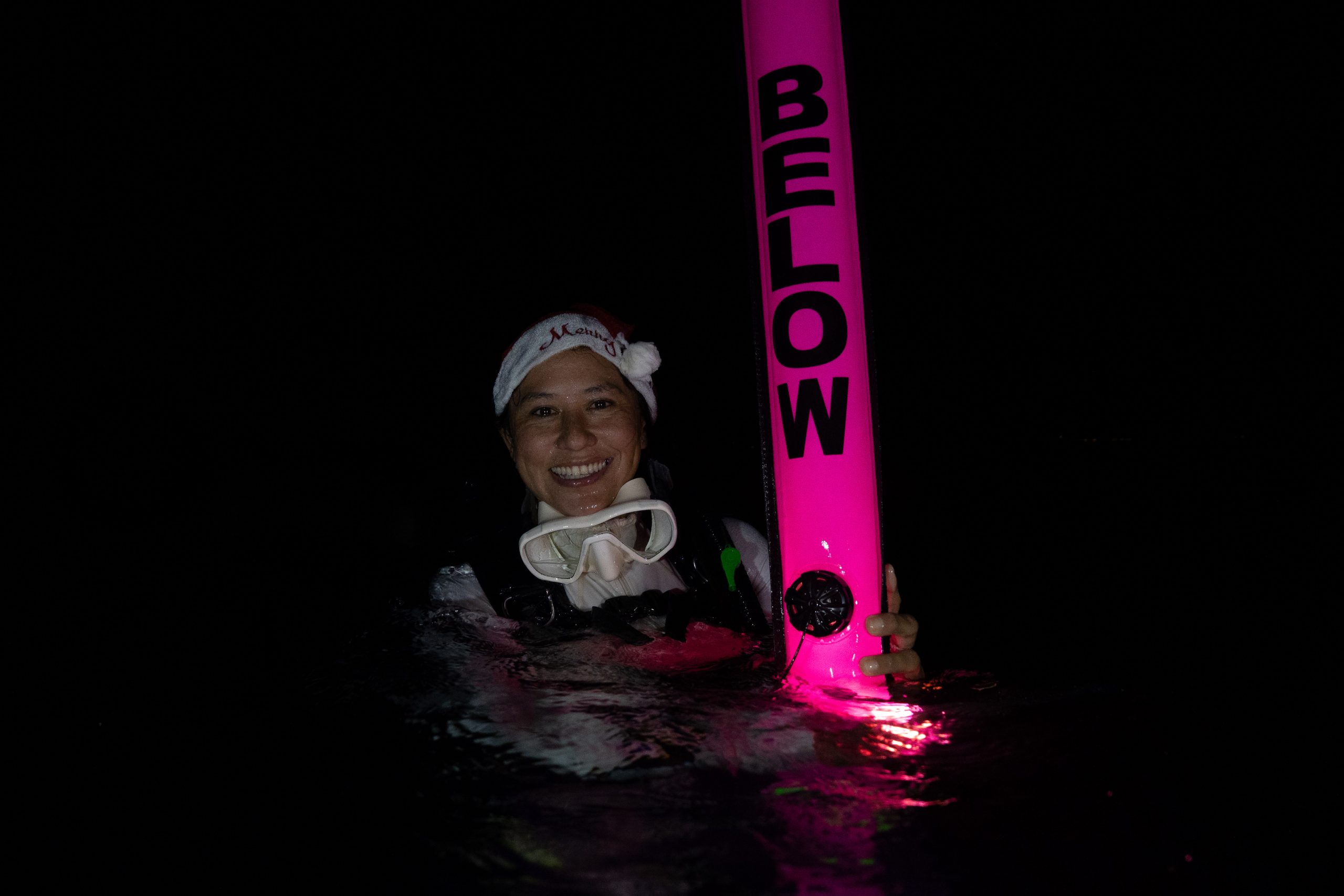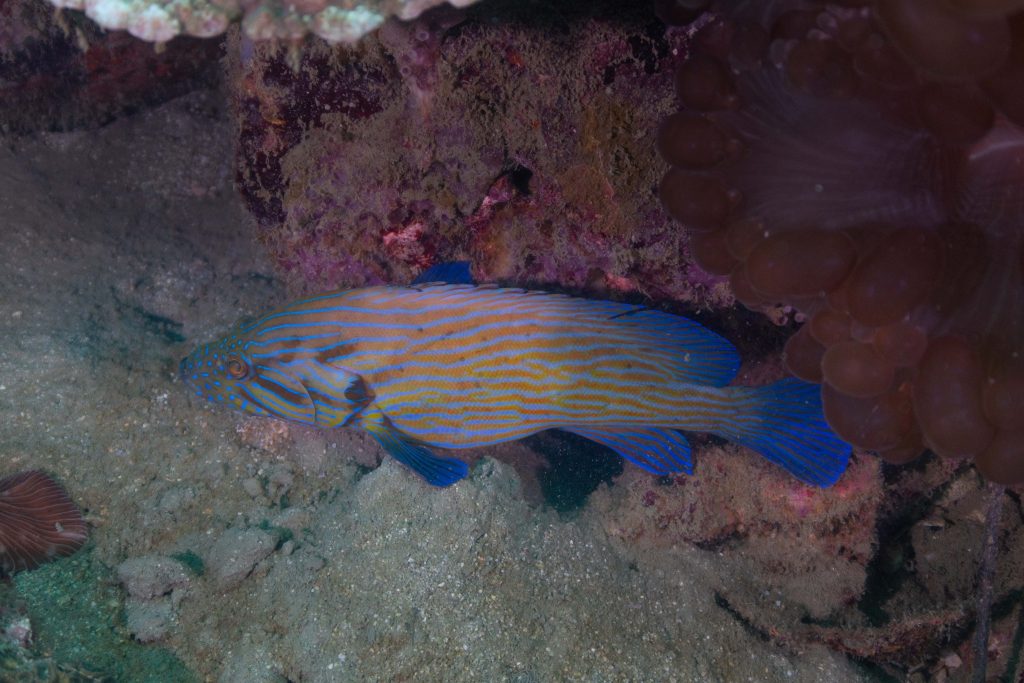 Am ersten Tauchtag wagte ich ein zusätzliches Abenteuer. Es war der Heilige Abend, doch weit weg von zu Hause hatte ich für Weihnachten ohnehin keine Pläne. Ähnlich ging es meiner Tauchlehrerin, die aus Mexiko kam. Also entschieden wir, in der Nacht noch einmal die Unterwasserwelt zu besuchen. Der hölzerne Kutter brachte uns hinaus aufs Meer, bis wir die Lichter des Ortes nur noch in der Ferne glimmen sahen. Mit Taschenlampen ausgerüstet sprangen wir vom Boot – und waren sofort von pechschwarzer Dunkelheit umgeben. Unter Wasser scheinen die Lampen nur wenige Meter weit, bevor sich der Lichtstrahl verliert. Manchmal glitzern Schwebstoffe im Licht, oder ein Fisch verirrt sich in den Schein. Ansonsten waren wir in Schwarz gehüllt, während wir ins Meer hinabsanken. Der Computer am Handgelenk misst die Tiefe. Nach etwa zehn Metern tauchte unter uns der Grund auf. Nun konnte der Lichterschein die Silhouetten des schlafenden Riffs ertasten. Wir tauchten eine Stunde lang durch eine stille, finstere und friedliche Welt. Ich glaube, der Reiz des nächtlichen Tauchens liegt genau in dieser Dunkelheit. Als wir eine Sandbank fanden, ließen wir uns auf den Boden sinken und schalteten die Lichter aus. In Finsternis gehüllt, hörten wir nur die dumpfen Geräusche der Unterwasserwelt. Wir begannen mit den Armen zu rudern und ringsumher erglommen winzige Lichter. Rund um Koh Rong Sanloem lebt biolumineszierendes Plankton. Bewegungen im Wasser bringen es zum Leuchten. Wir setzten unseren Tauchgang fort. Ich muss zugeben, in der Dunkelheit hatte ich ein wenig Mühe, die Kamera zu bedienen, das Licht einzustellen und gleichzeitig meine Tauchpartnerin nicht zu verlieren. Doch am Ende war ich froh, dass es mir gelungen war, einige Bilder aufzunehmen.